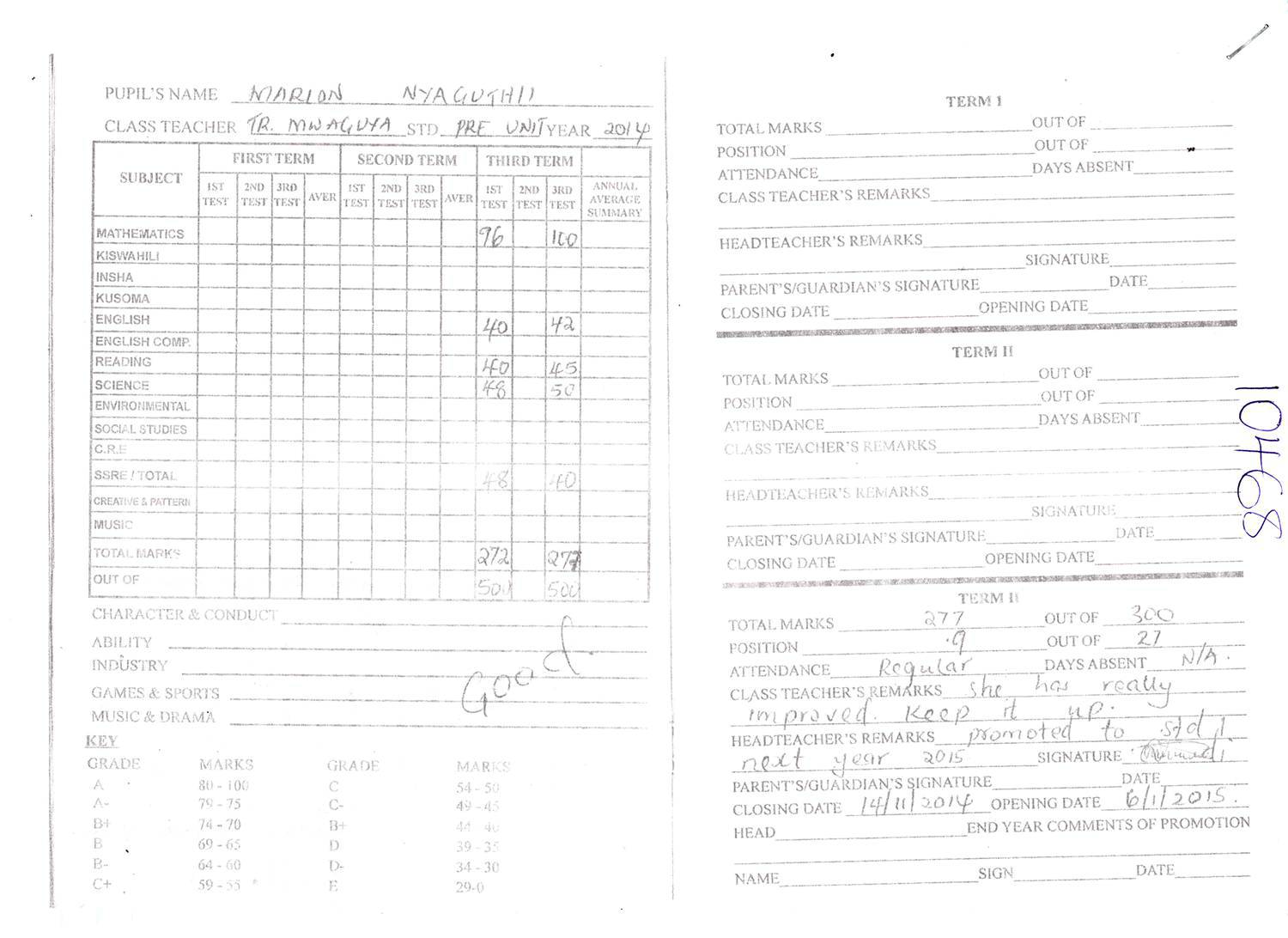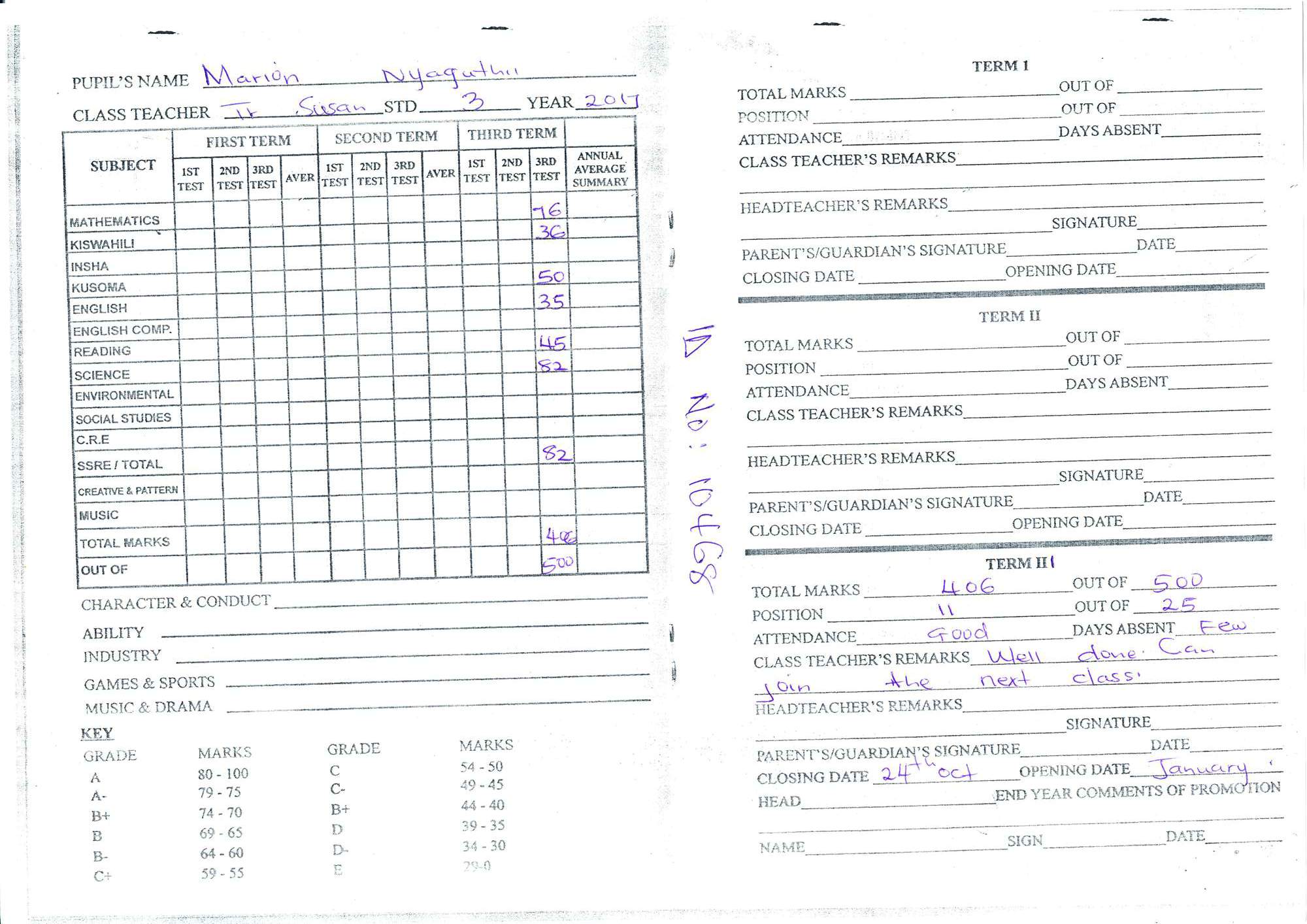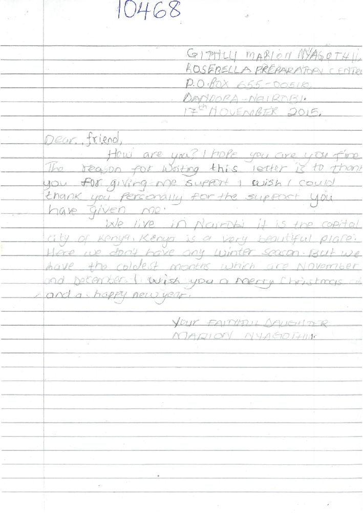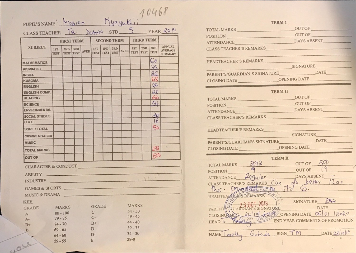 Marion Nyaguthi Githui byla adoptována v roce 2016 a dnes navštěvuje 6. třídu ve škole Rosebella Preparatory Academy.