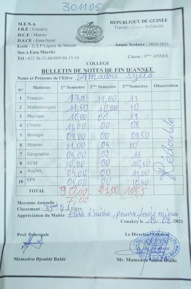 Amadou Sylla byl adoptován v roce 2010 a dnes navštěvuje 8. třídu ve škole Yagoubaya.