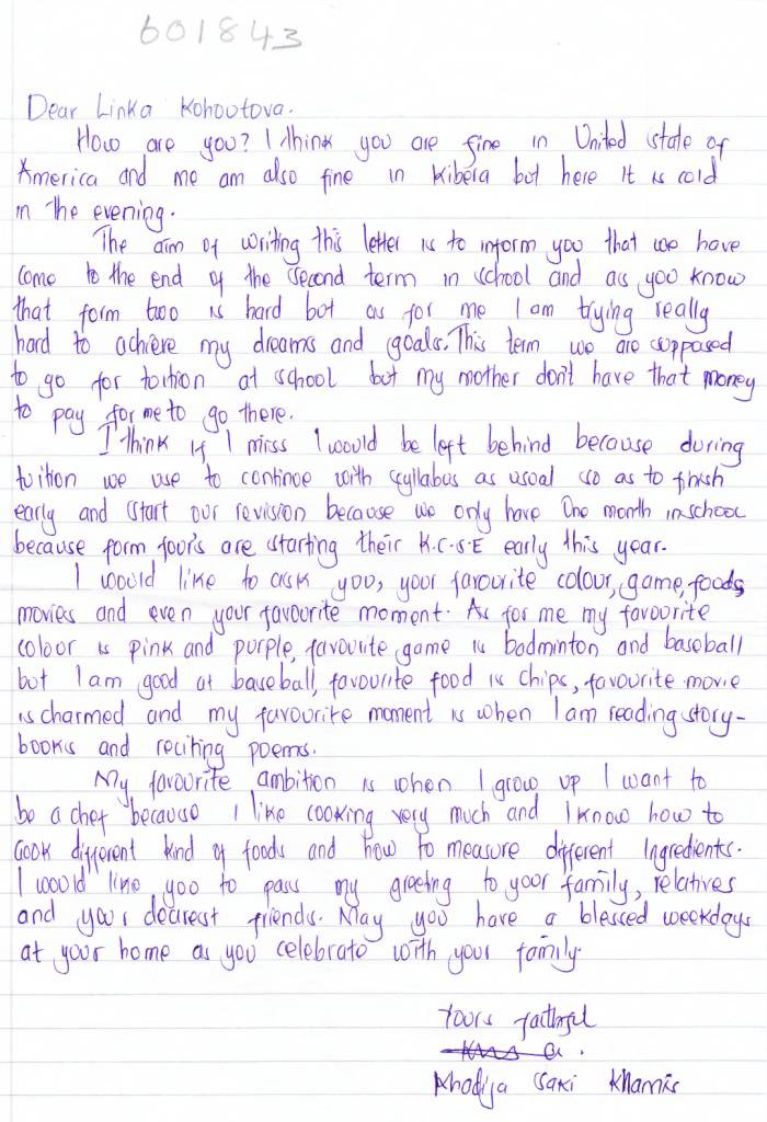Popis situace: Rodiče nemohou sehnat práci a rodina Khadiji závisí na pomoci sousedů a příbuzných. Díky adoptivním rodičům se dívka může vzdělávat a dnes (2016) studuje na Univerzitě Catering. Khadija v roce 2018 ukončuje vysokou školu.
