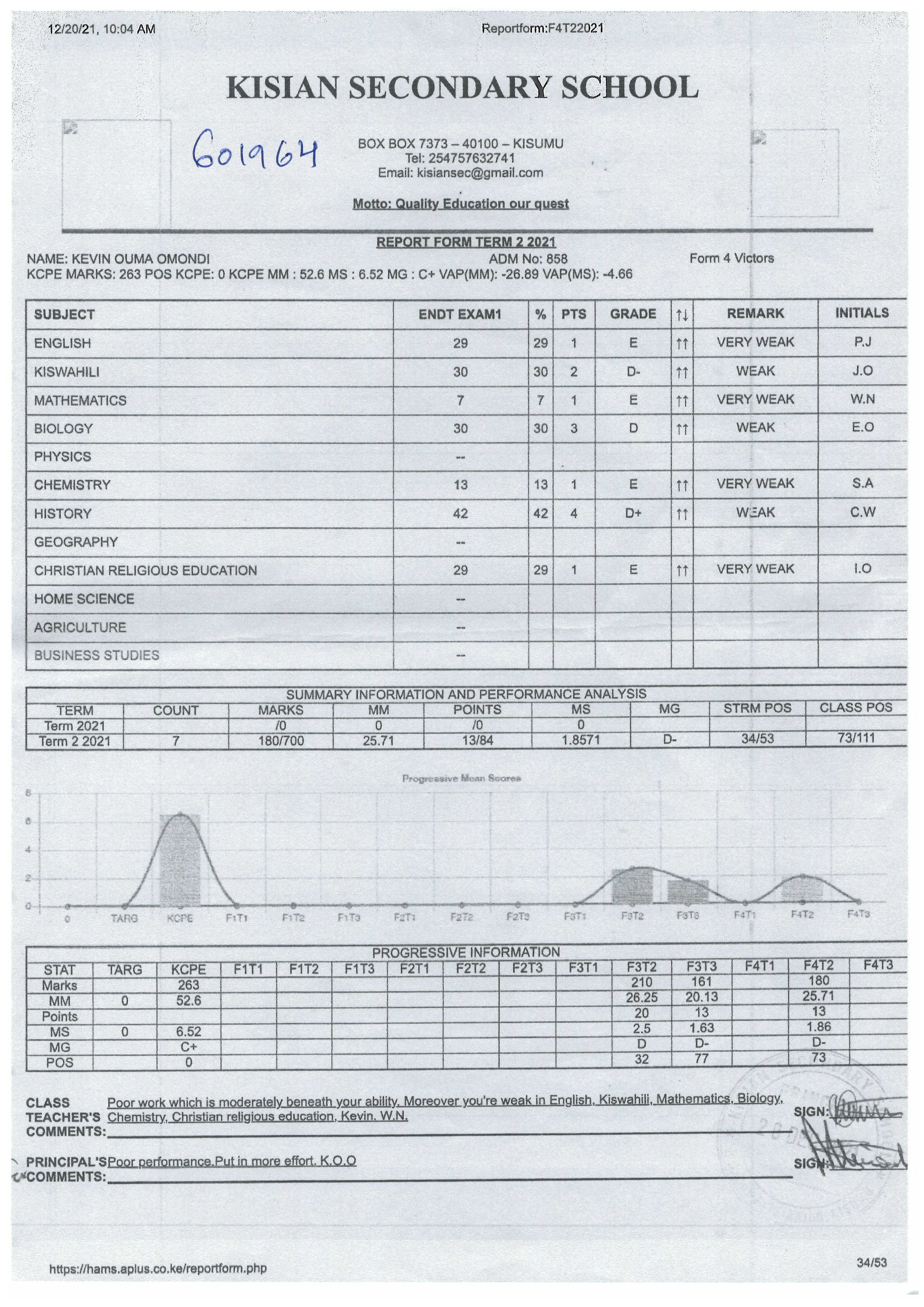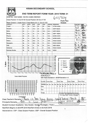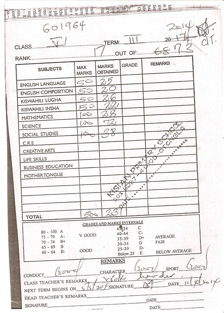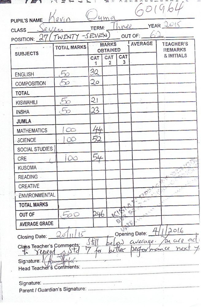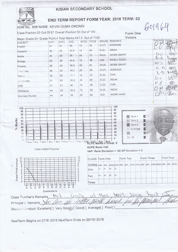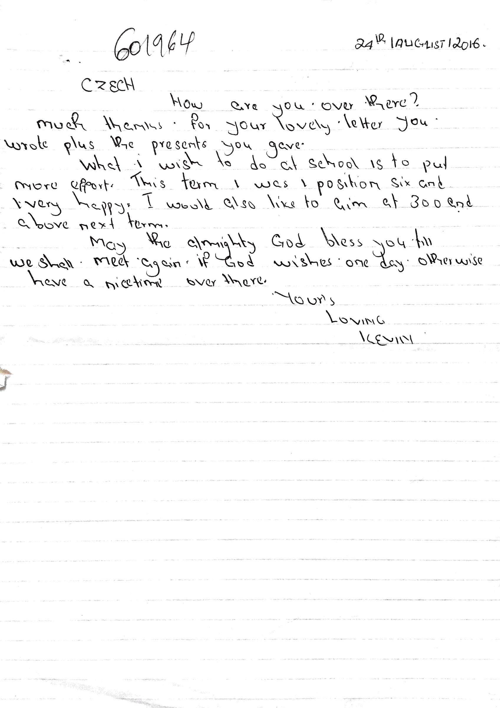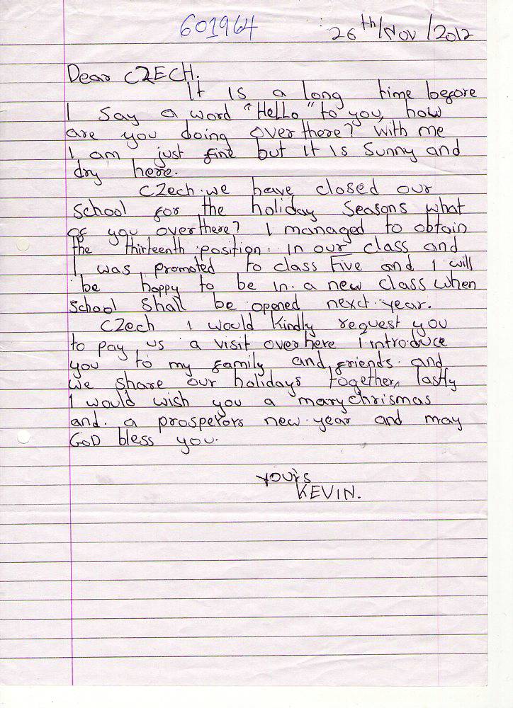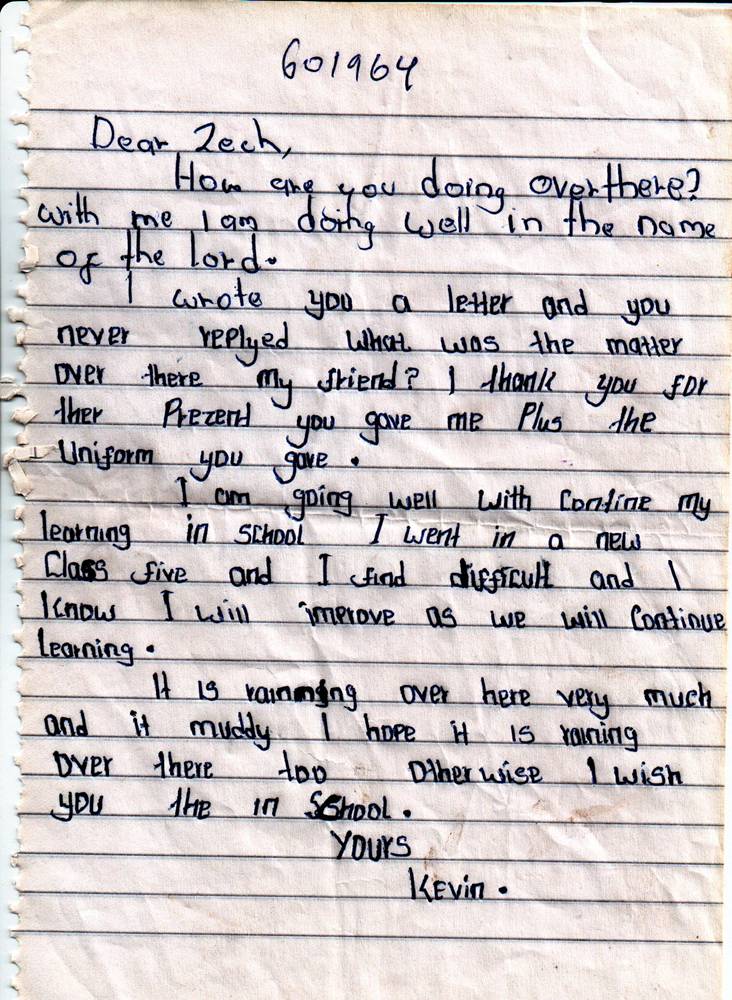 Kevin Ouma Awino byl adoptován v roce 2009 a dnes navštěvuje 3. ročník střední školy ve škole Kisian High School.