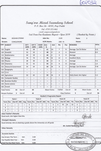 Gesham Otieno Ochieng byl adoptován v roce 2009 a dnes navštěvuje 4. ročník střední školy ve škole SANG' ORO MIXED SECONDARY SCHOOL.