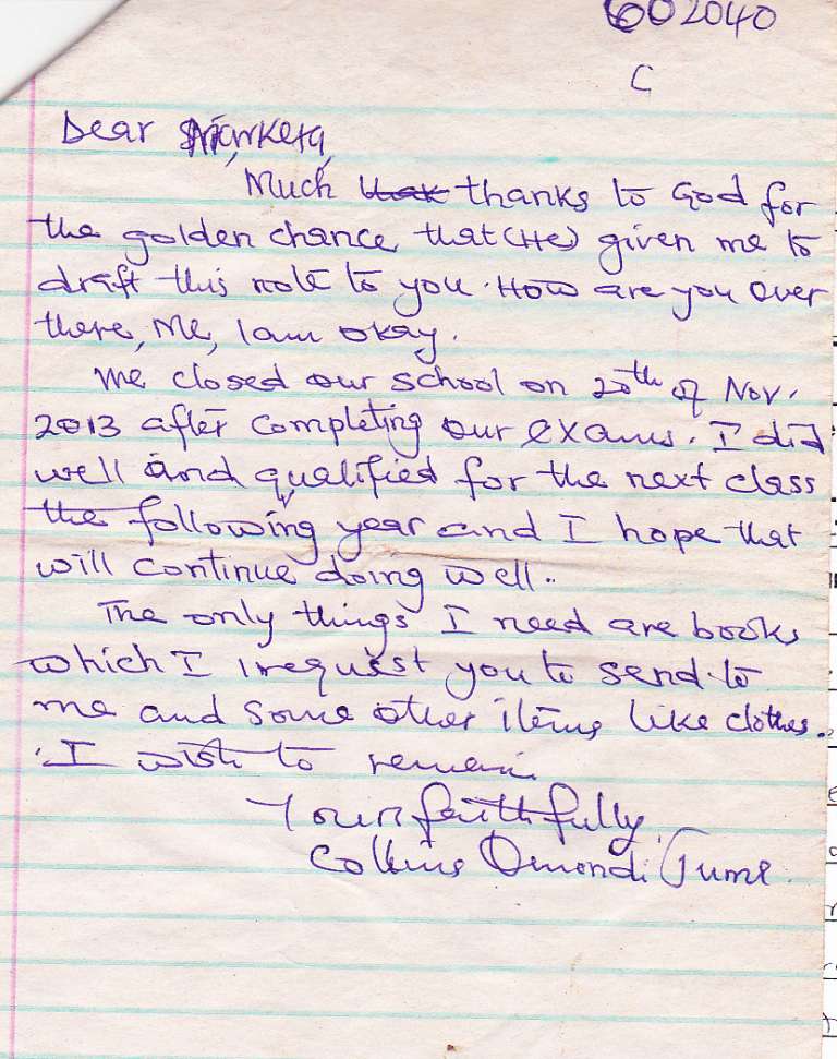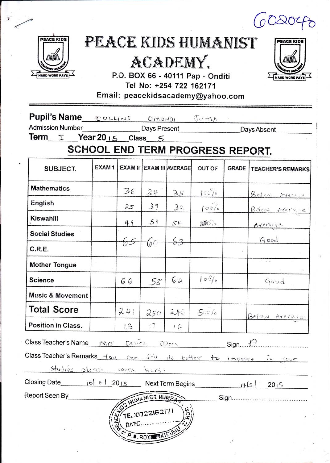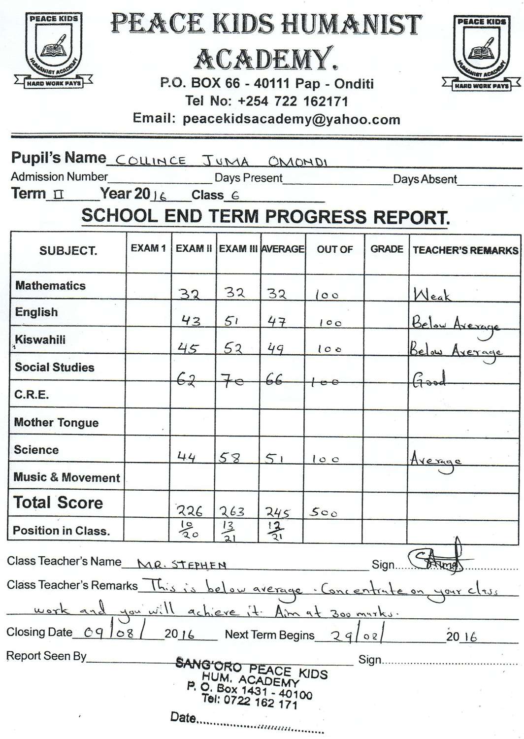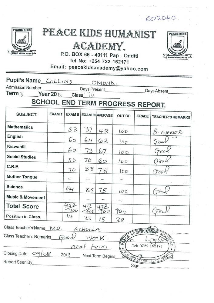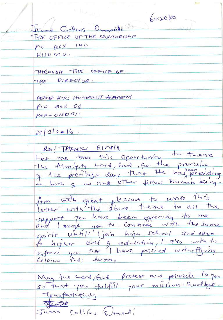 Collince Omondi Juma byl adoptován v roce 2009 a dnes navštěvuje 1. ročník střední školy ve škole Peace Kids Humanist School.