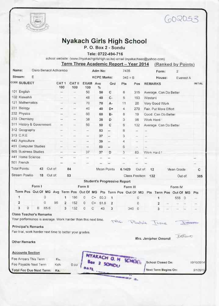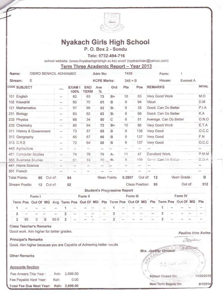 Aby mohlo adoptované dítko začít chodit do školy, musí být uhrazeny peníze za školné alespoň měsíc předem. Tím máme dostatek času převést peníze do Keni a vypsat šek na jméno školy a zaručit jeho doručení do školy - to vše před započetím trimestru. Konkrétně to tedy znamená, že vždy do konce března, července a listopadu musí být na našem účtu 2400 Kč na uhrazení školného na nově začínající trimestr. Adoptivní rodič může platit třikrát ročně nebo jednorázově na celý rok a záleží to čistě na jeho rozhodnutí a možnostech.