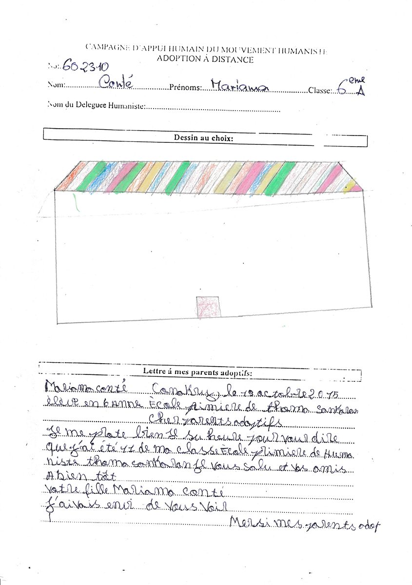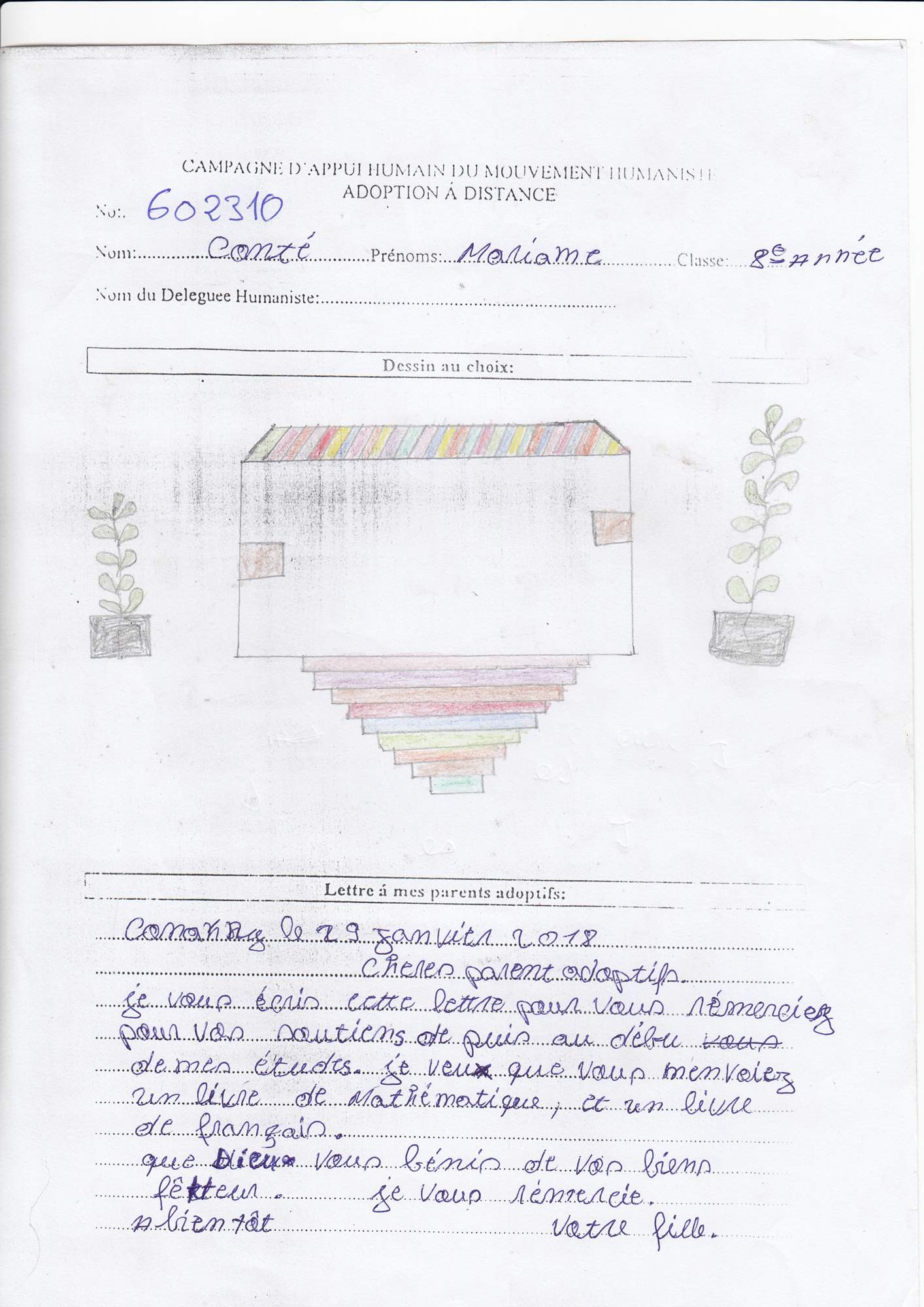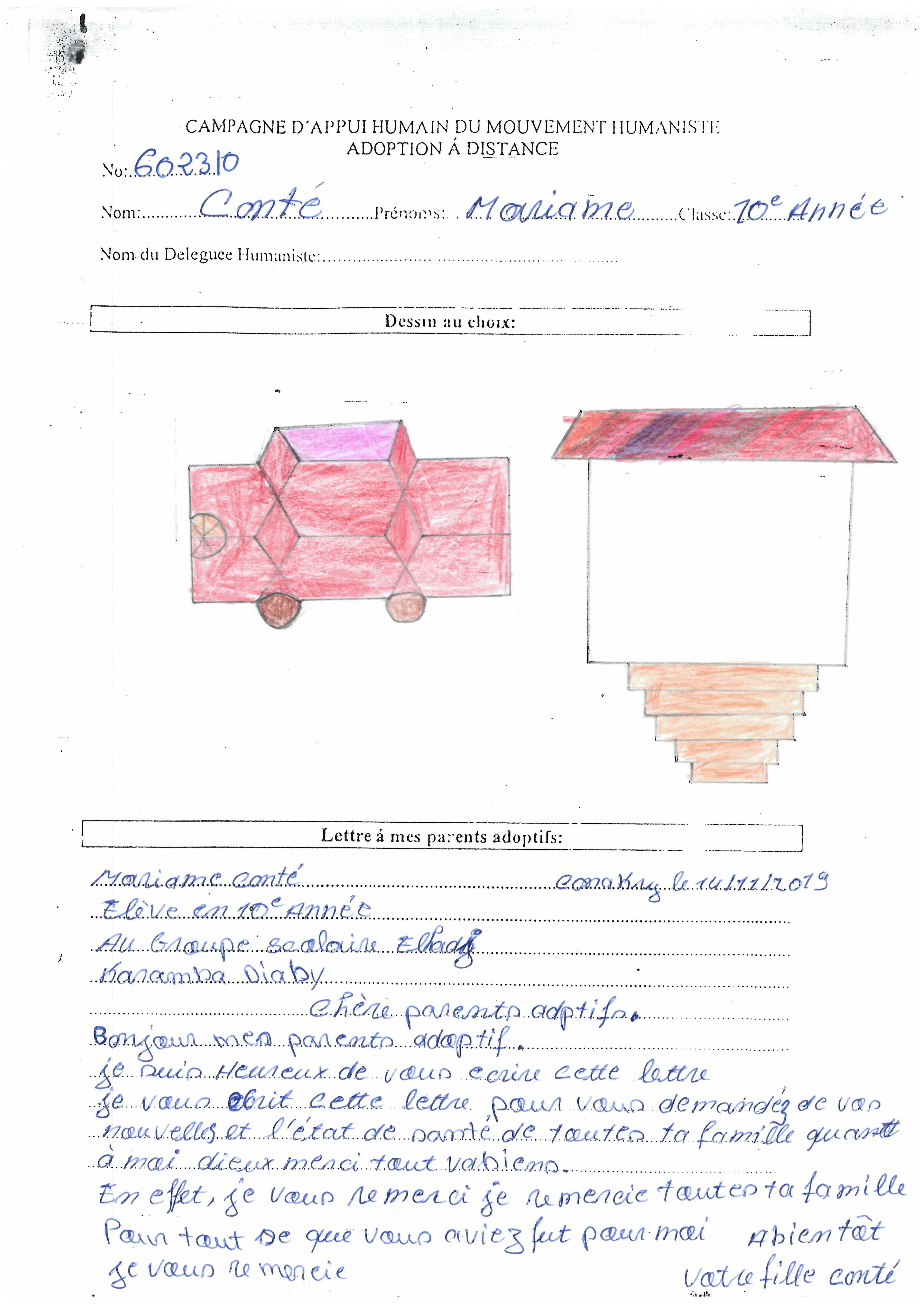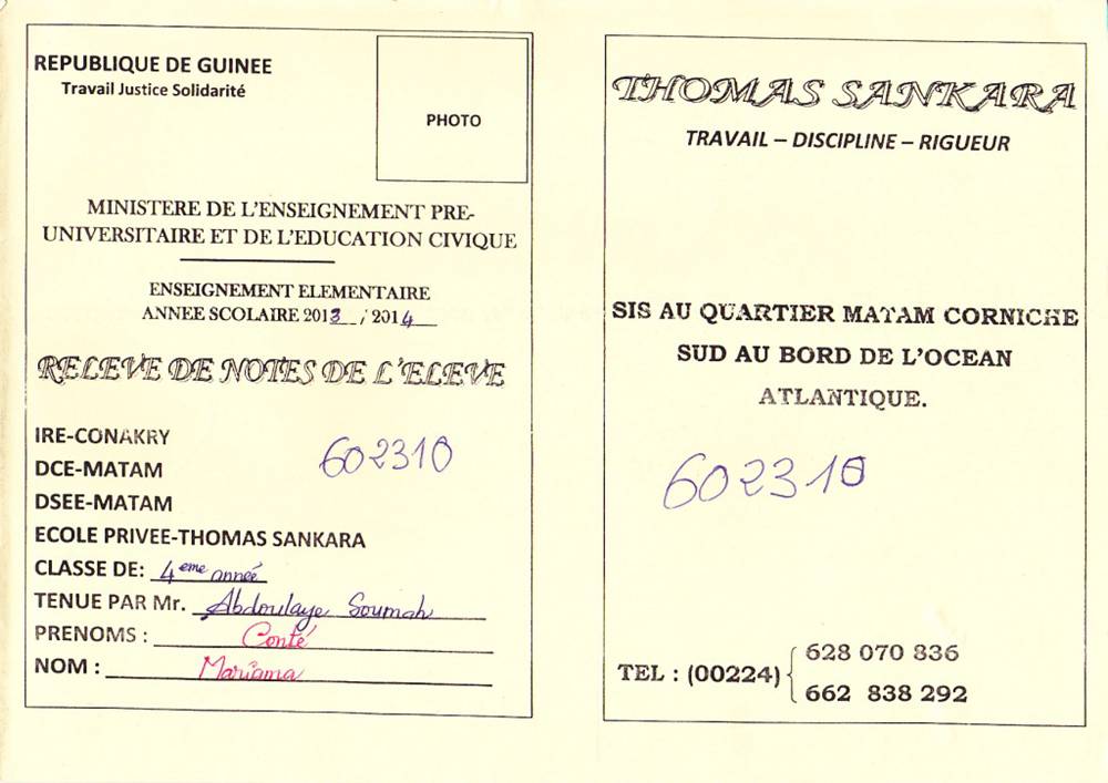 Mariama Conté byla adoptována v roce 2013 a dnes navštěvuje 10. třídu ve škole G.S. Humaniste Thomas Sankara (Matam Lido).