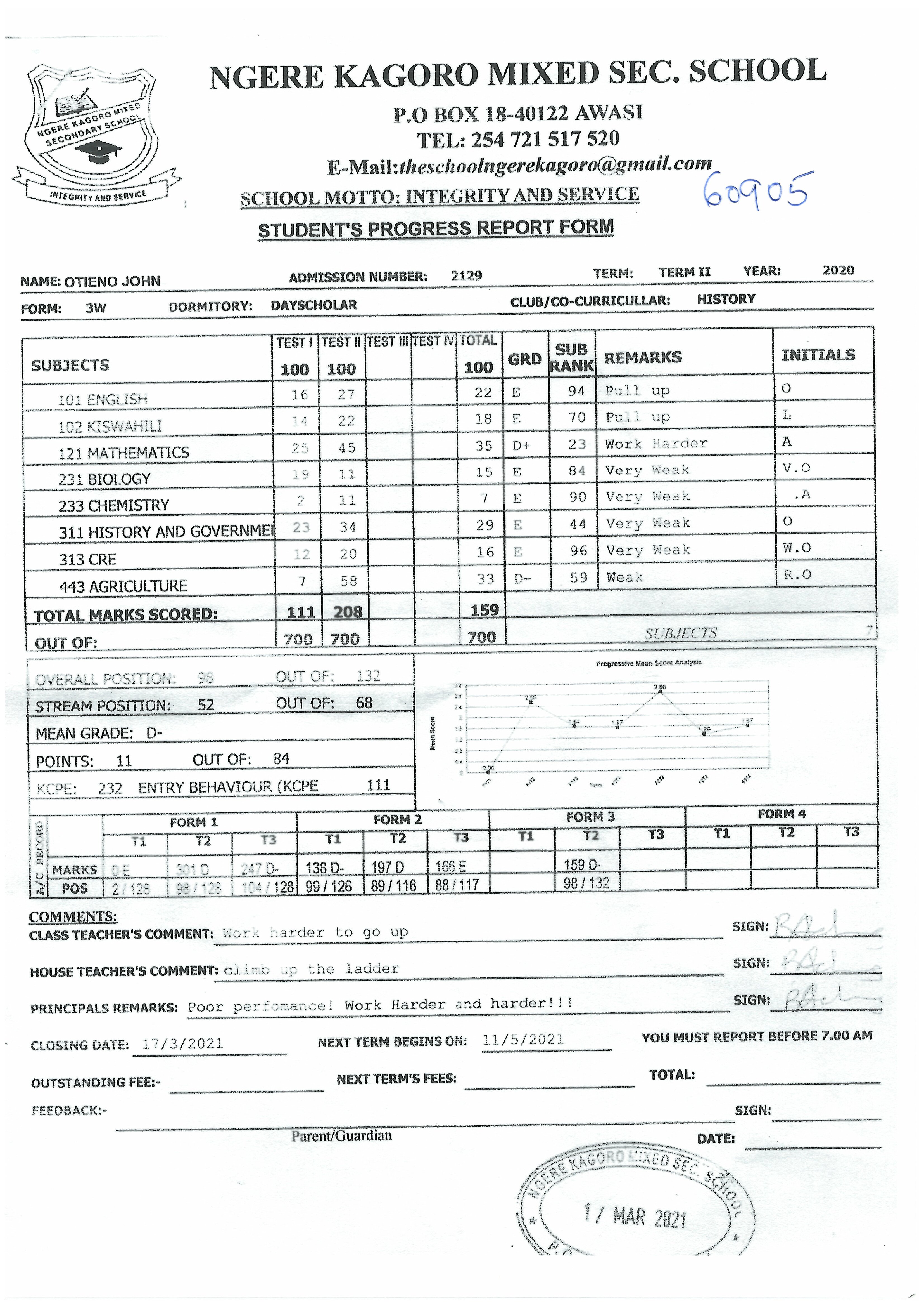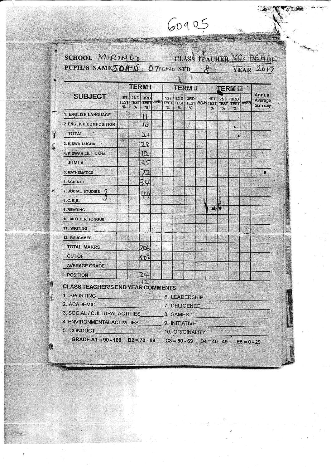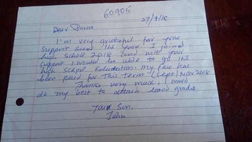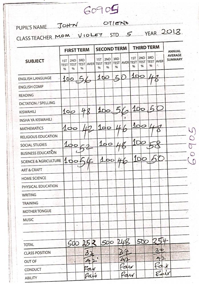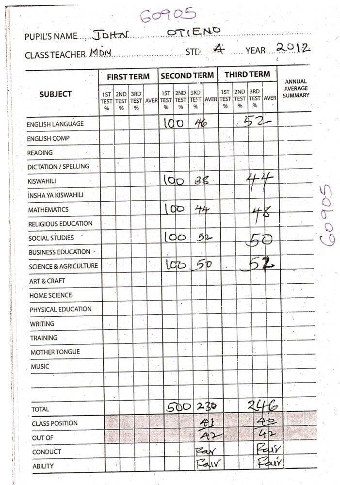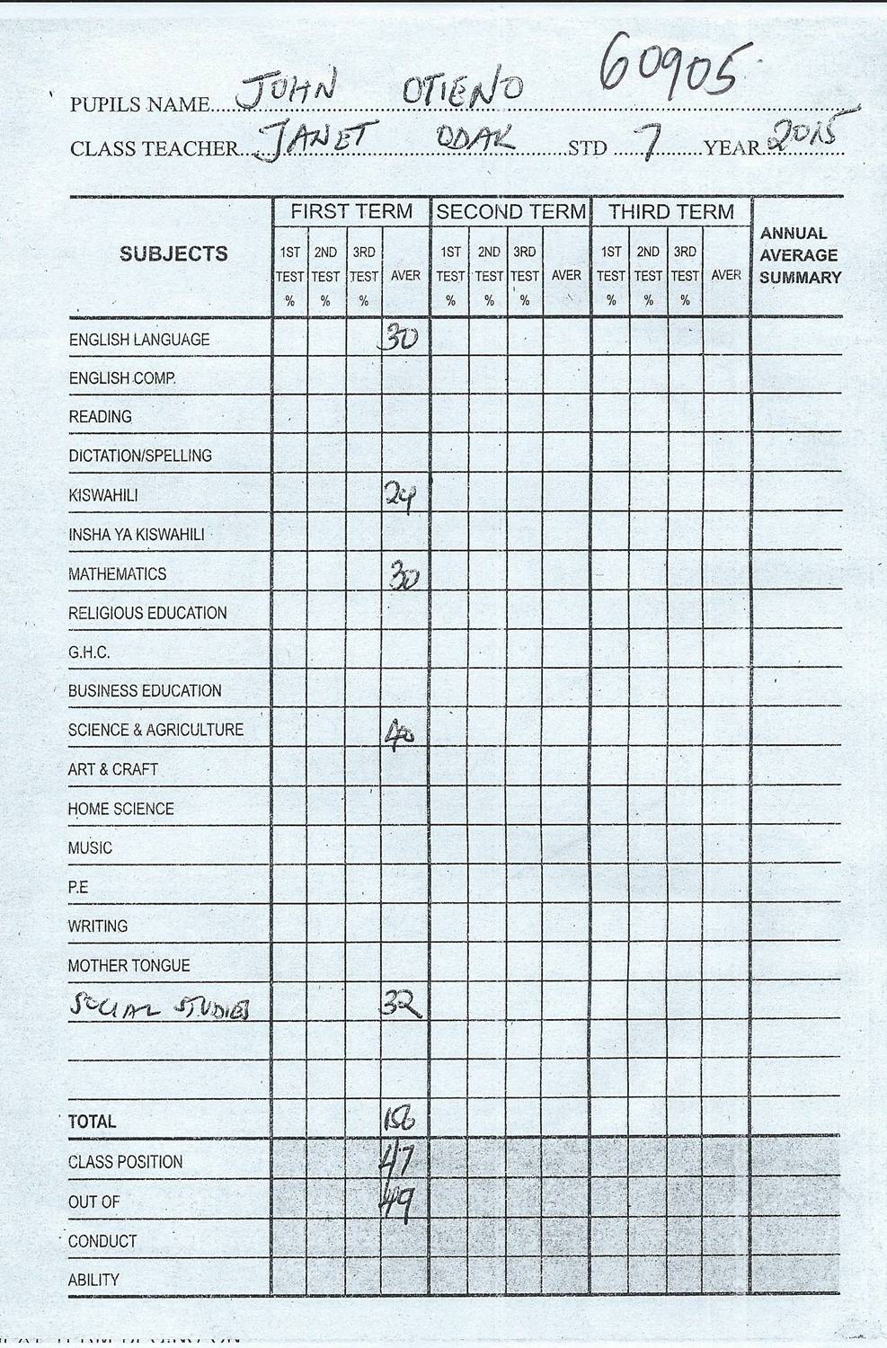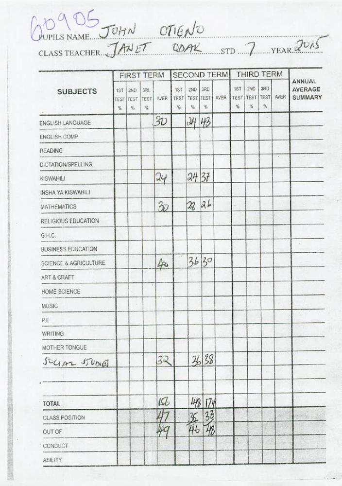 John Otieno byl adoptován v roce 2006 a dnes navštěvuje 2. ročník střední školy ve škole Miringo Primary School.