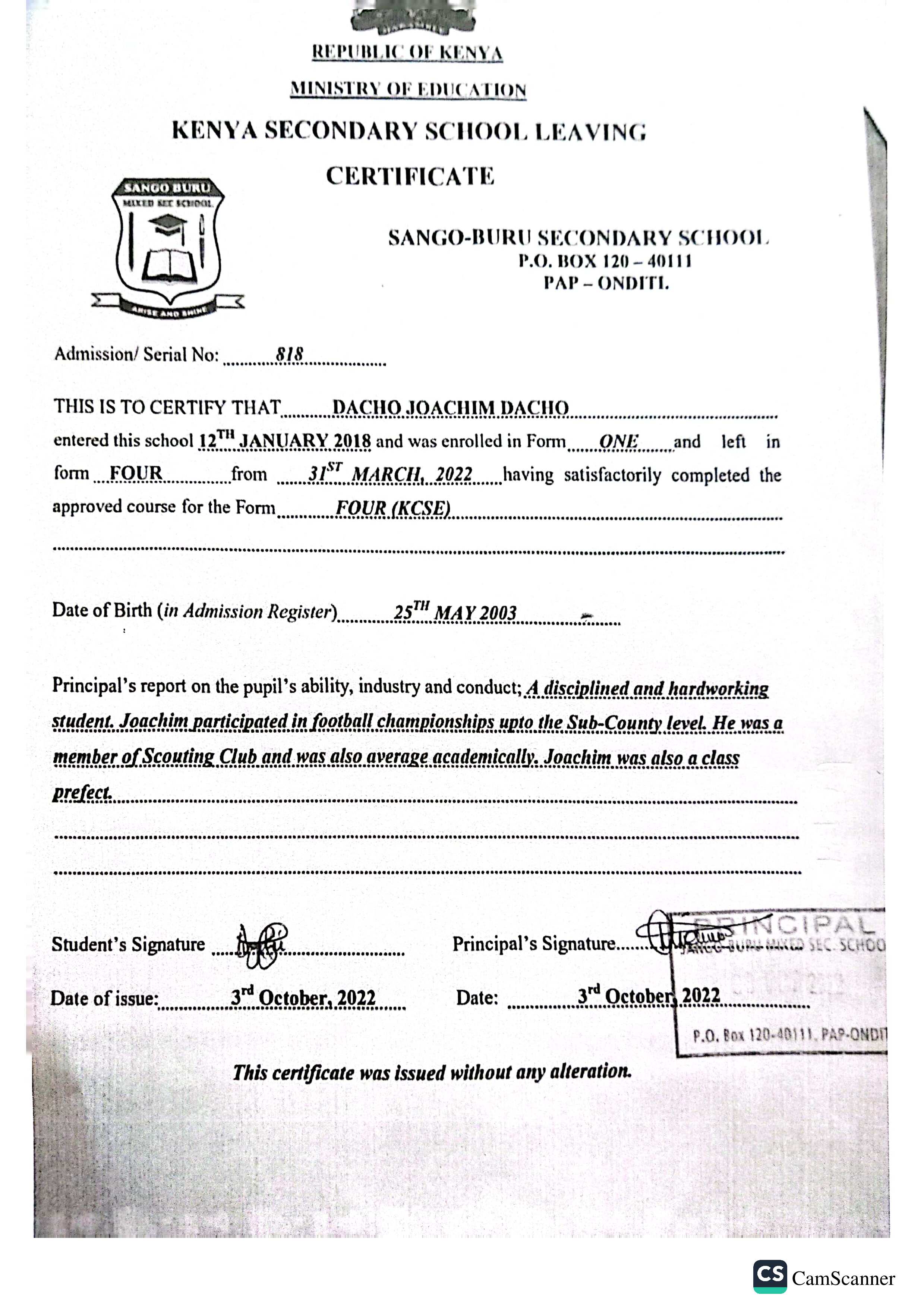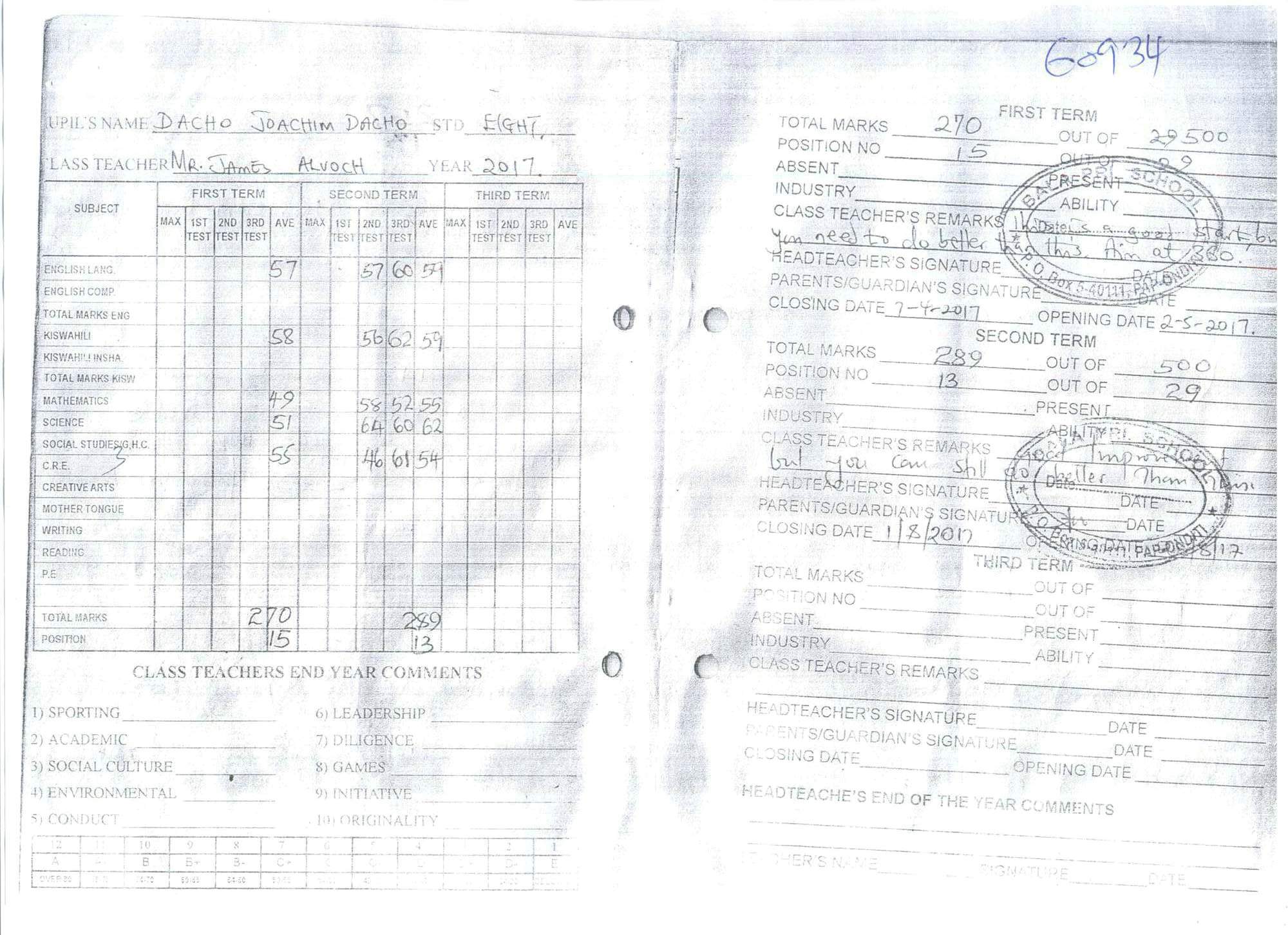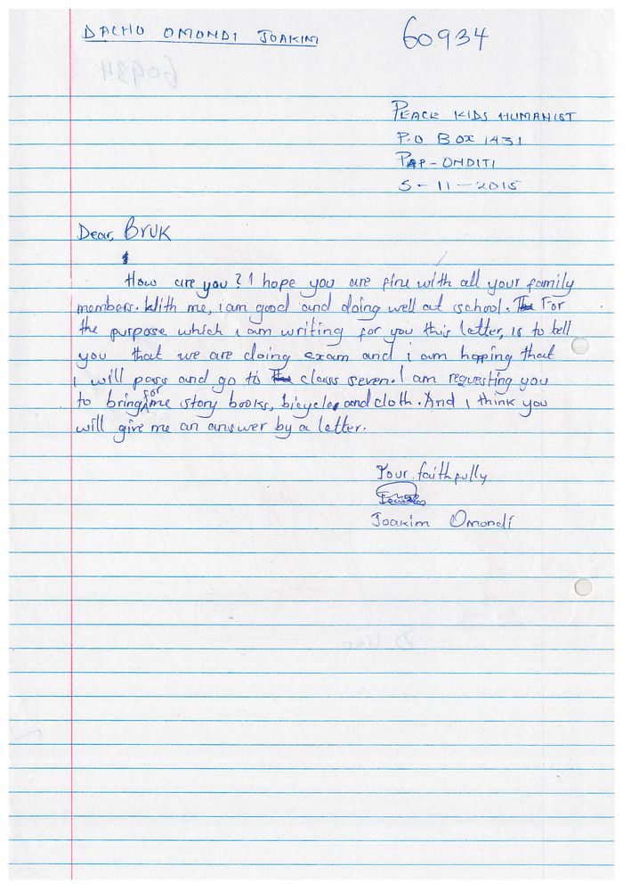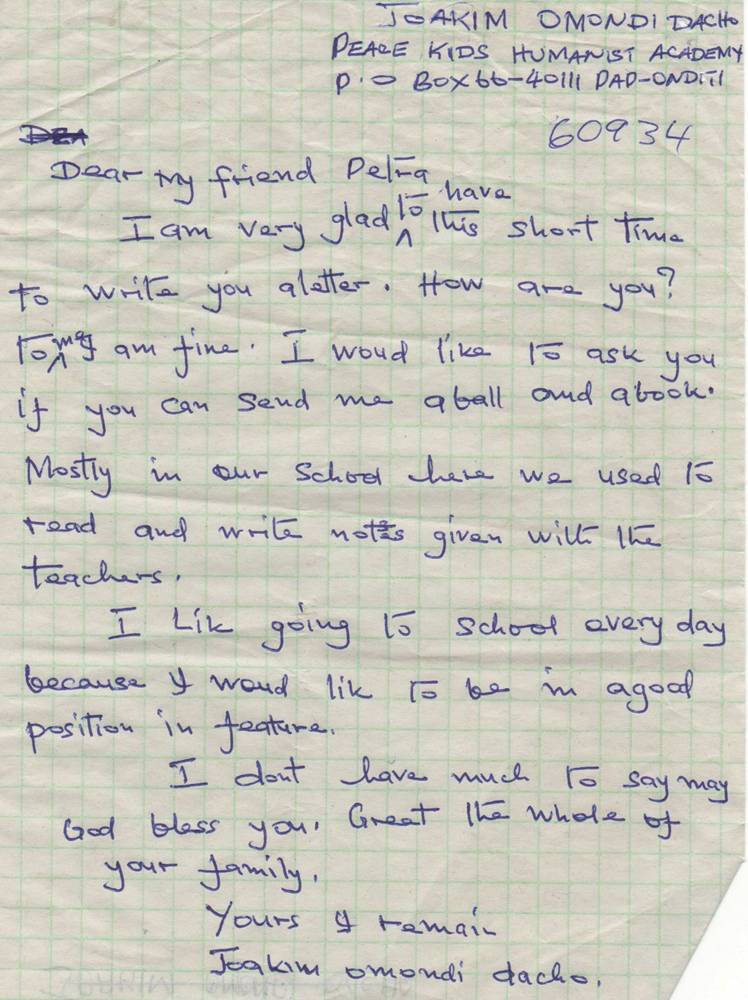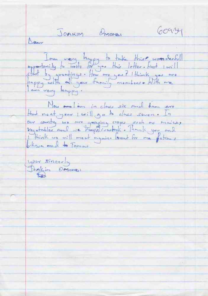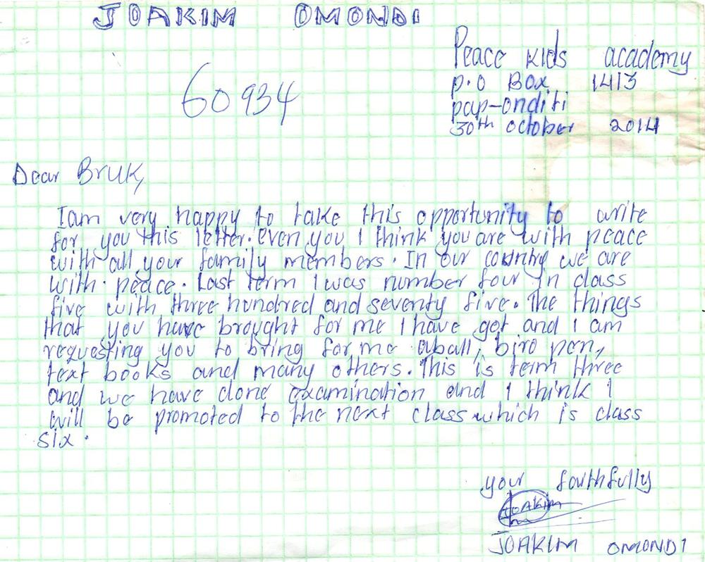 Joakim Omondi Dacho byl adoptován v roce 2007 a dnes navštěvuje 2. ročník střední školy ve škole Peace Kids Humanist School.