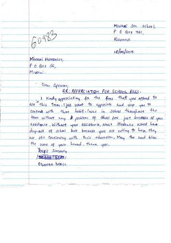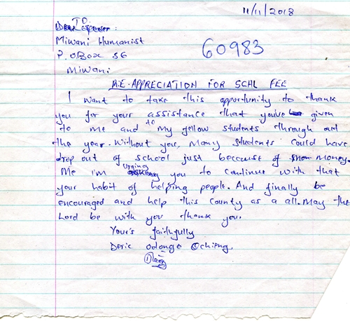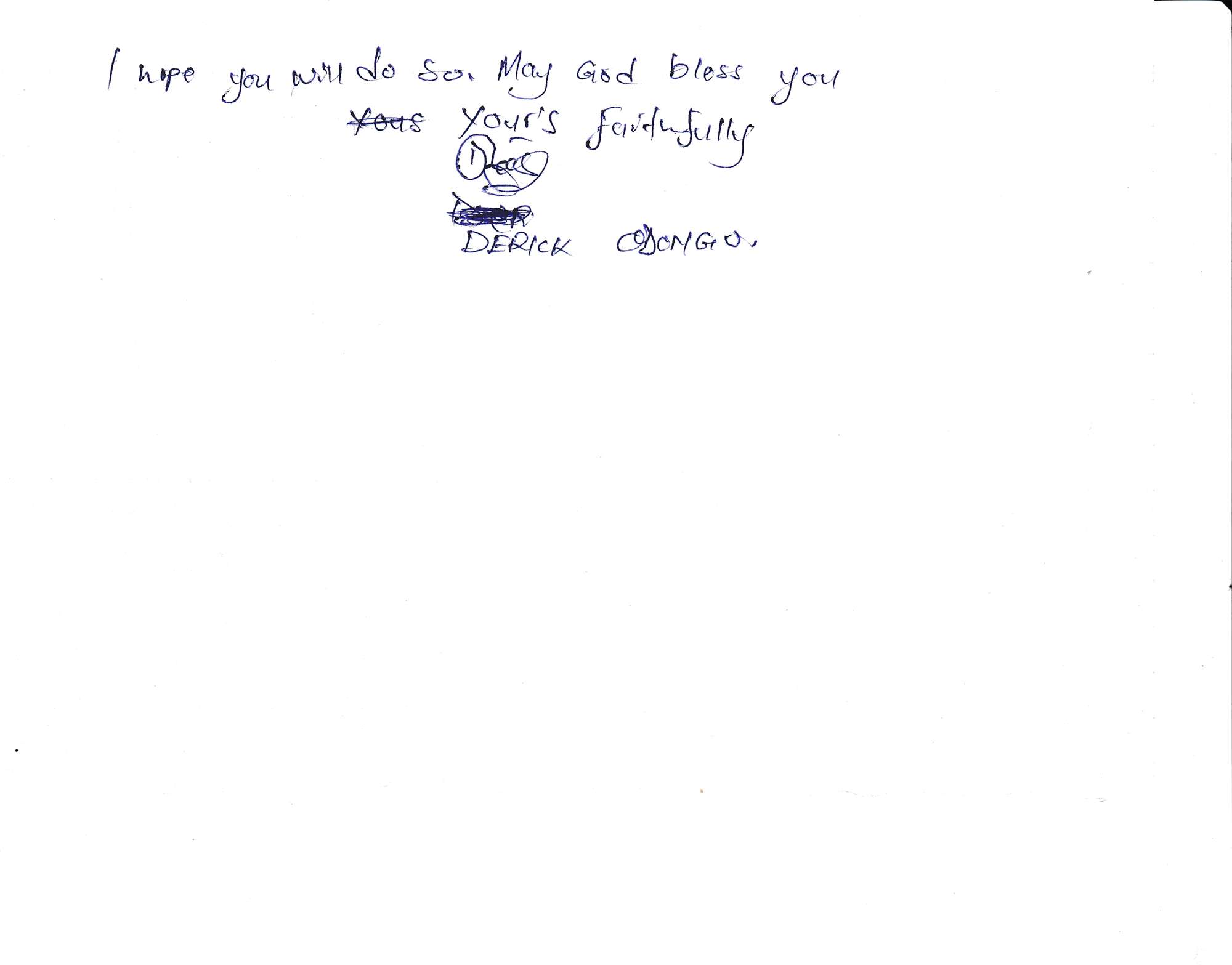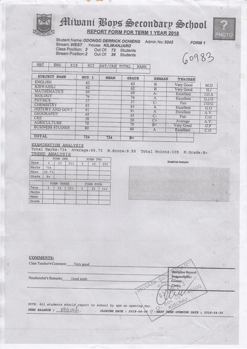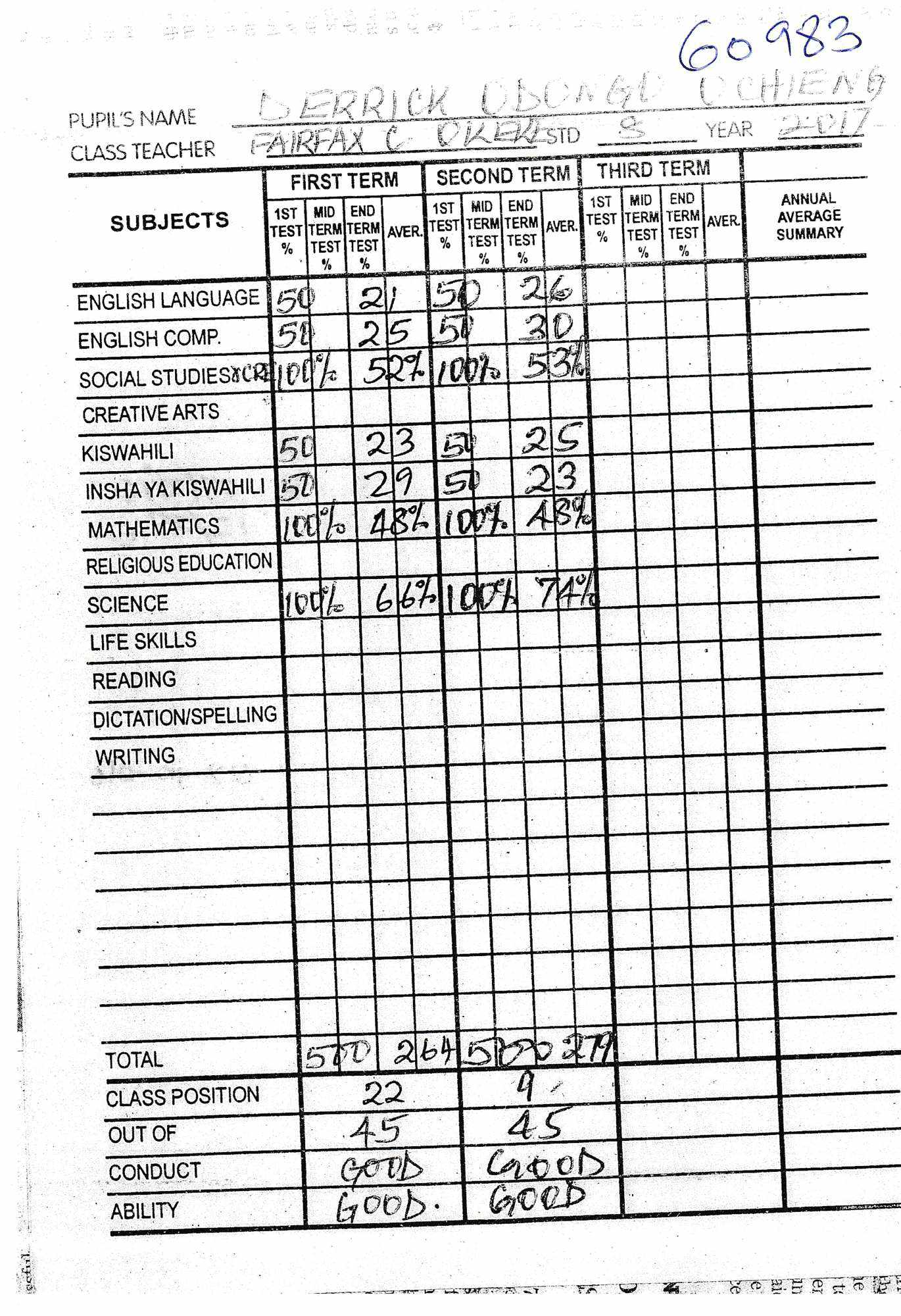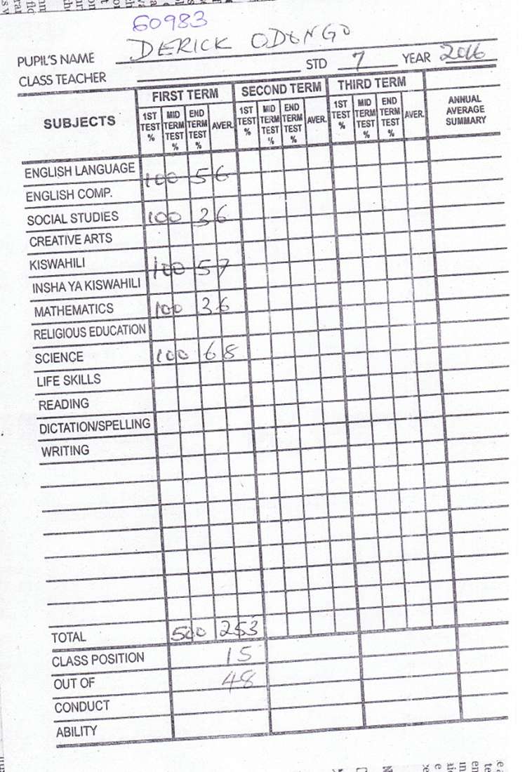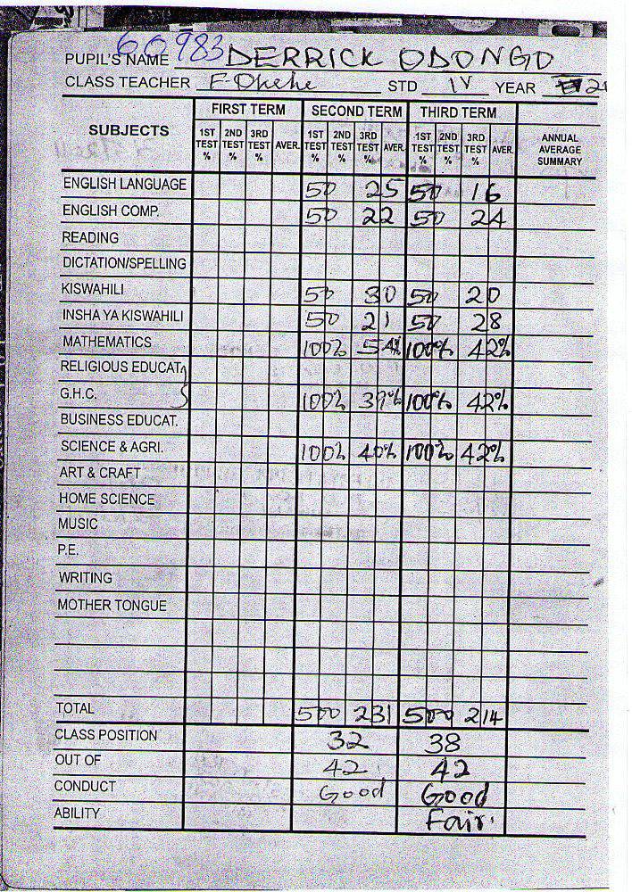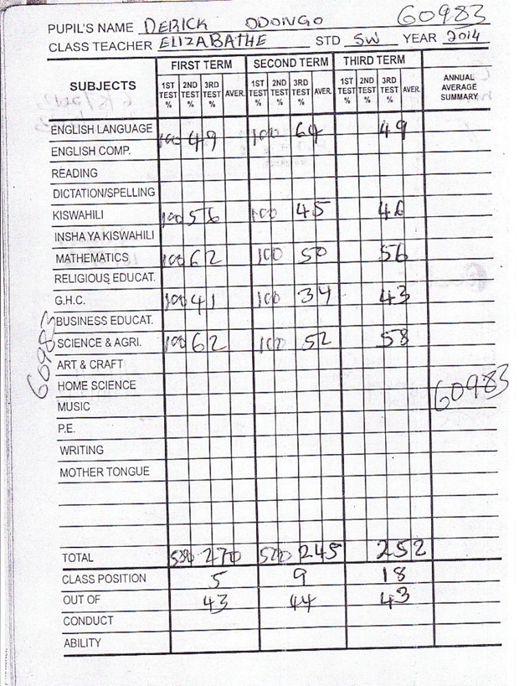 Derick Odongo byl adoptován v roce 2007 a dnes navštěvuje 3. ročník střední školy ve škole Miwani Boys High School.