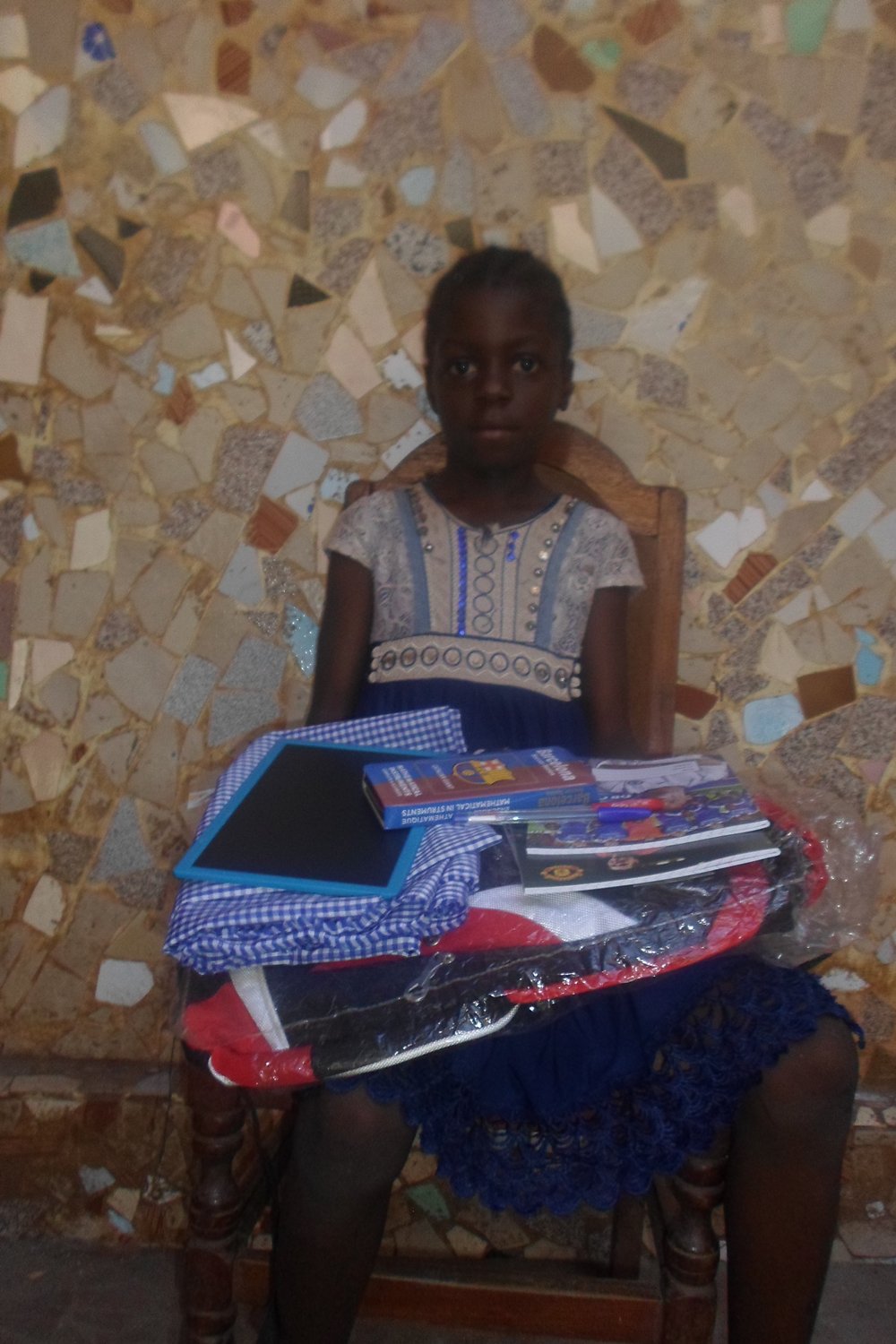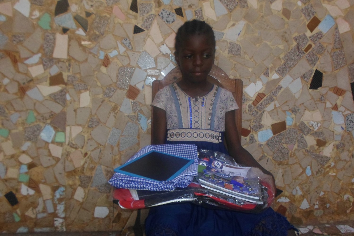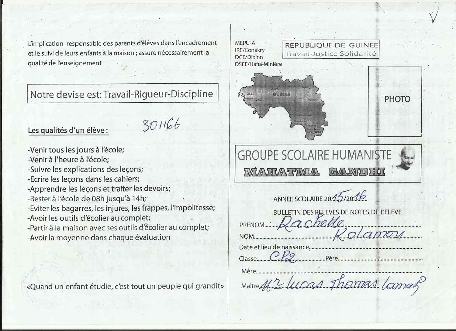 Rachelle Kolamou byla adoptována v roce 2014 a dnes navštěvuje 6. třídu ve škole Groupe Scolaire Humaniste Mahatma Gandhi - Hafia.