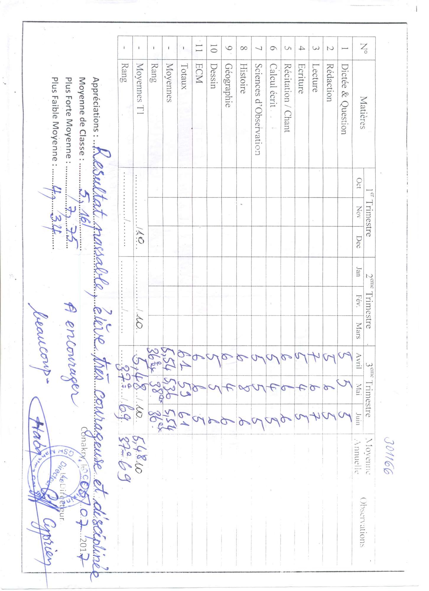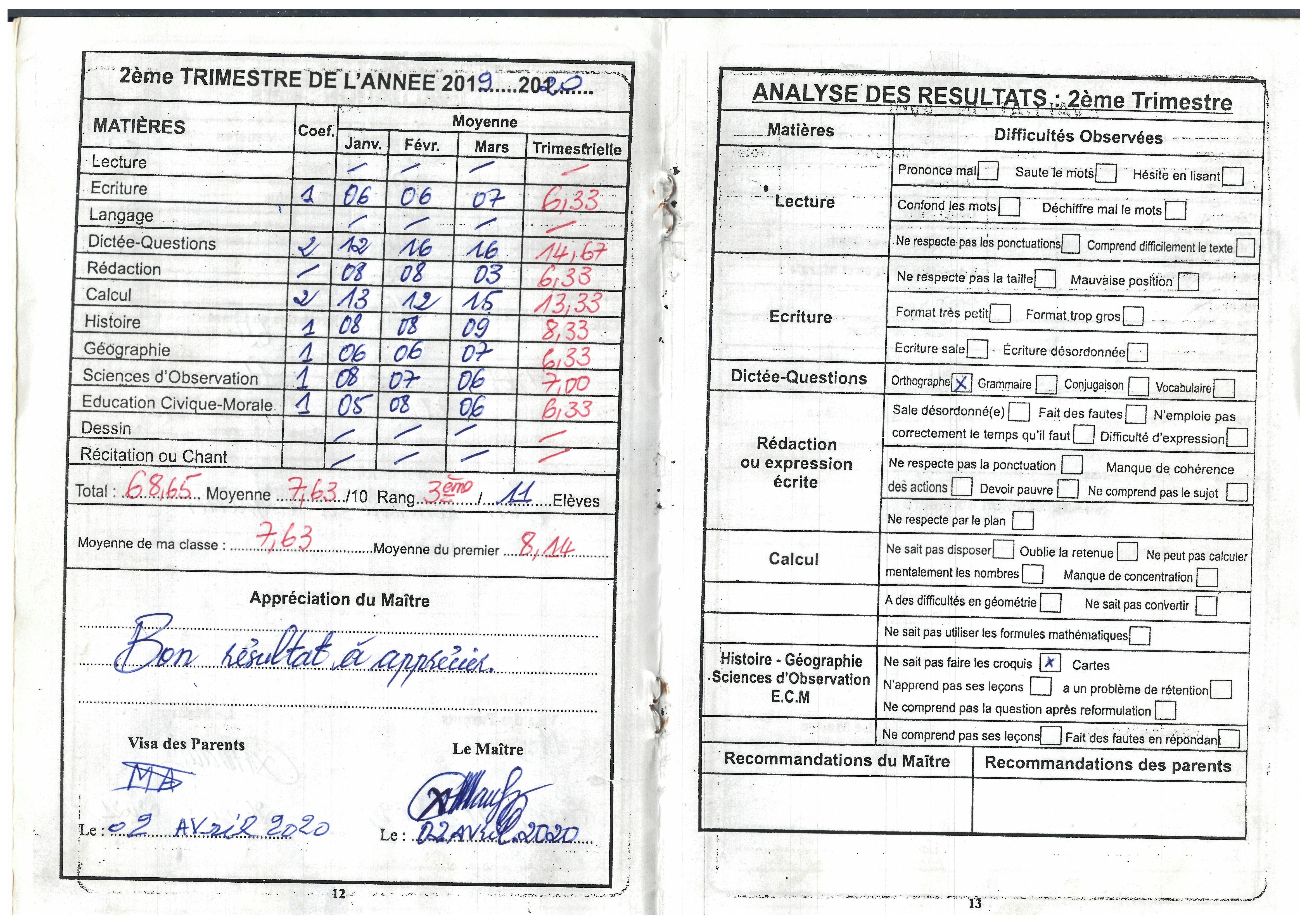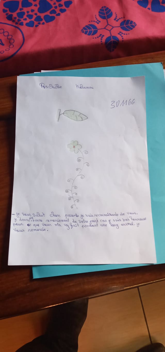 Rachelle Kolamou byla adoptována v roce 2014 a dnes navštěvuje 6. třídu ve škole Groupe Scolaire Humaniste Mahatma Gandhi - Hafia.