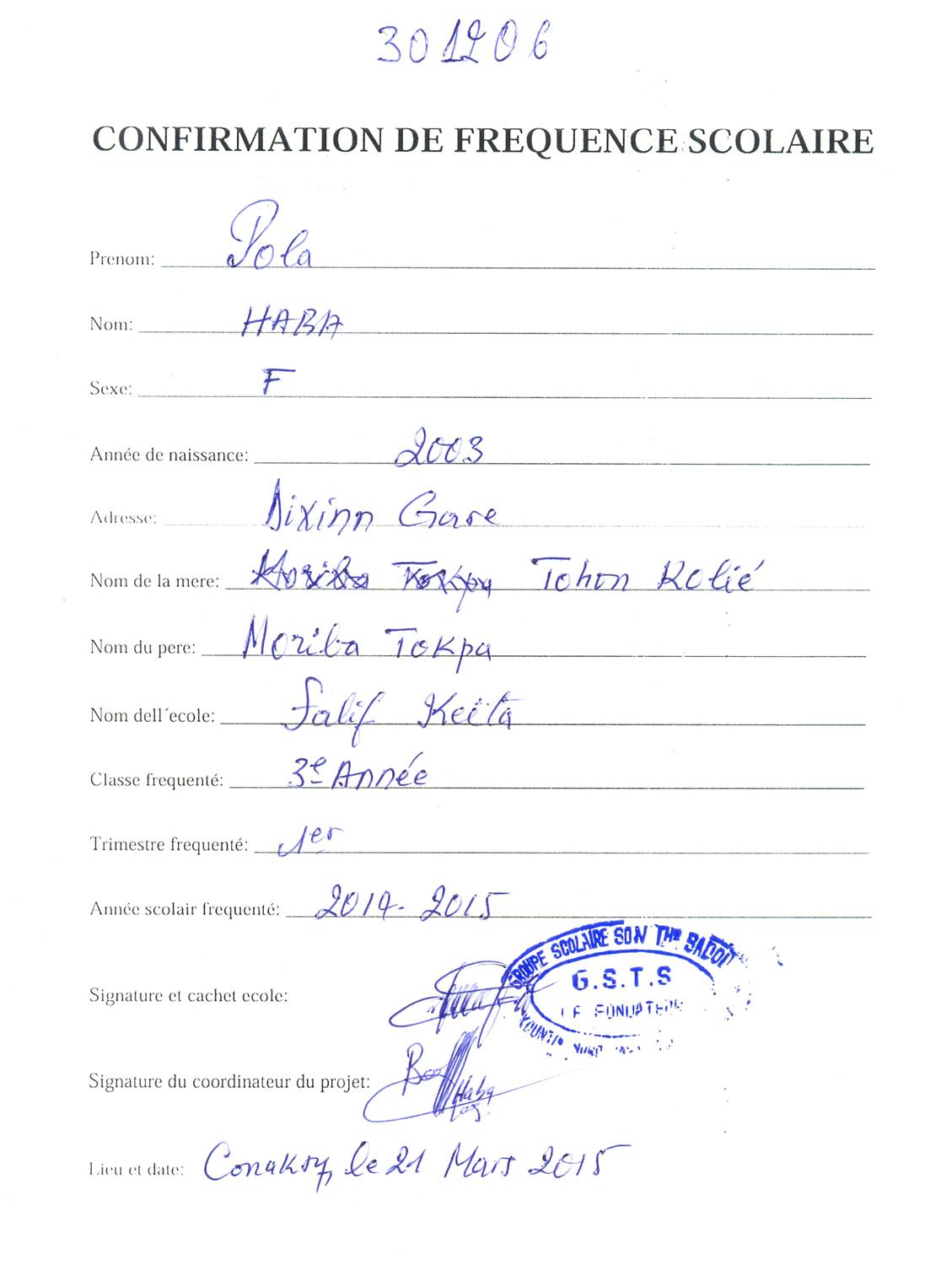 Aby mohlo adoptované dítko začít chodit do školy, musí být uhrazeny peníze za školné alespoň měsíc předem. Tím máme dostatek času zajistit převod peněz do Guineje a vyřídit všechny formality. Konkrétně to tedy znamená, že vždy do konce srpna, listopadu a února musí být na našem účtu 2500 Kč na uhrazení školného na nově začínající trimestr. Adoptivní rodič může platit třikrát ročně nebo jednorázově na celý rok a záleží to čistě na jeho rozhodnutí a možnostech.