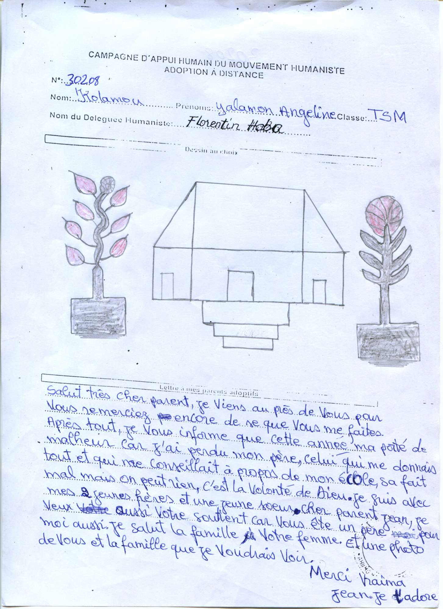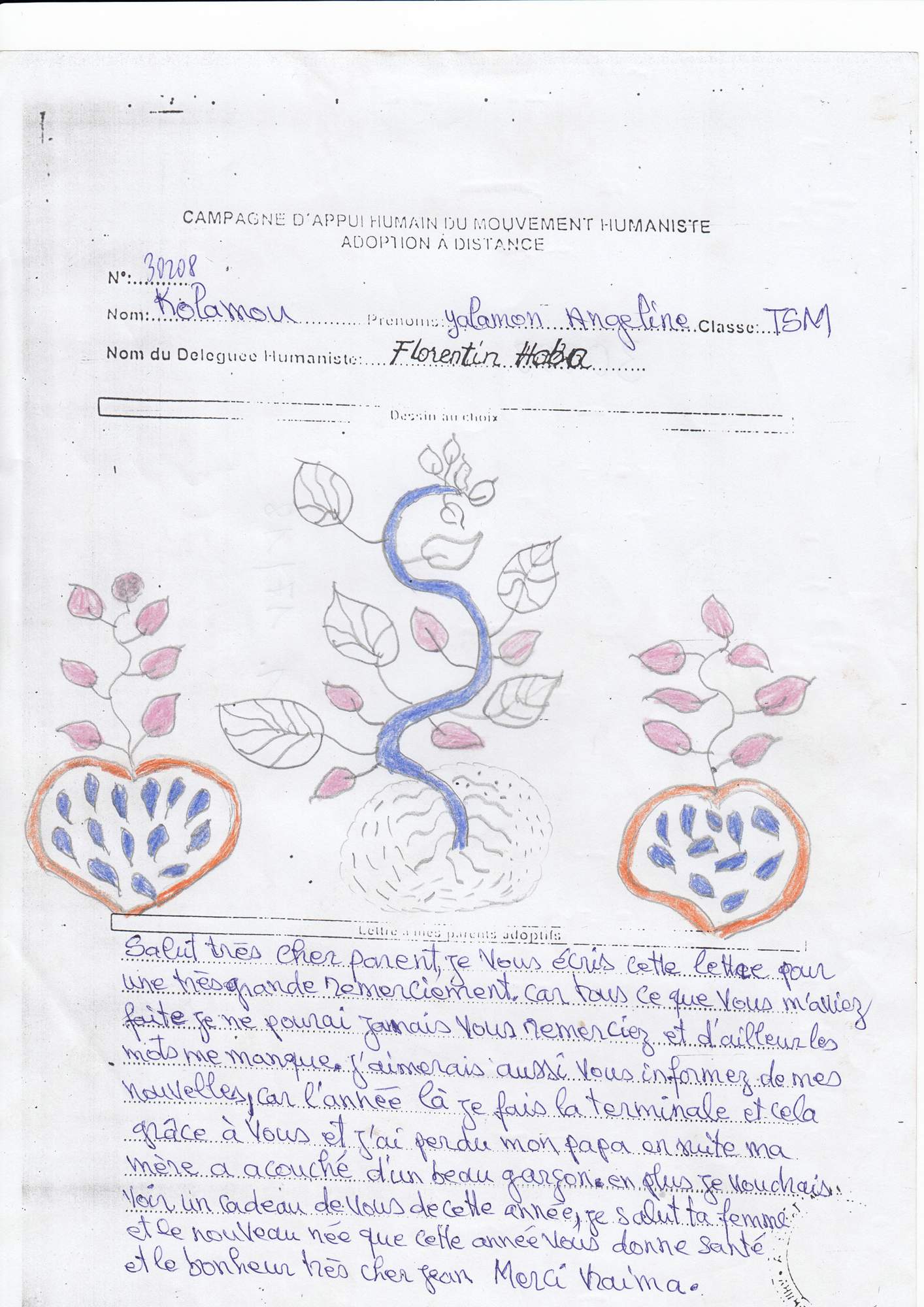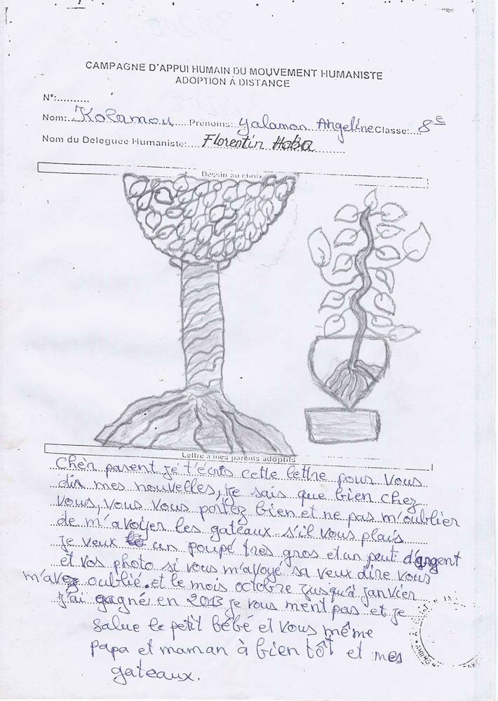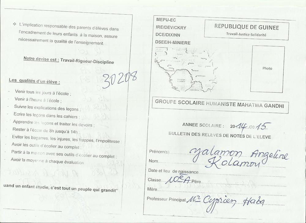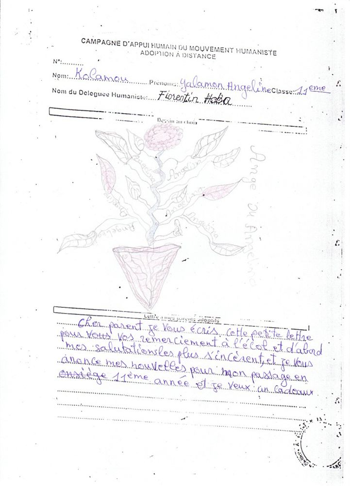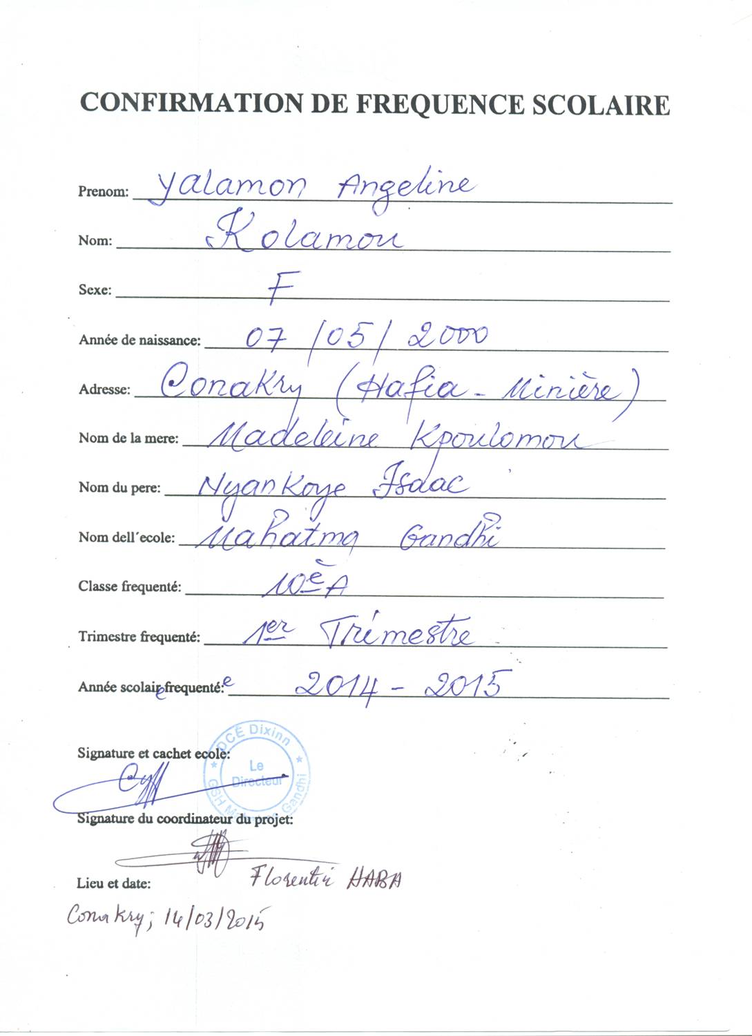 Angeline Yalamo Kolamou byla adoptována v roce 2003 a dnes navštěvuje 1. ročník vysoké školy ve škole Groupe Scolaire Humaniste Mahatma Gandhi - Hafia.
