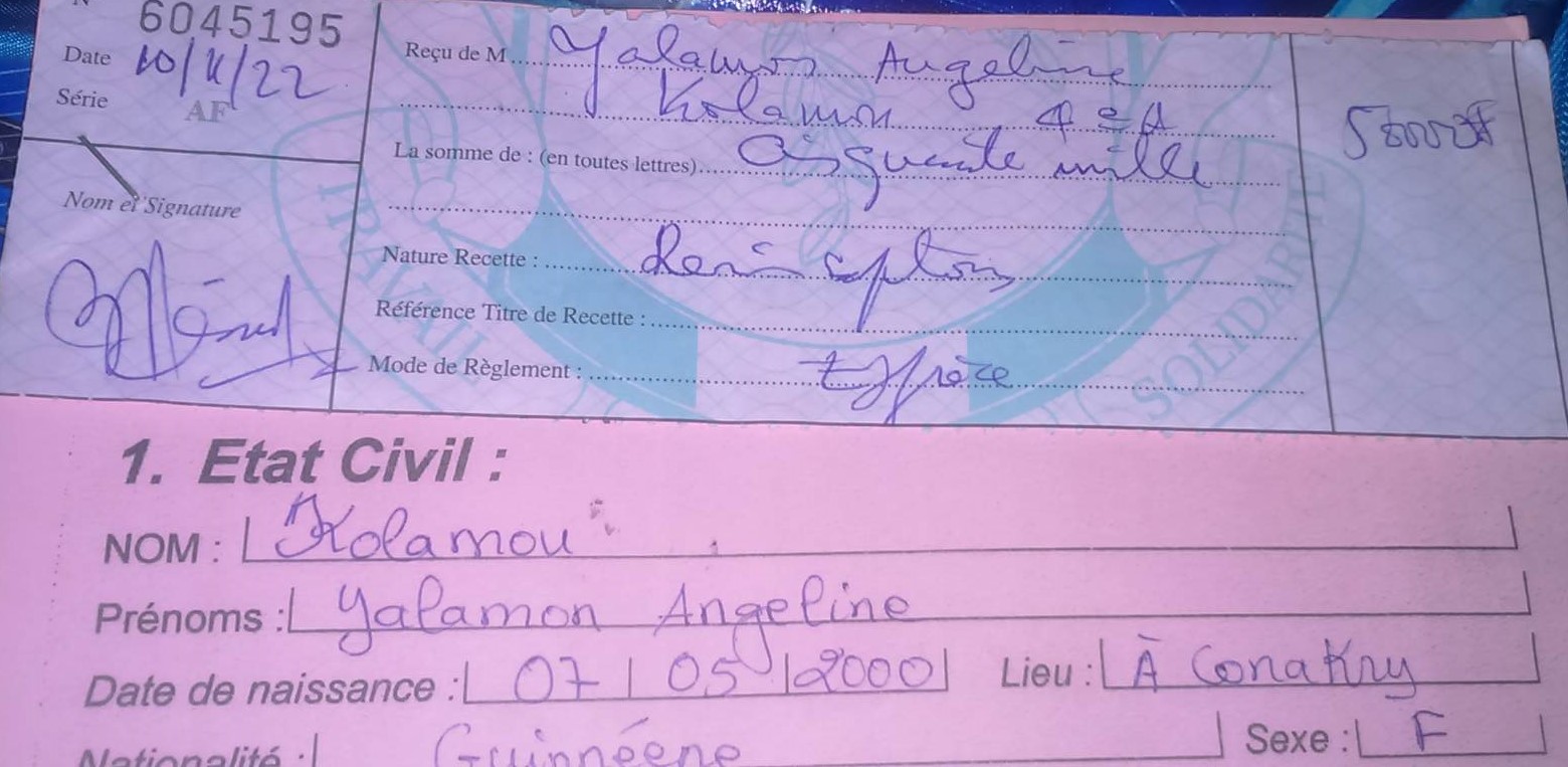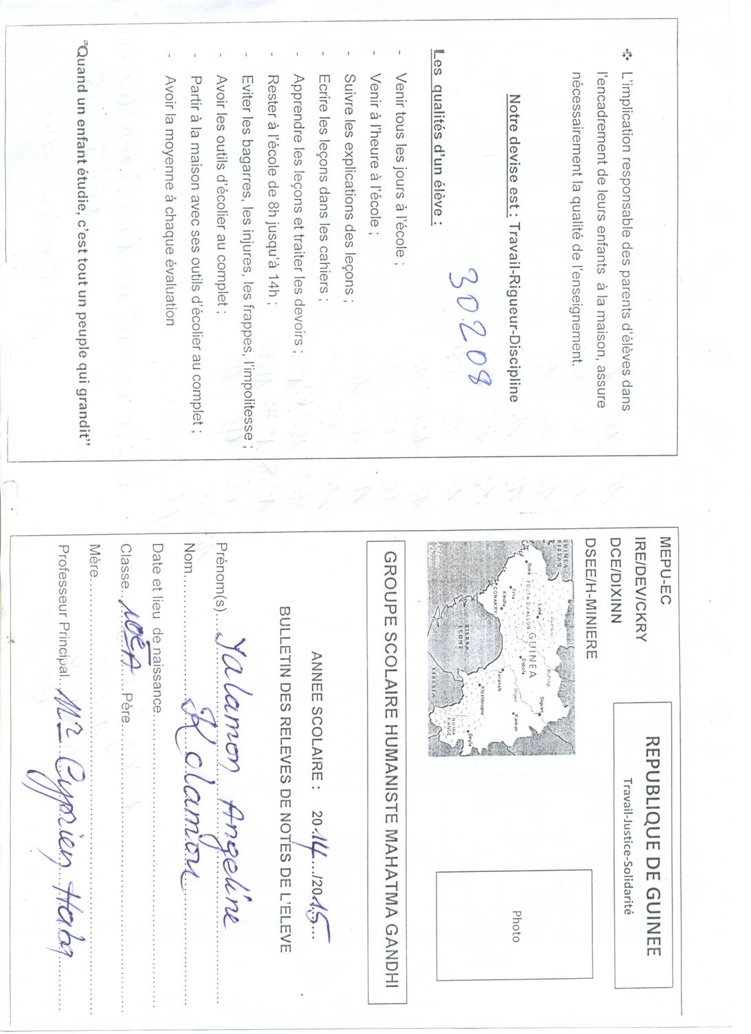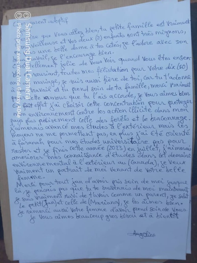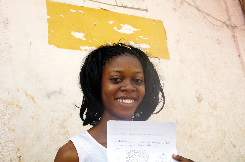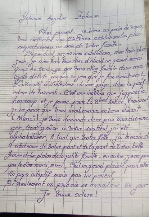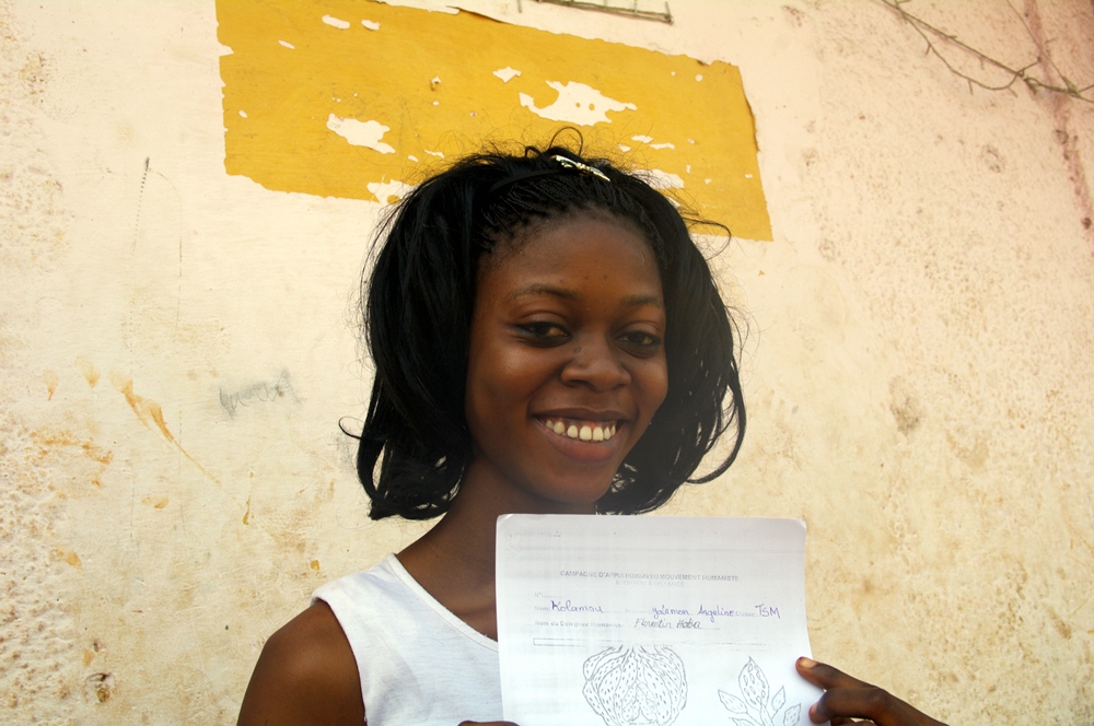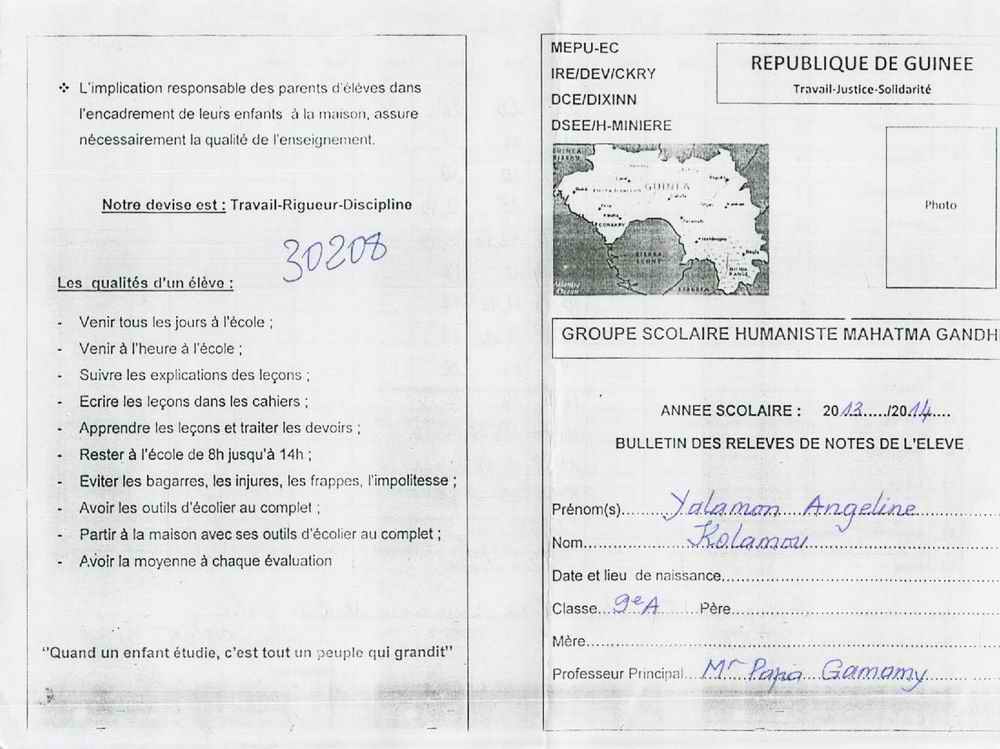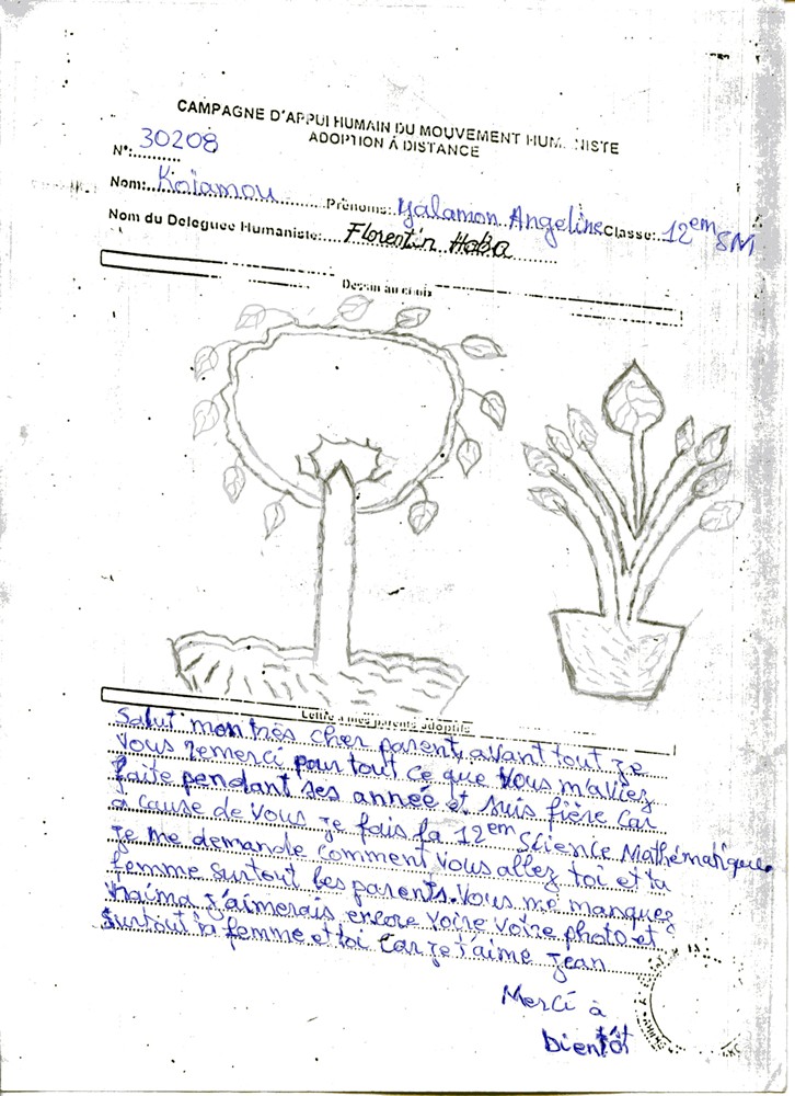 Angeline Yalamo Kolamou byla adoptována v roce 2003 a dnes navštěvuje 1. ročník vysoké školy ve škole Groupe Scolaire Humaniste Mahatma Gandhi - Hafia.