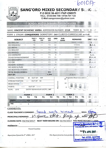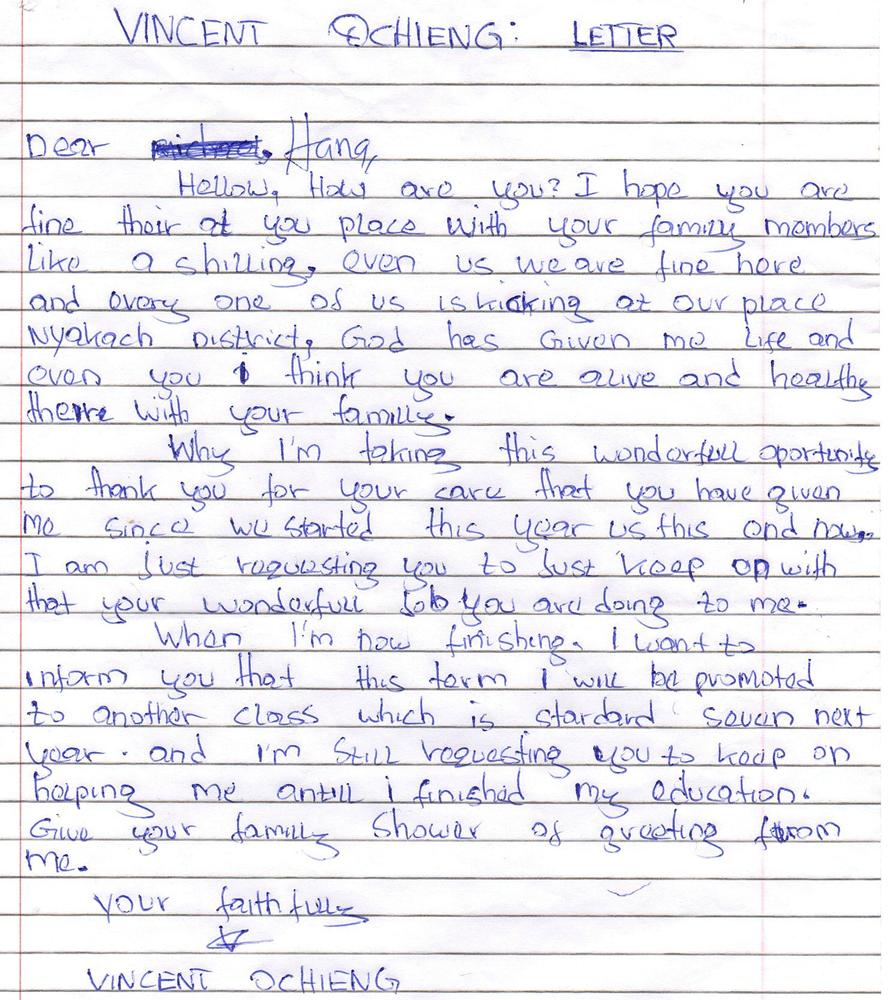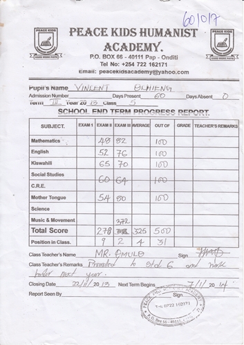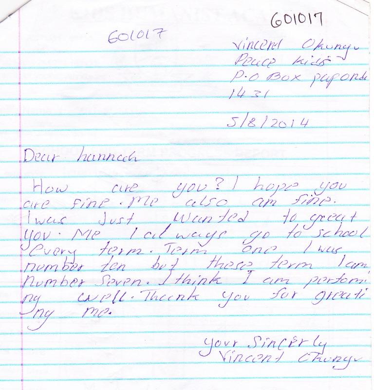 Vincent Otieno Ochieng byl adoptován v roce 2007 a dnes navštěvuje 2. ročník střední školy ve škole Peace Kids Humanist School.