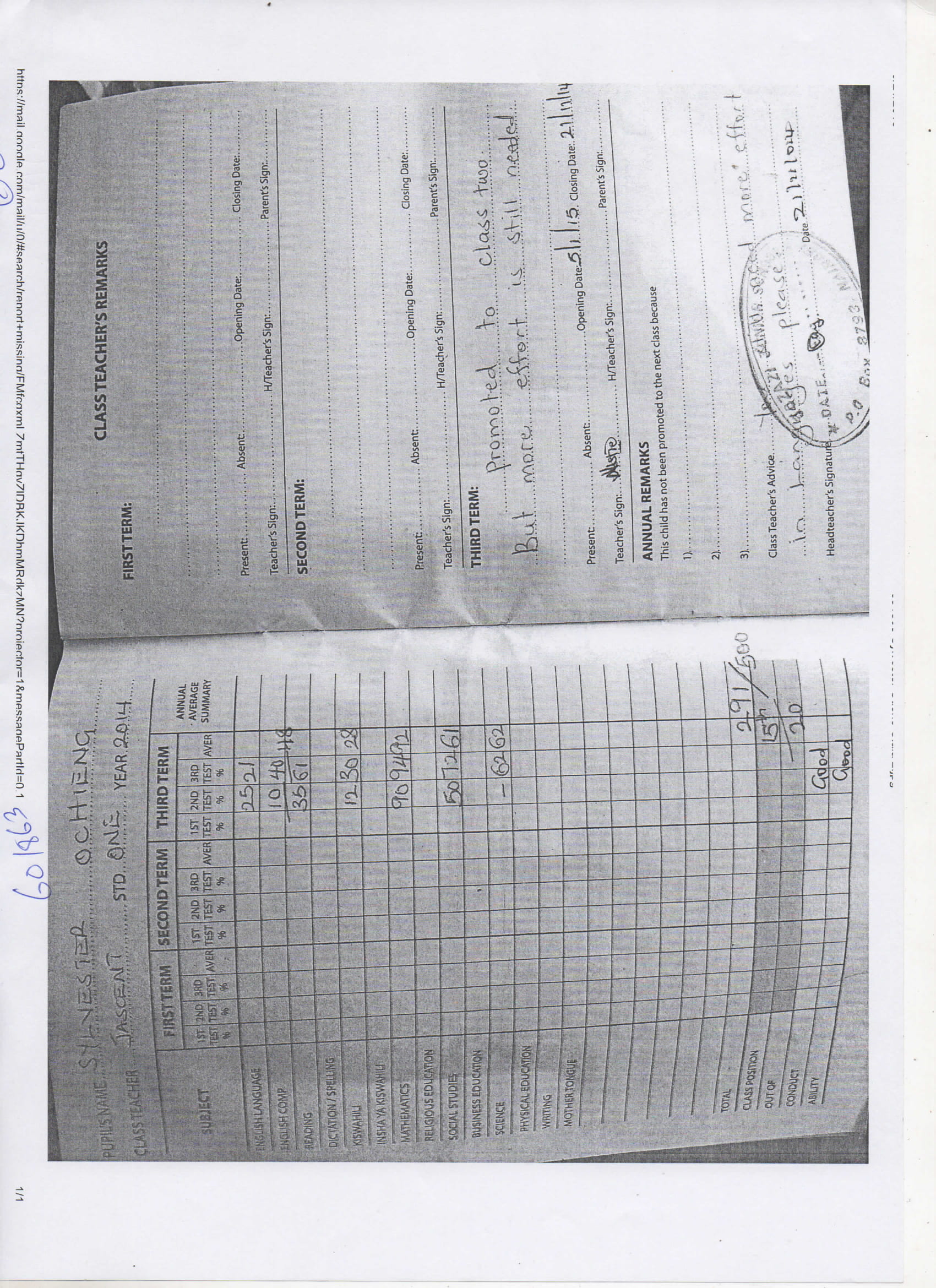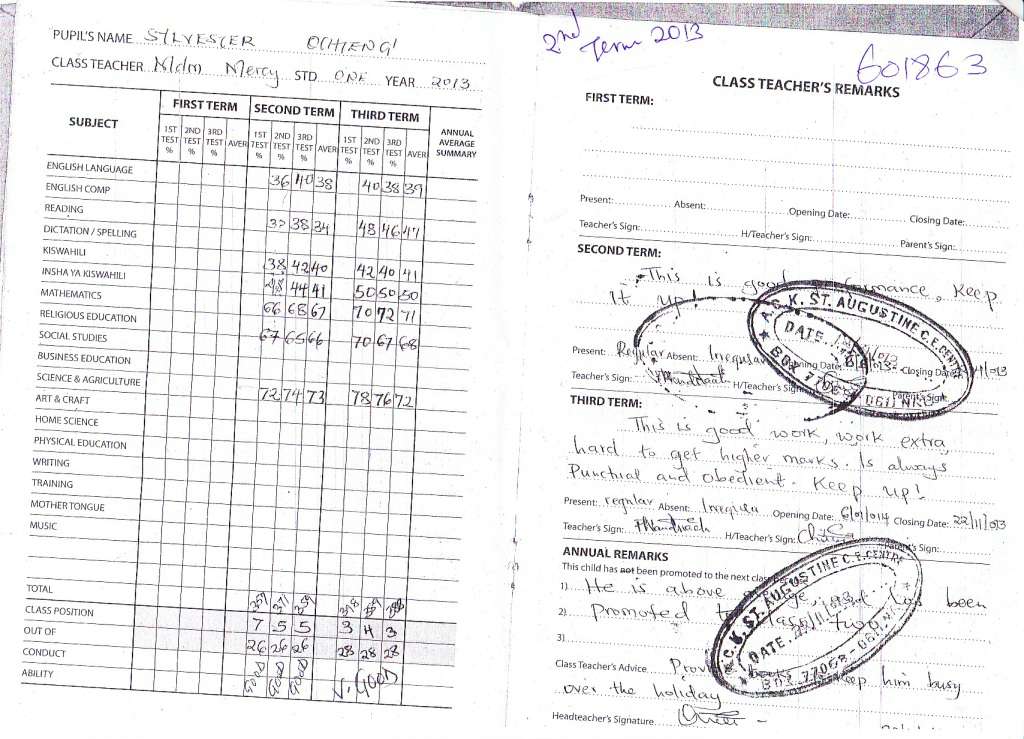 Sylvester Otieno Olala byl adoptován v roce 2008 a dnes navštěvuje 6. třídu ve škole St. Augustine C. E. Centre.