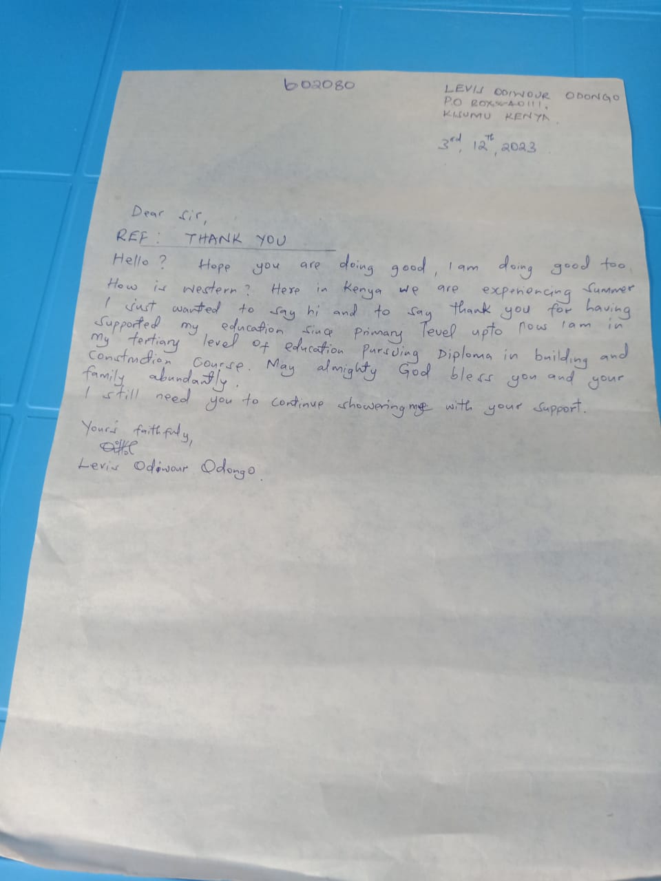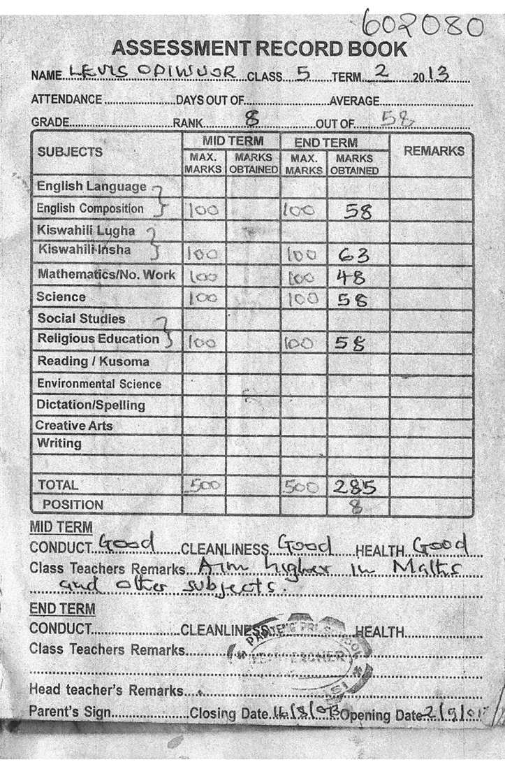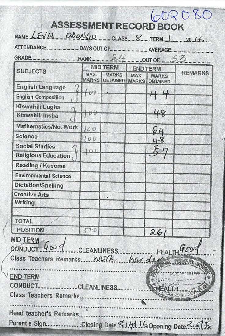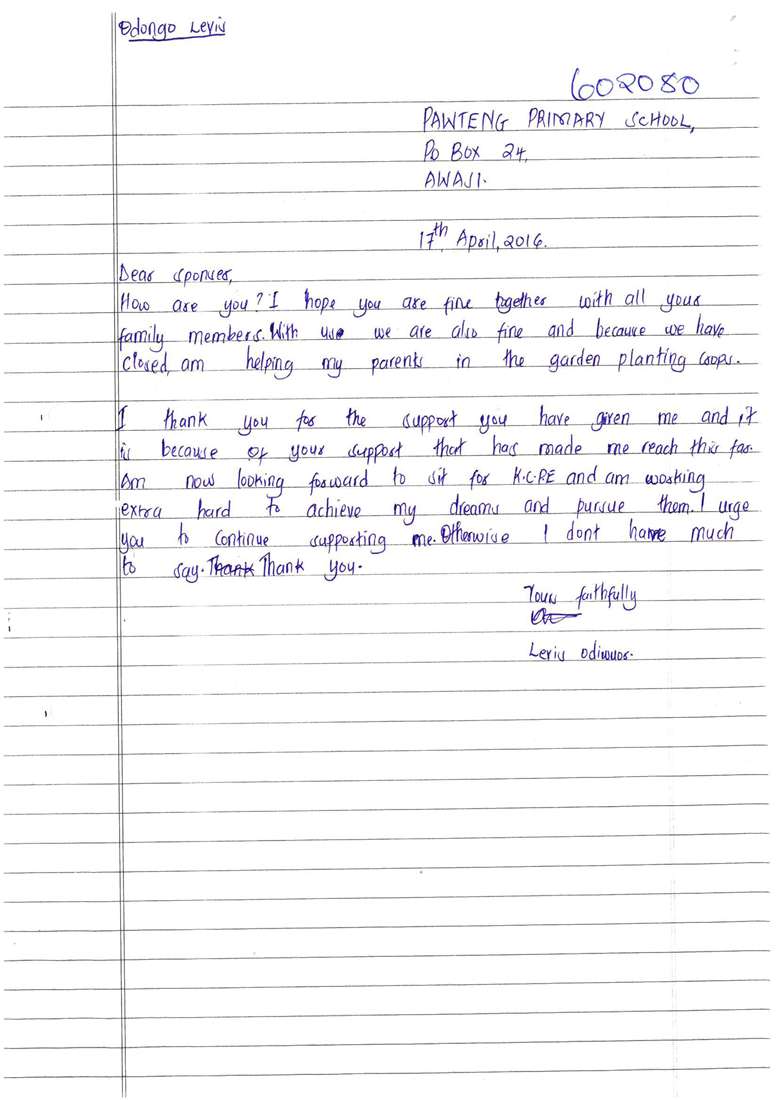 Levis Odiwuor Odongo byl adoptován v roce 2013 a dnes navštěvuje 4. ročník střední školy ve škole SANG' ORO MIXED SECONDARY SCHOOL.