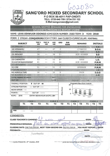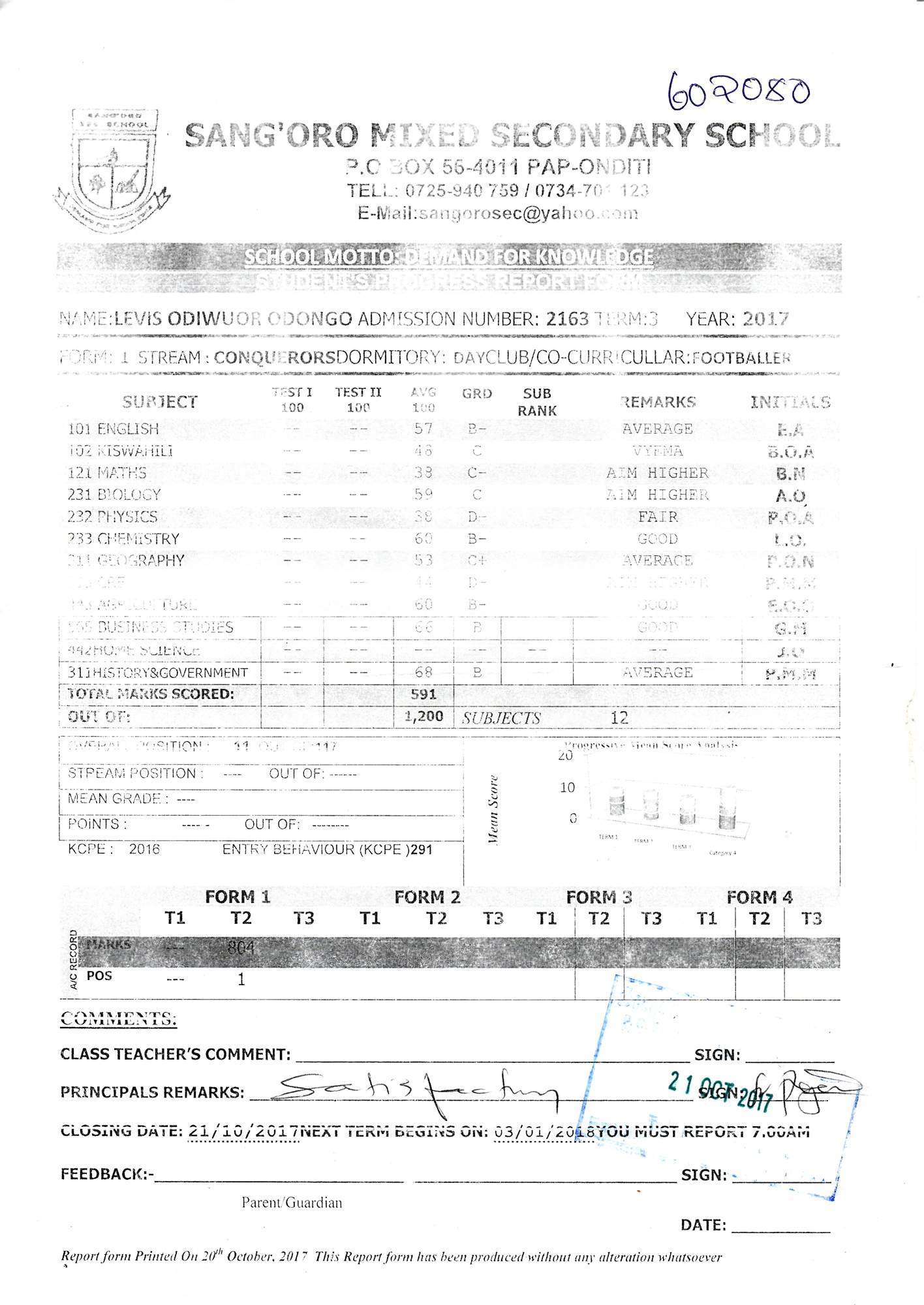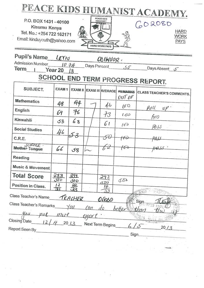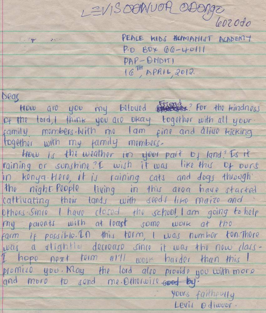 Levis Odiwuor Odongo byl adoptován v roce 2013 a dnes navštěvuje 4. ročník střední školy ve škole SANG' ORO MIXED SECONDARY SCHOOL.