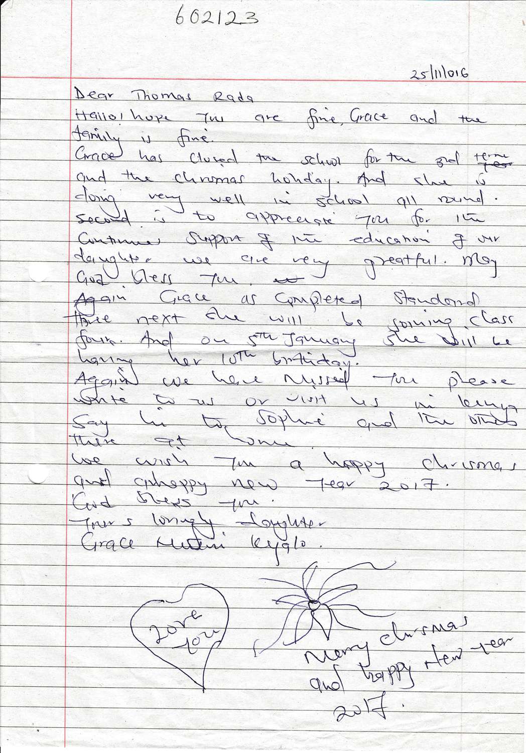 Aby mohlo adoptované dítko začít chodit do školy, musí být uhrazeny peníze za školné alespoň měsíc předem. Tím máme dostatek času převést peníze do Keni a vypsat šek na jméno školy a zaručit jeho doručení do školy - to vše před započetím trimestru. Konkrétně to tedy znamená, že vždy do konce března, července a listopadu musí být na našem účtu 2400 Kč na uhrazení školného na nově začínající trimestr. Adoptivní rodič může platit třikrát ročně nebo jednorázově na celý rok a záleží to čistě na jeho rozhodnutí a možnostech.