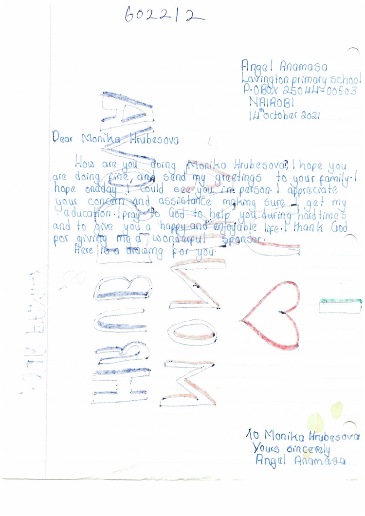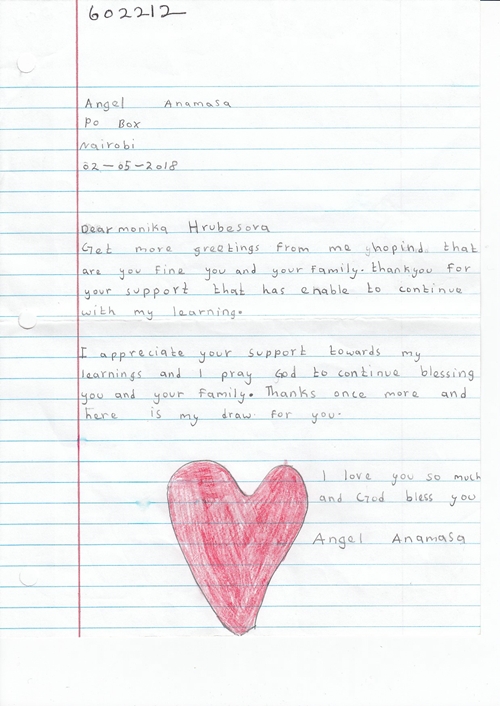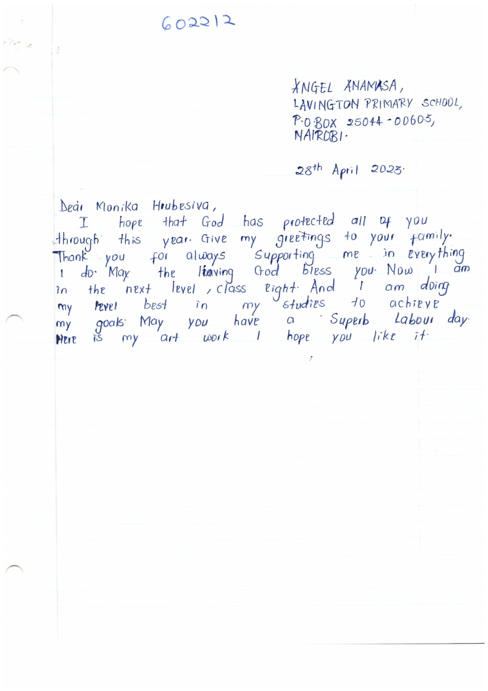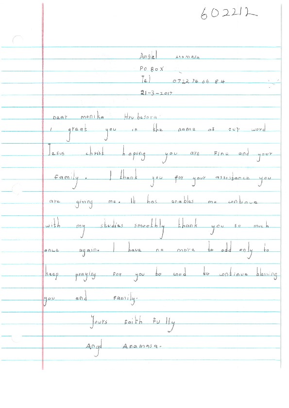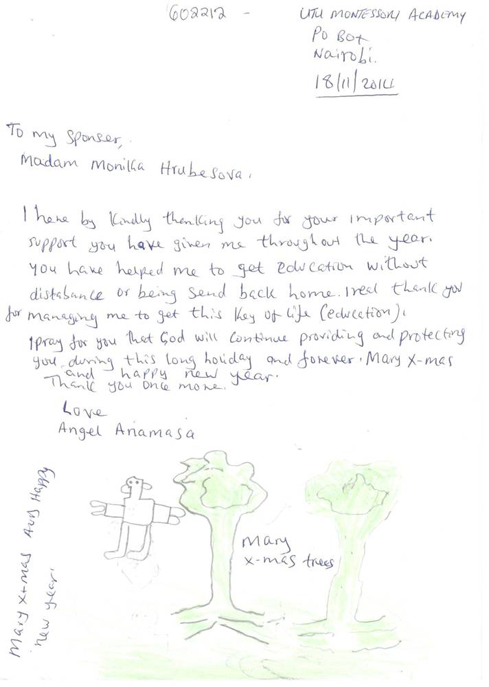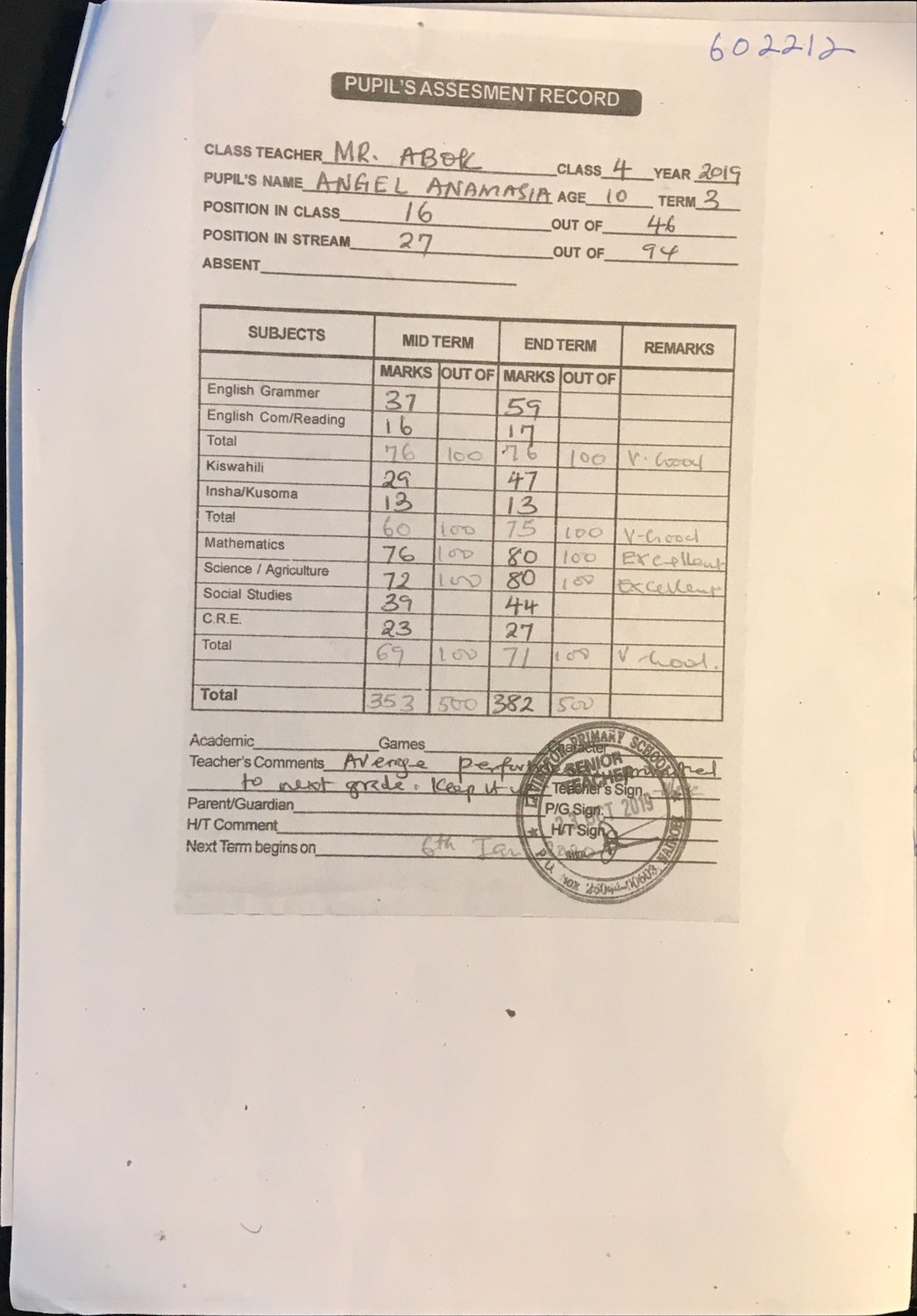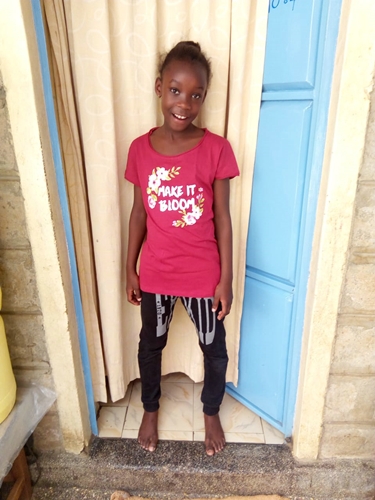 Popis situace: Dívka navštěvuje naše studijní centrum. Její matka se stará o domácnost, zatímco otec prodává ovoce, aby podpořil svou rodinu. Angel má jednoho bratra, Amstronga Kakali. Angel je ve třídě velmi aktivní a vždy tvrdě pracuje.
