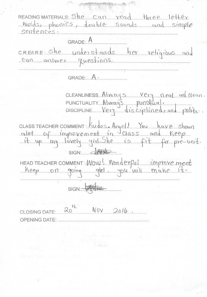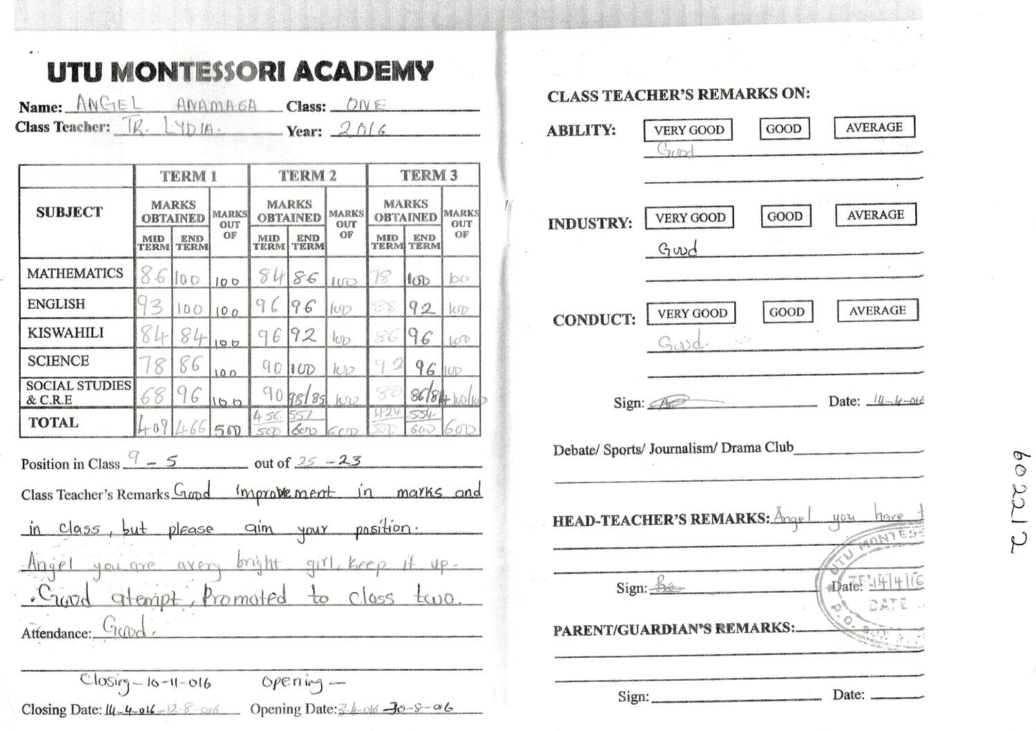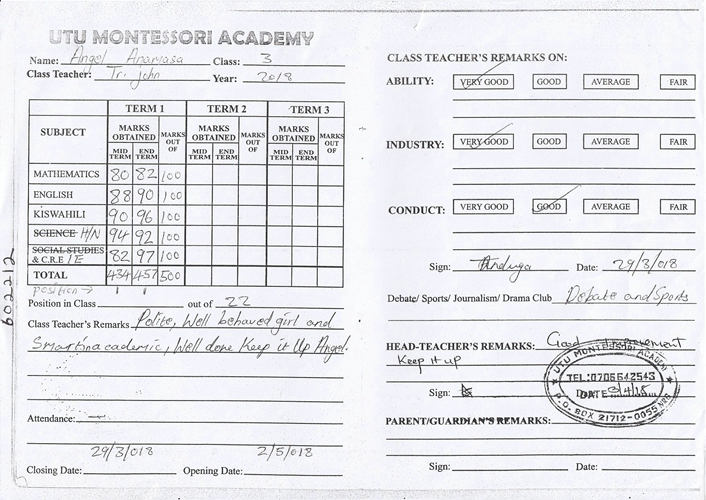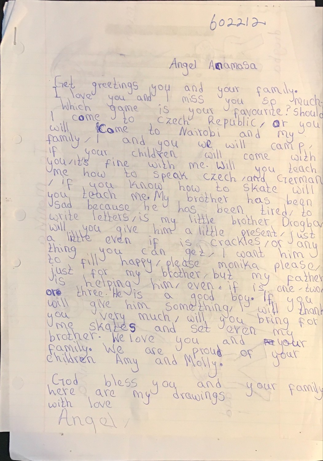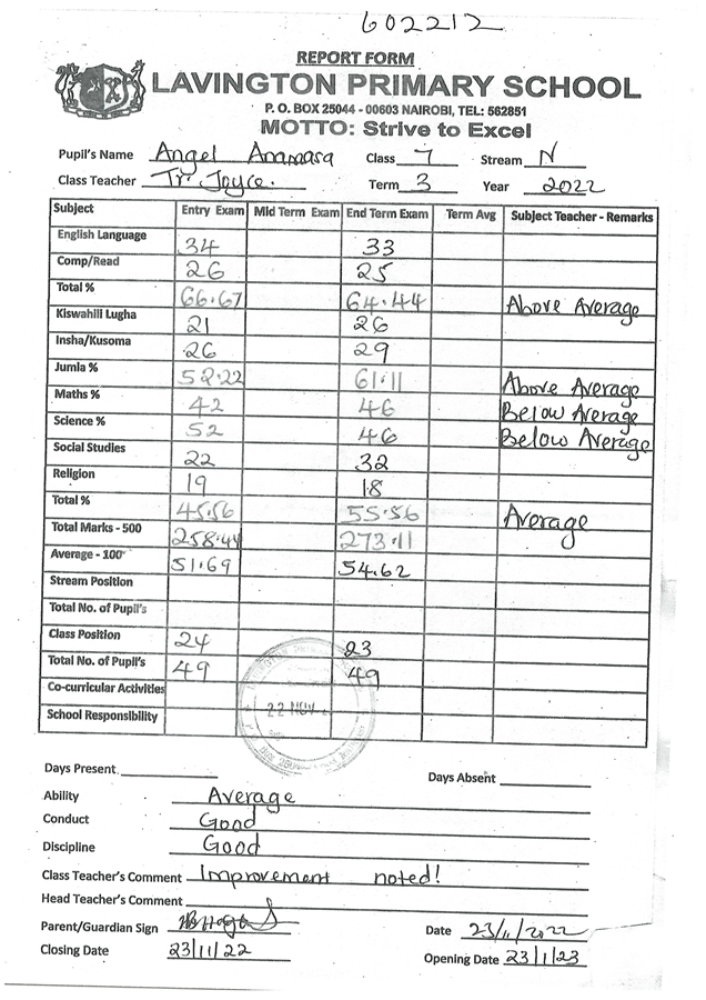 Popis situace: Dívka navštěvuje naše studijní centrum. Její matka se stará o domácnost, zatímco otec prodává ovoce, aby podpořil svou rodinu. Angel má jednoho bratra, Amstronga Kakali. Angel je ve třídě velmi aktivní a vždy tvrdě pracuje.