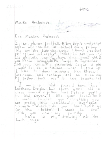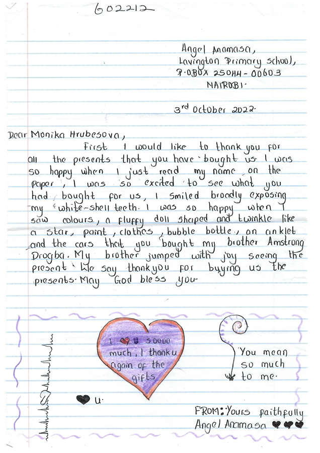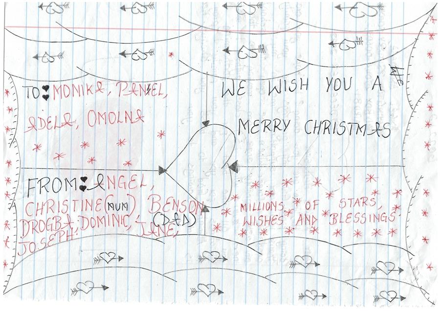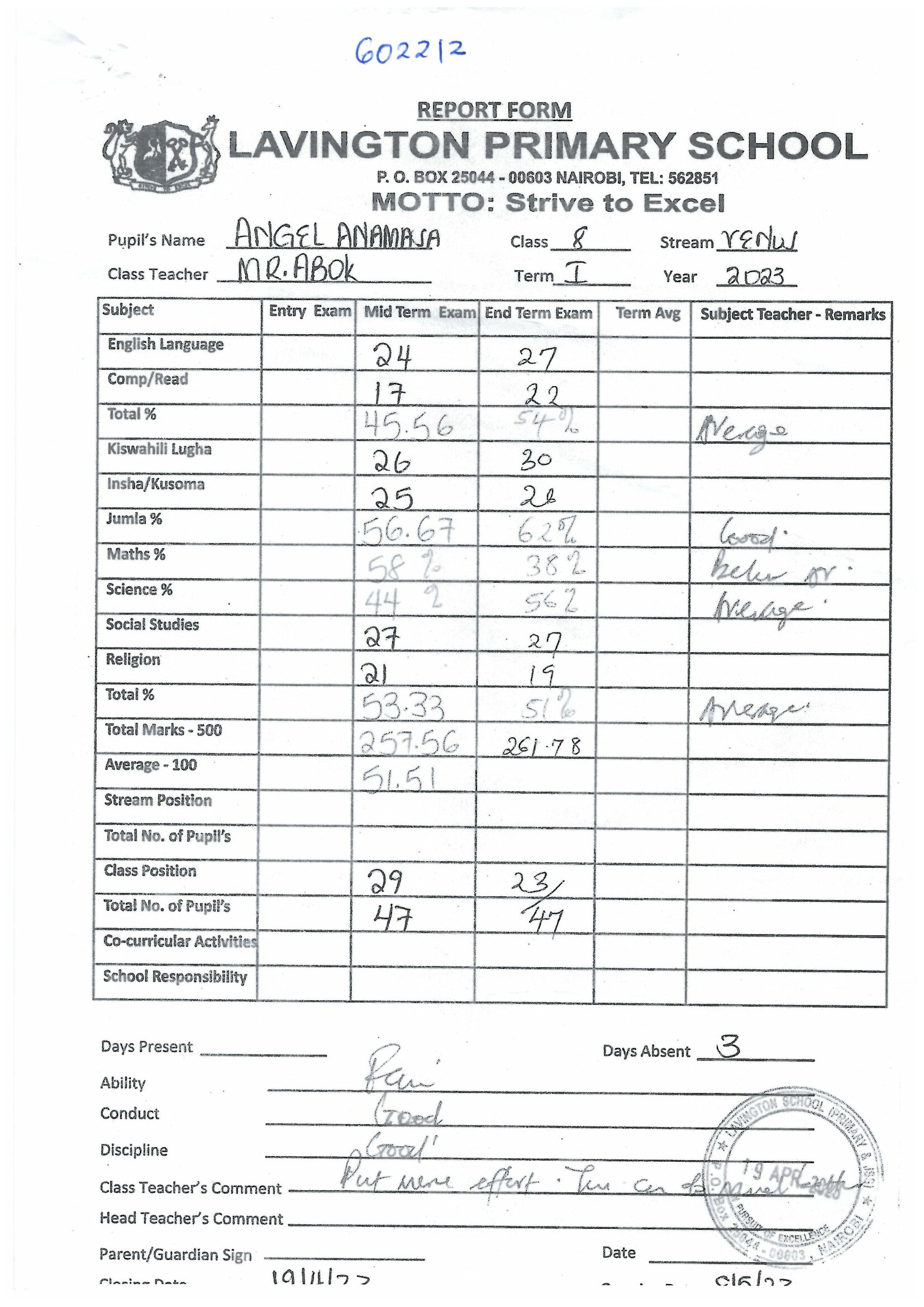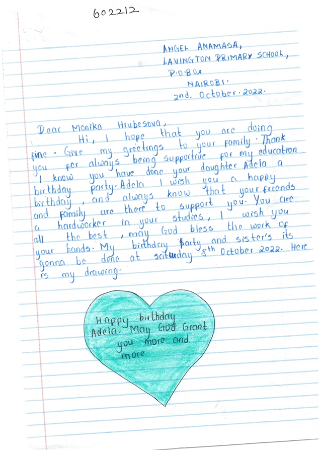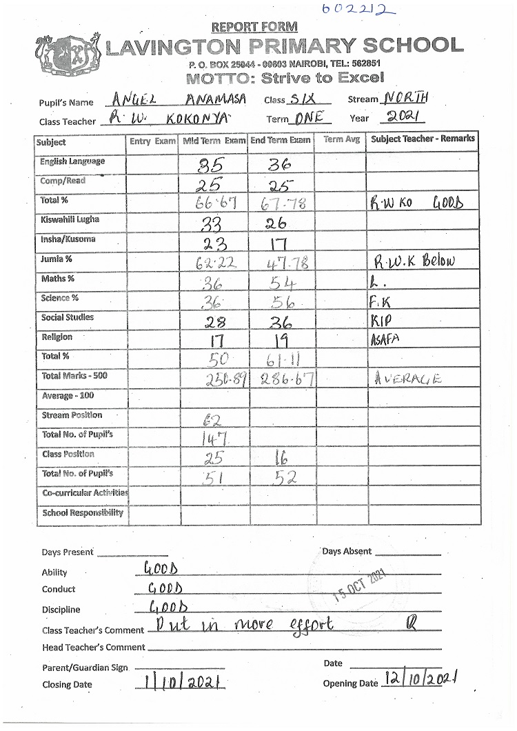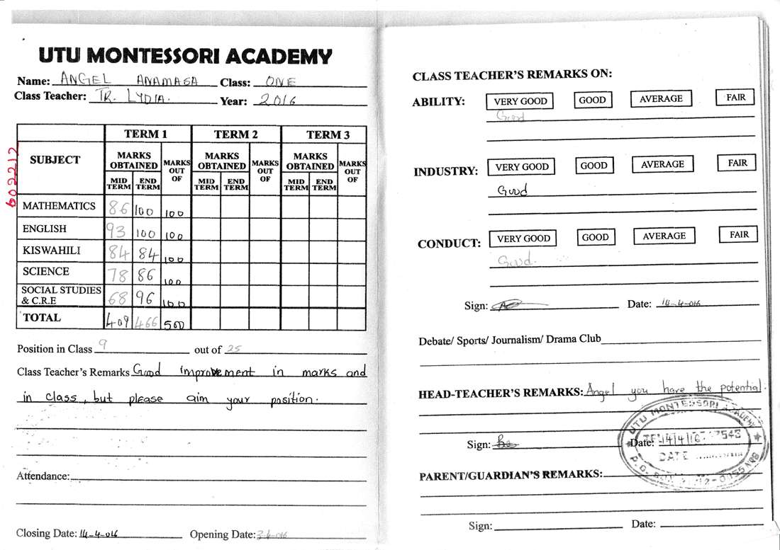 Popis situace: Dívka navštěvuje naše studijní centrum. Její matka se stará o domácnost, zatímco otec prodává ovoce, aby podpořil svou rodinu. Angel má jednoho bratra, Amstronga Kakali. Angel je ve třídě velmi aktivní a vždy tvrdě pracuje.