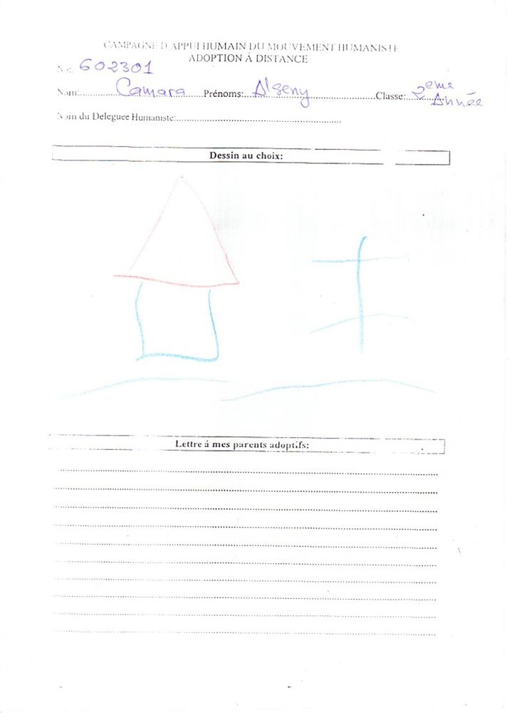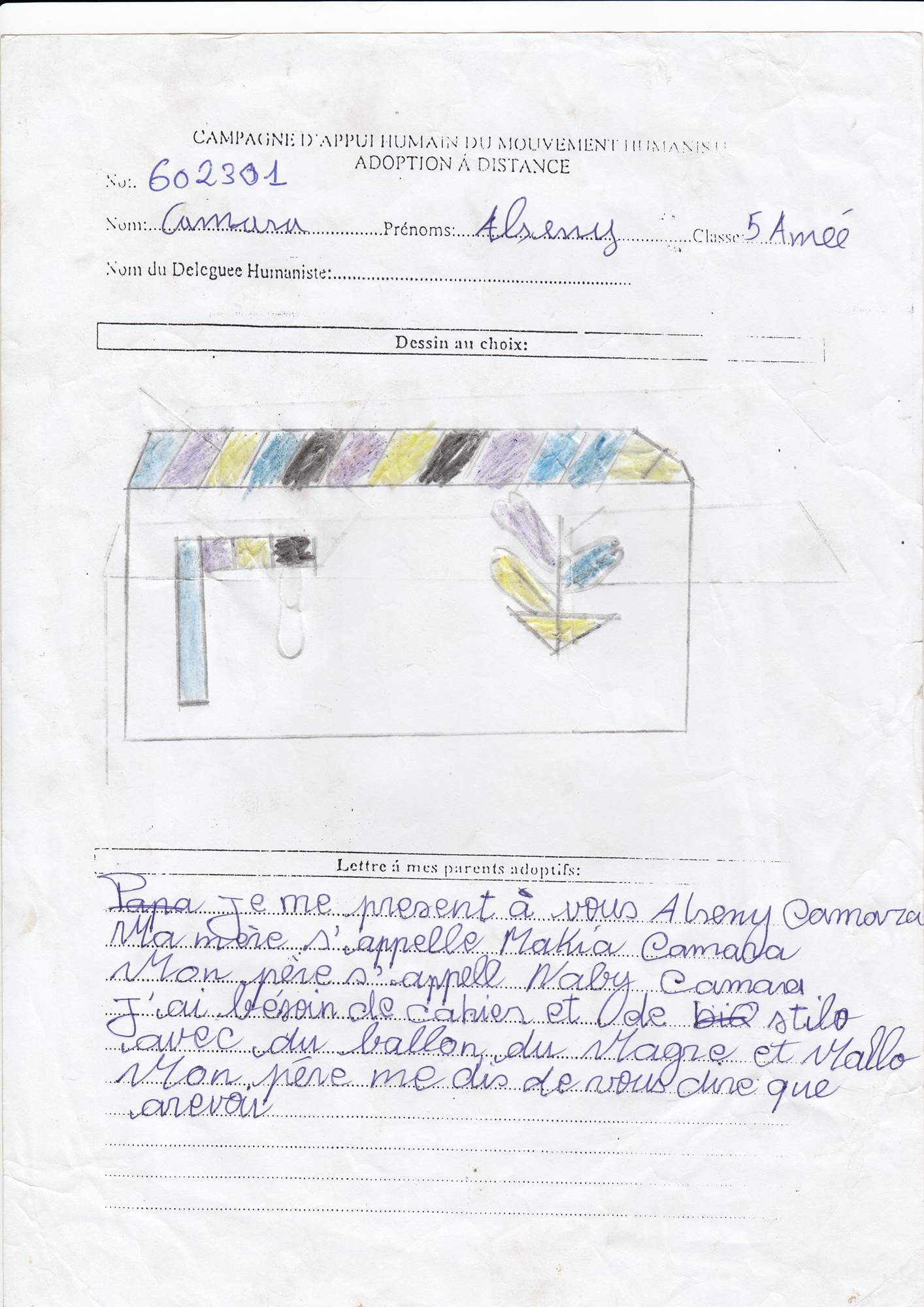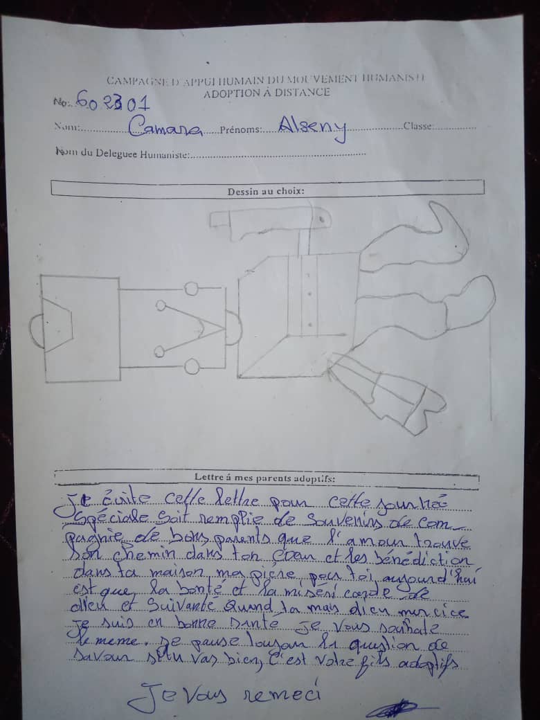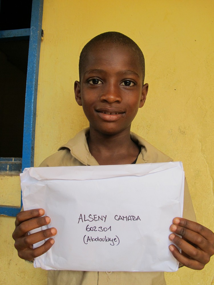Alseny Camara byl adoptován v roce 2014 a dnes navštěvuje 7. třídu ve škole G.S. Humaniste Thomas Sankara (Matam Lido).
