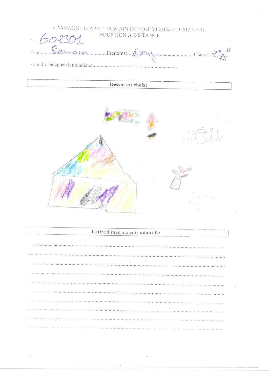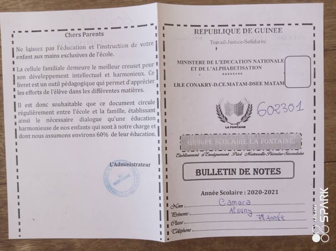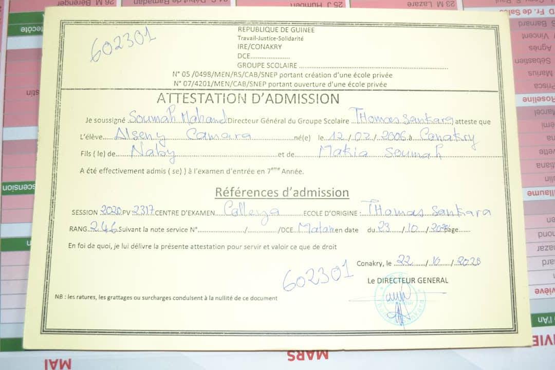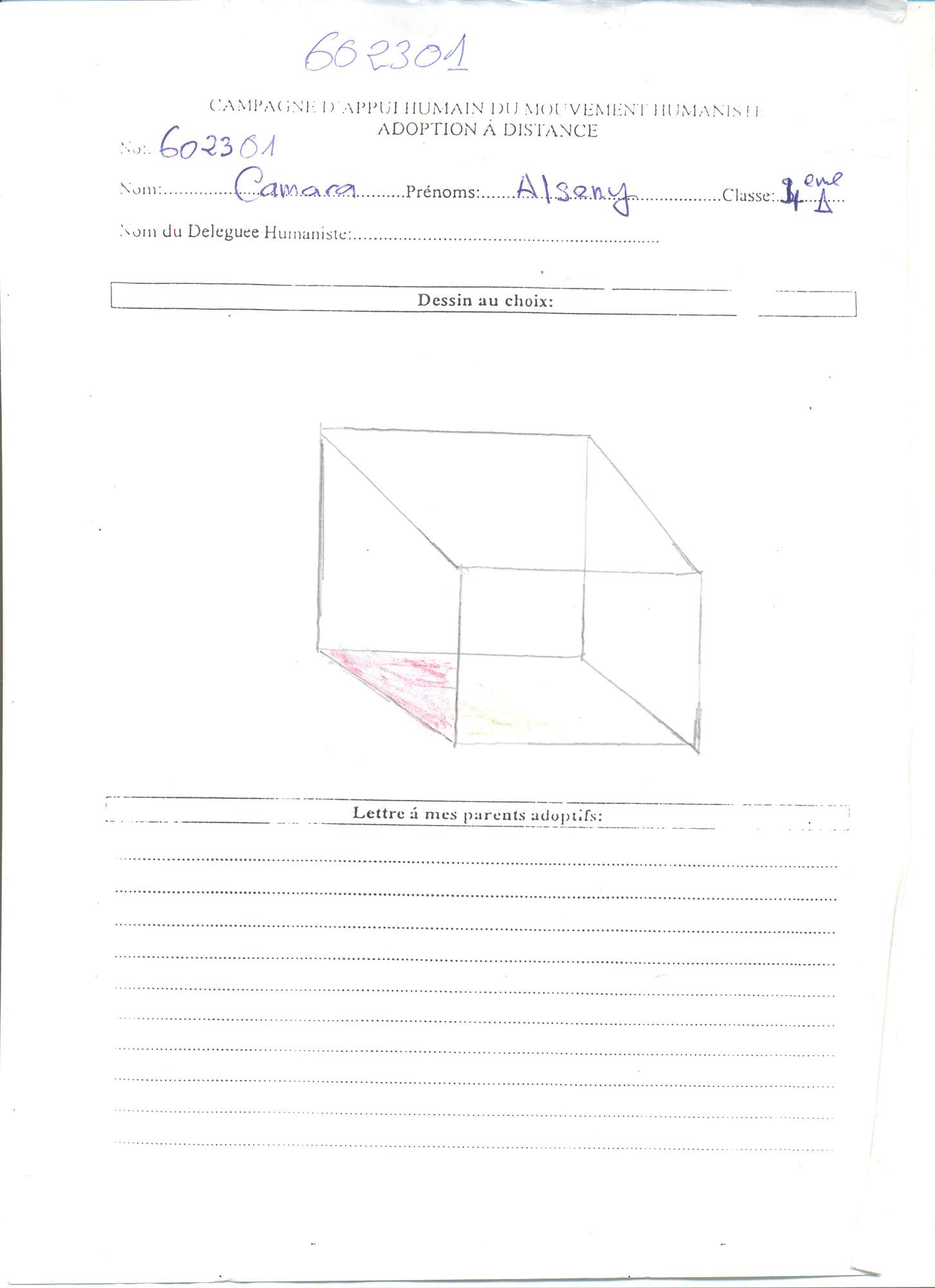 Alseny Camara byl adoptován v roce 2014 a dnes navštěvuje 7. třídu ve škole G.S. Humaniste Thomas Sankara (Matam Lido).