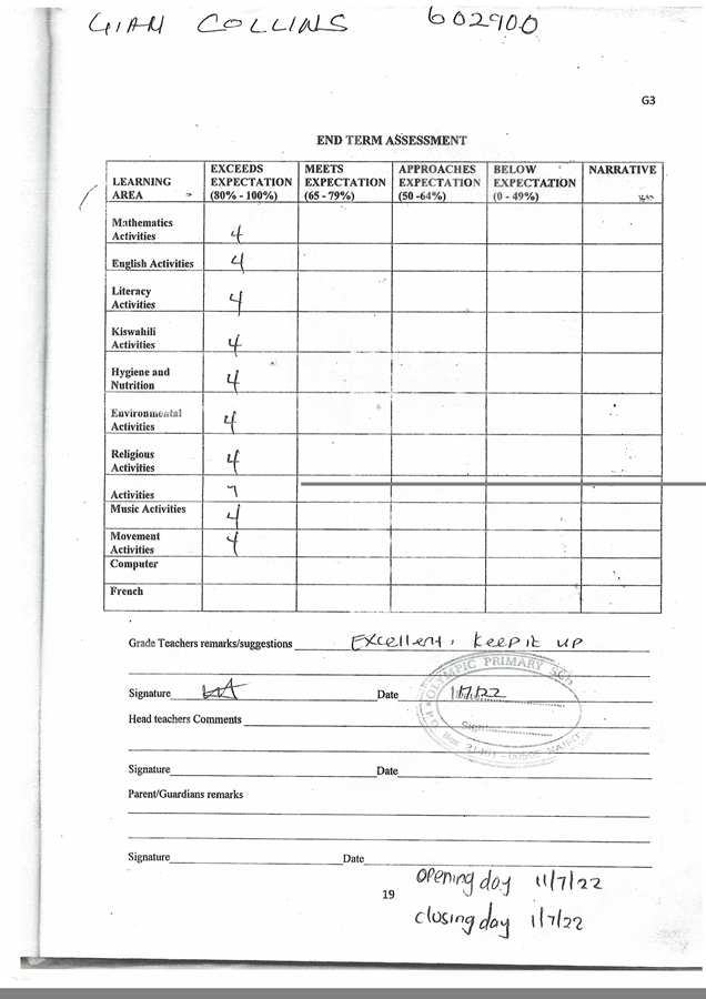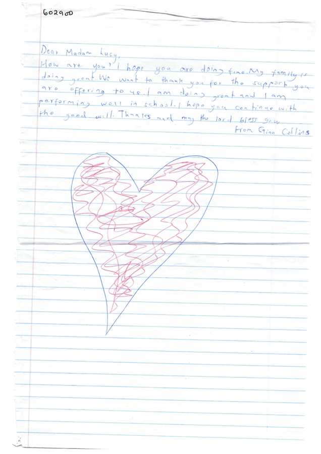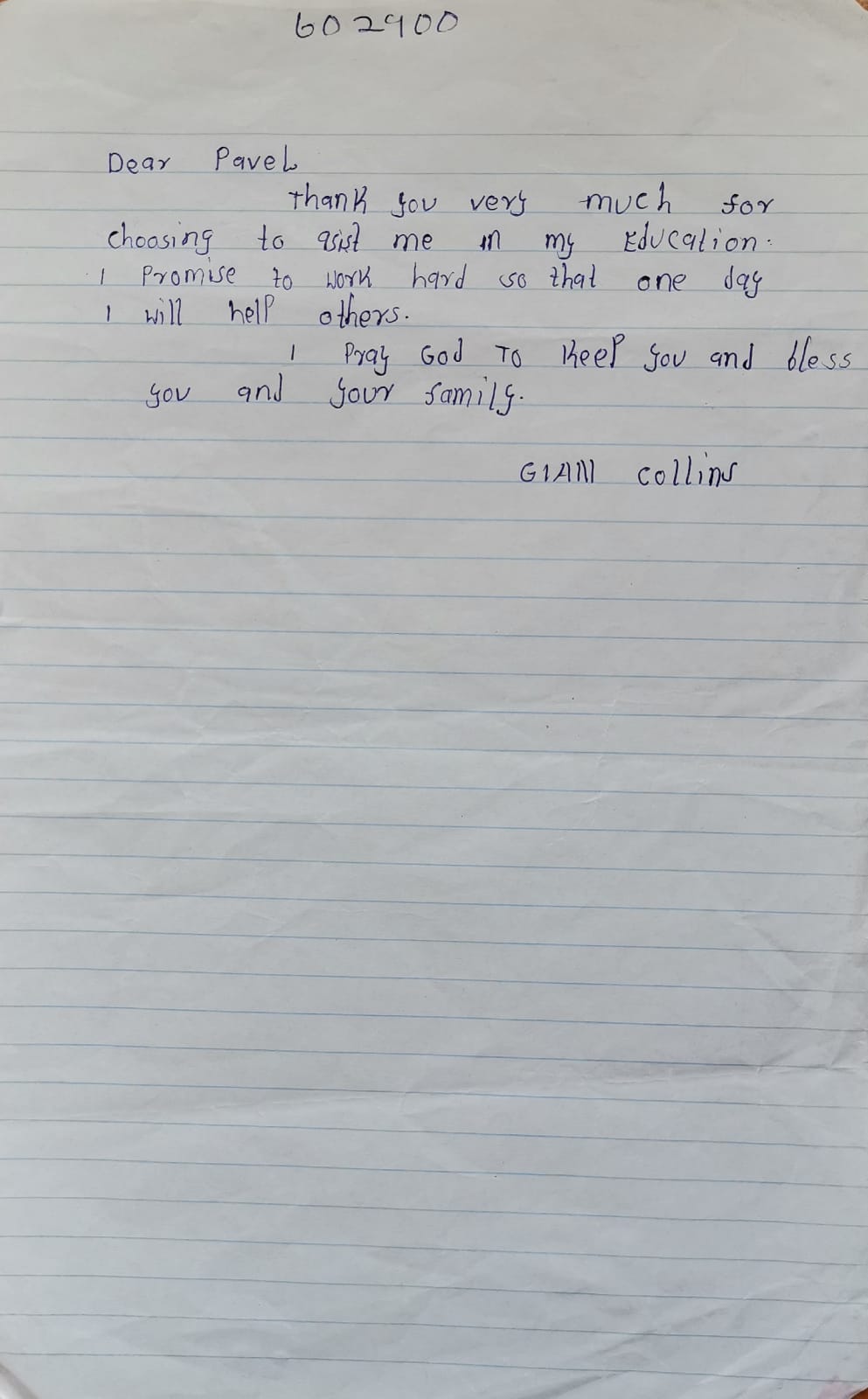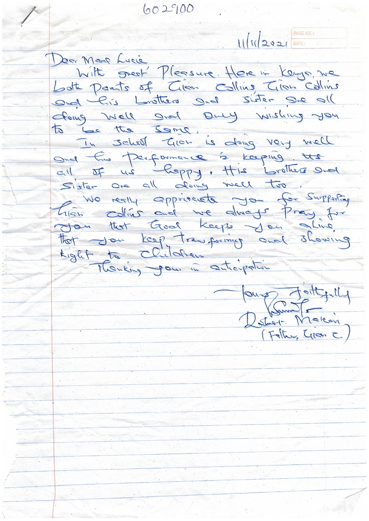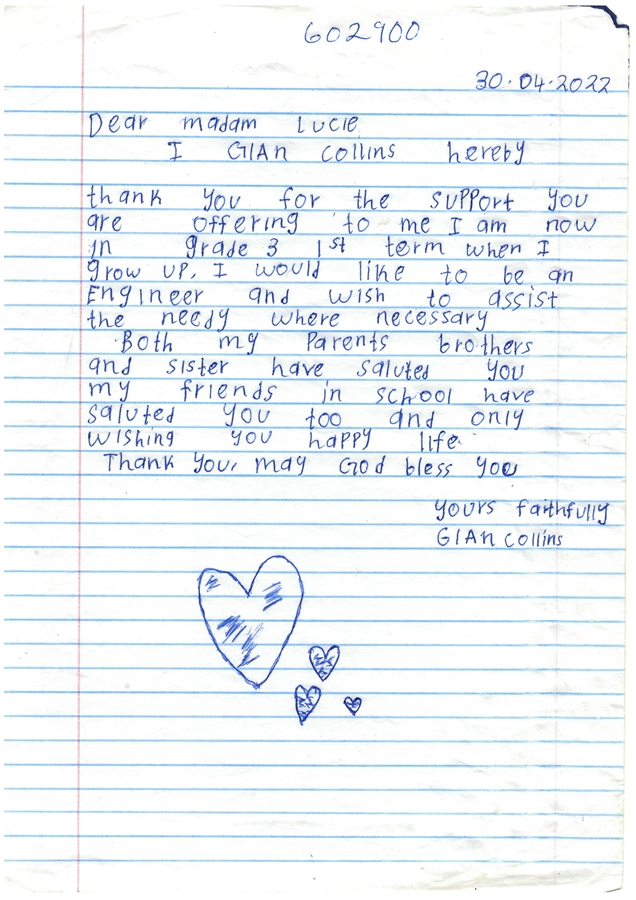 Gian Collins Omwega byl adoptován v roce 2021 a dnes navštěvuje 2. třídu ve škole Olympic Primary School.