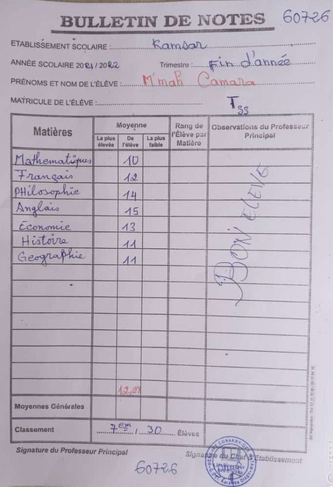 M'mah Camara byla adoptována v roce 2007 a dnes navštěvuje 3. ročník střední školy ve škole G.S.P. Elhadj Karamba Diaby (Matam).
