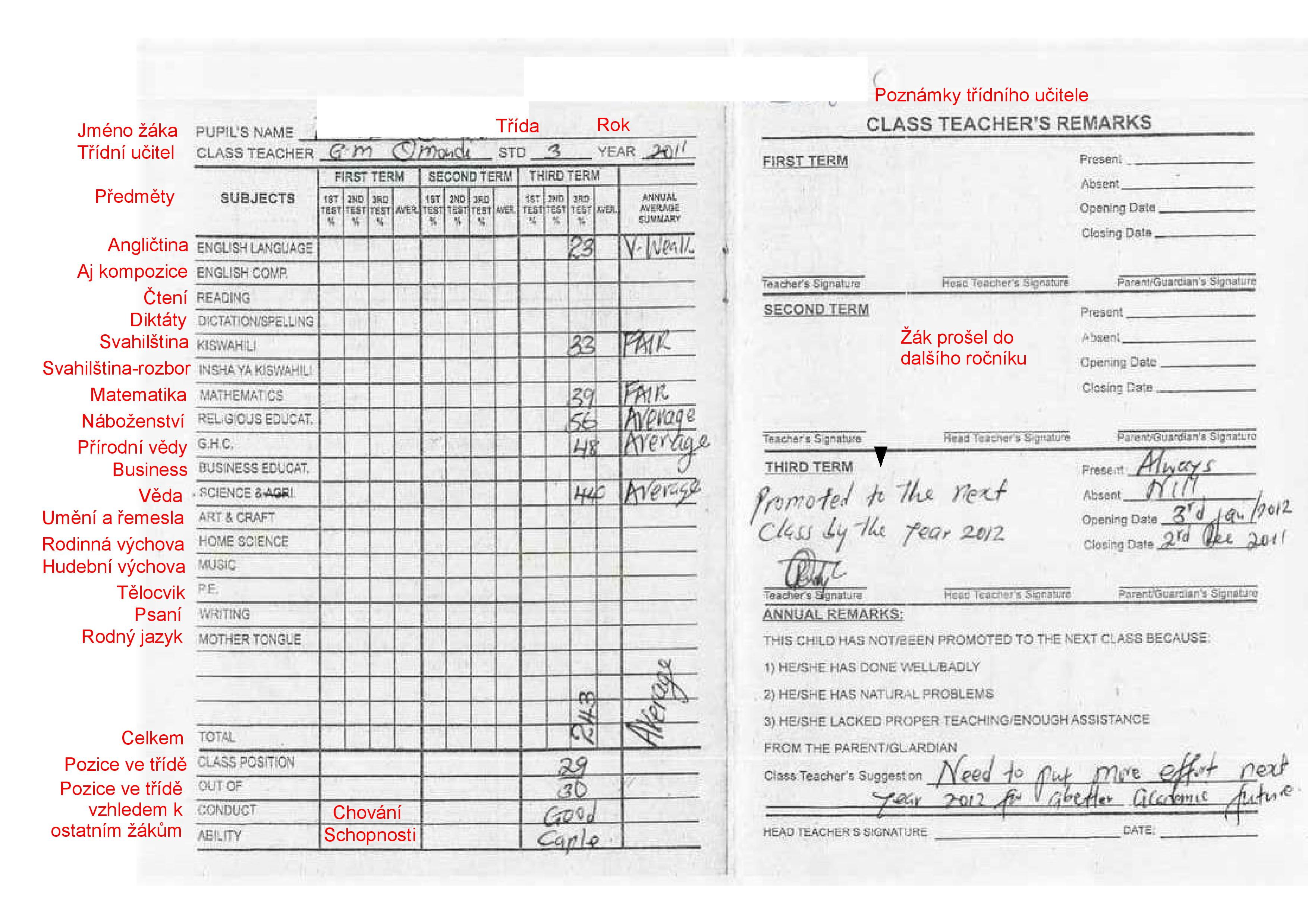V Keni probíhá hodnocení prostřednictvím systému procent. Dítě dostane procentuální ohodnocení své práce a od něj se poté odvíjí známka (A, B, C, D, F). „A“ je nejlepší, „F“ je známka nejhorší, která může zapříčinit opakování ročníku. Někdy se výsledky vyjadřují pouze v procentech, kdy 100% je samozřejmě nejlepší. Některé školy mají ale zavedený vlastní bodový systém. V tu chvíli je fajn se podívat na kolonku “rank” tzn. Pozici dítěte v ročníku, či ve třídě. Je zde vždy uvedeno, že dítě je např. 21 z 80.