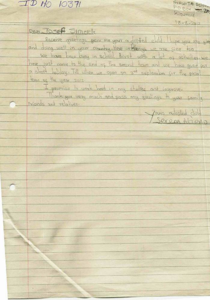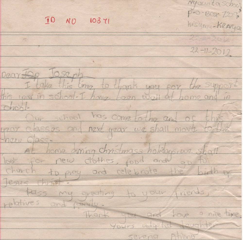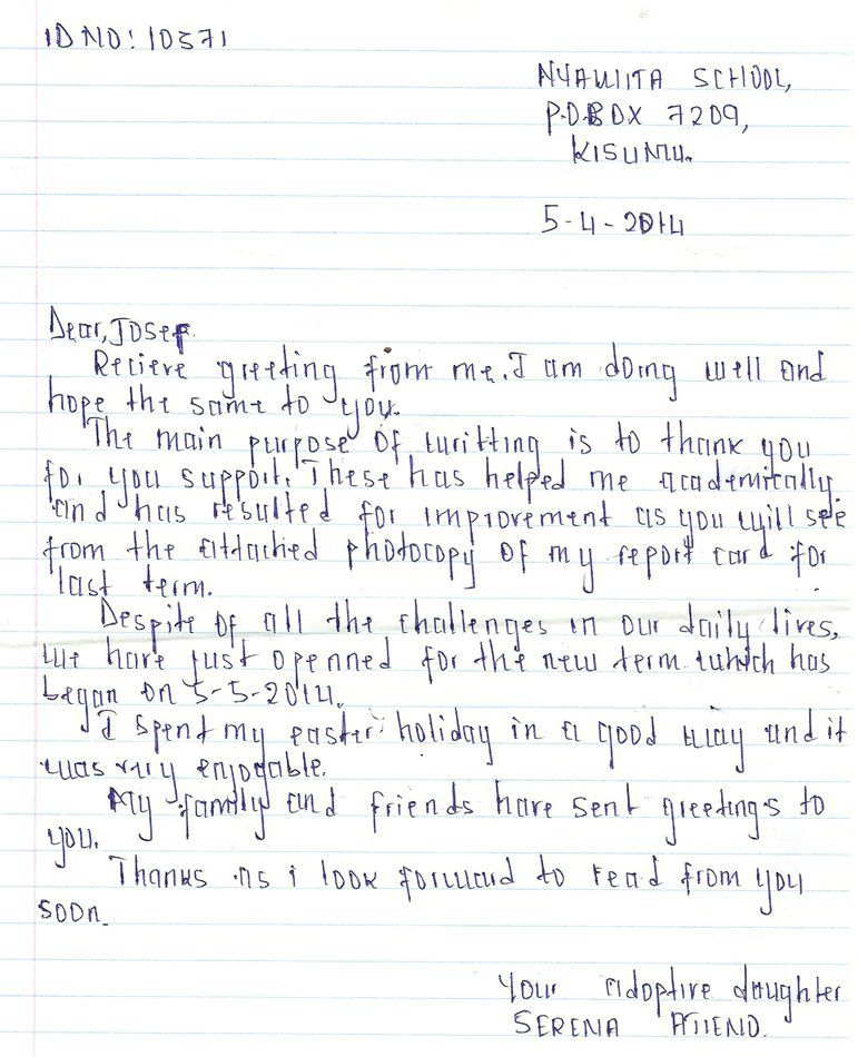 Popis situace: Rodina dítěte žije v chudinské čtvrti města Kisumu. Serena má mladšího sourozence. Příjem rodiny závisí od práce rodičů. Práce ale není dost a ak rodina nemůže zabezpečit jídlo, vzdělání, zdravotní starostlivost pro děti
