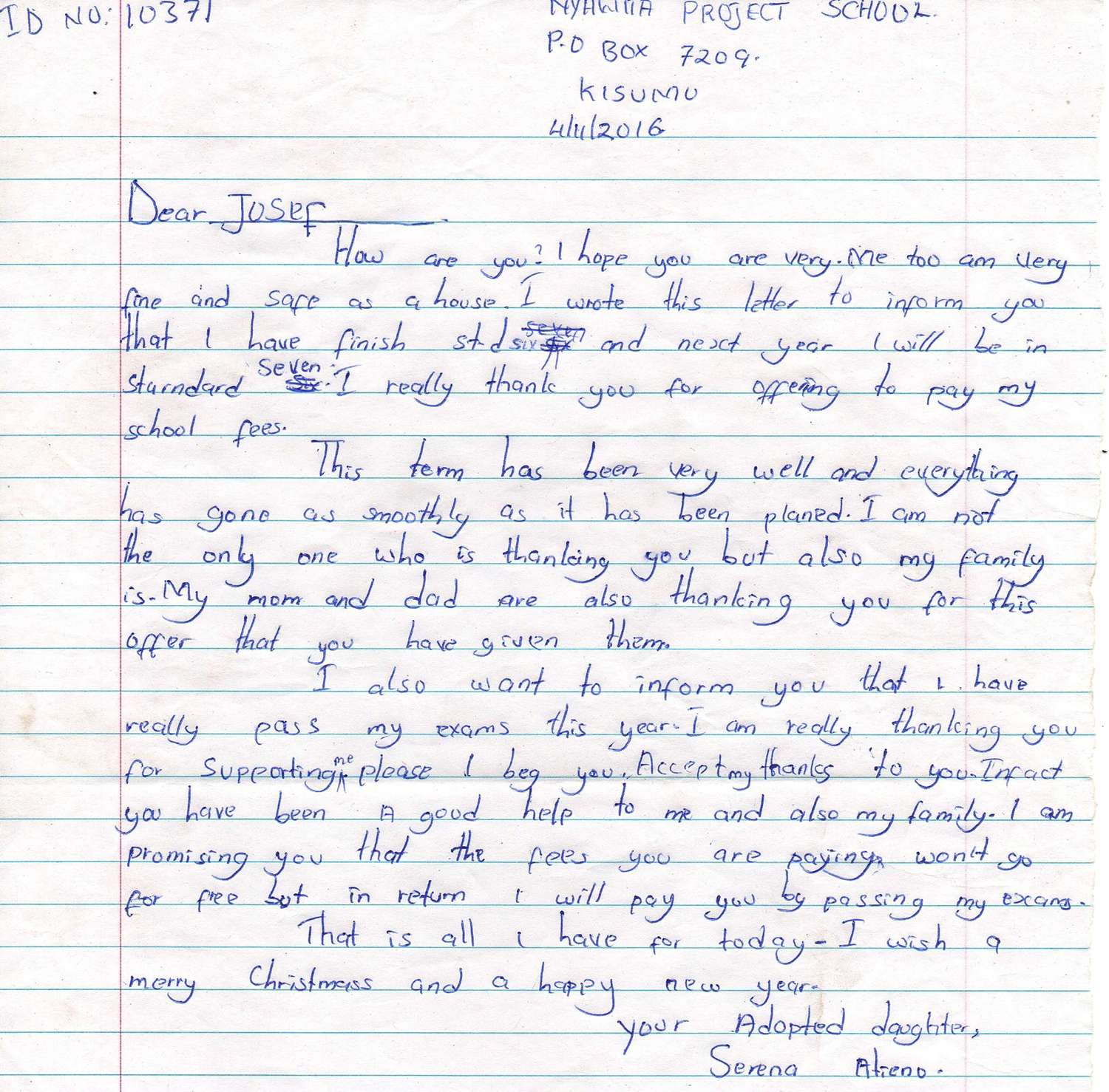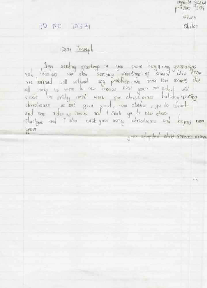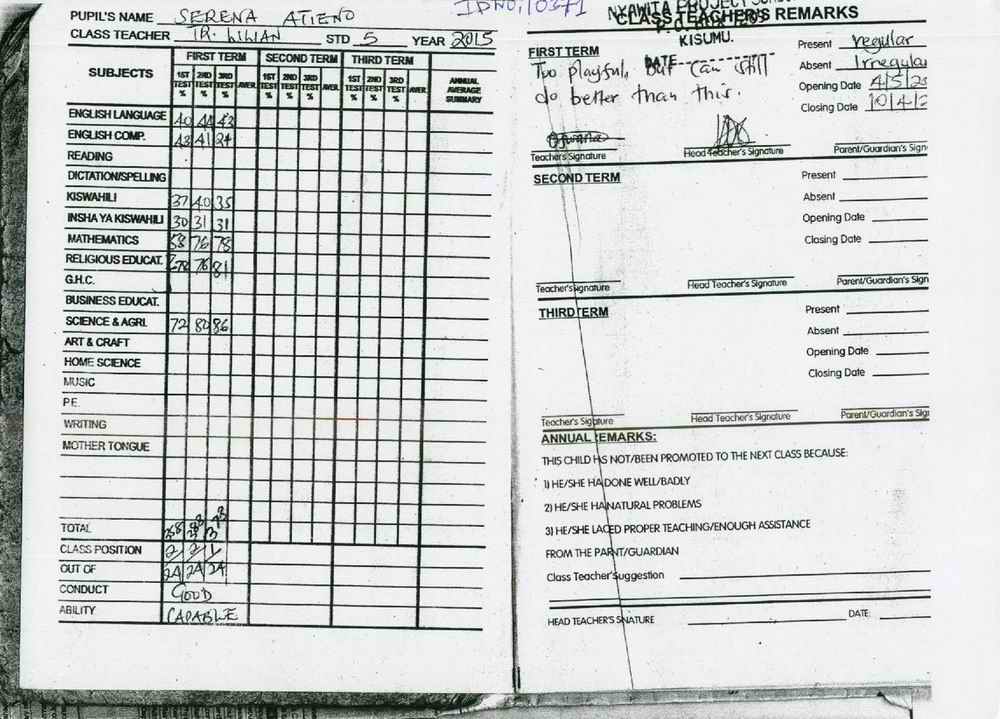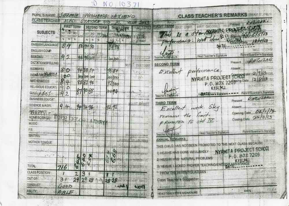 Serena Williams Atieno byla adoptována v roce 2009 a dnes navštěvuje 2. ročník střední školy ve škole Nyawita Primary.