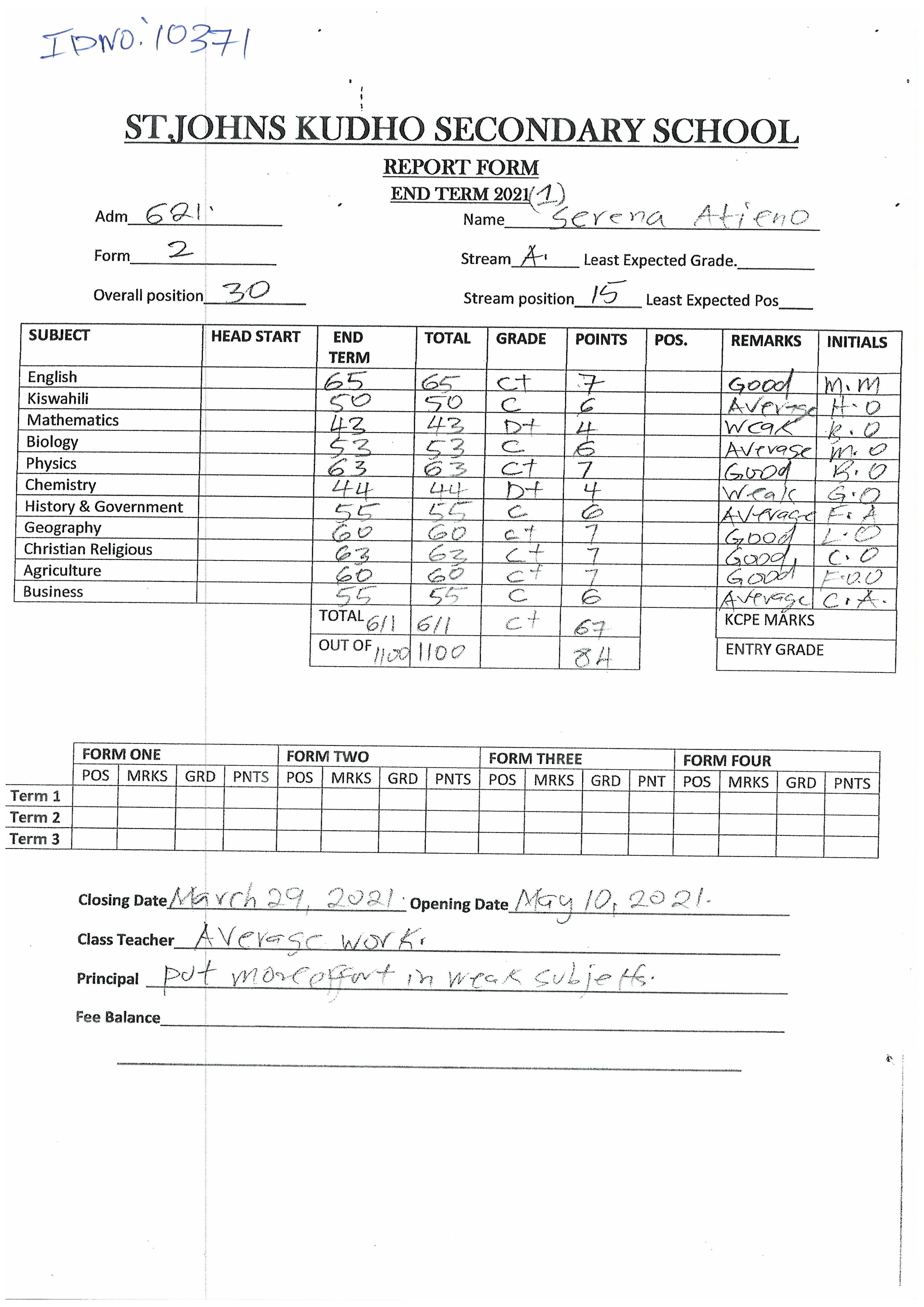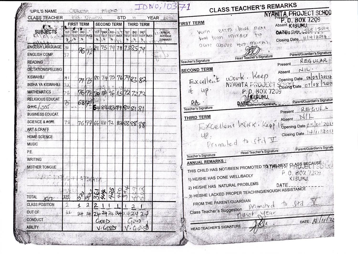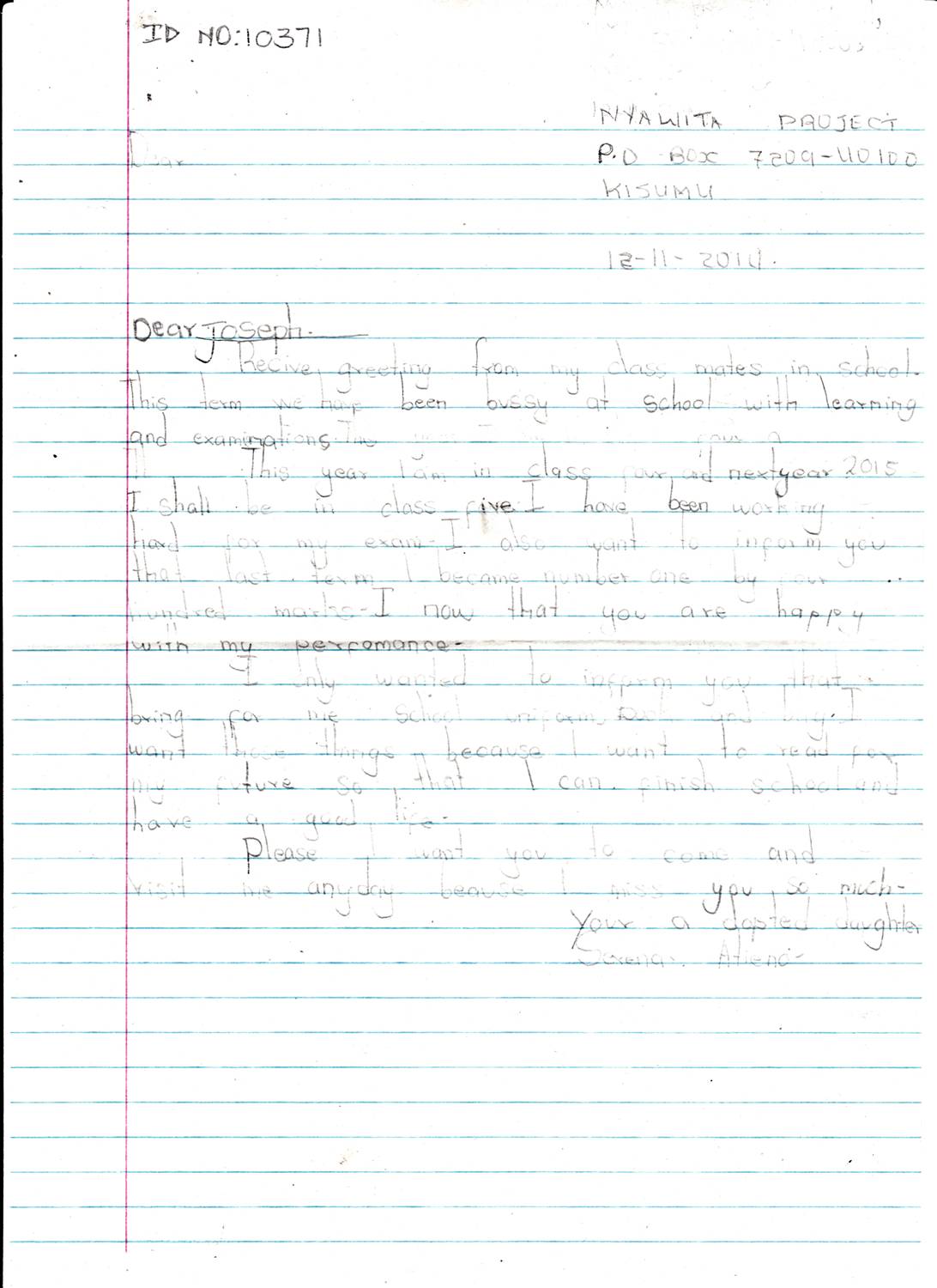 Serena Williams Atieno byla adoptována v roce 2009 a dnes navštěvuje 2. ročník střední školy ve škole Nyawita Primary.