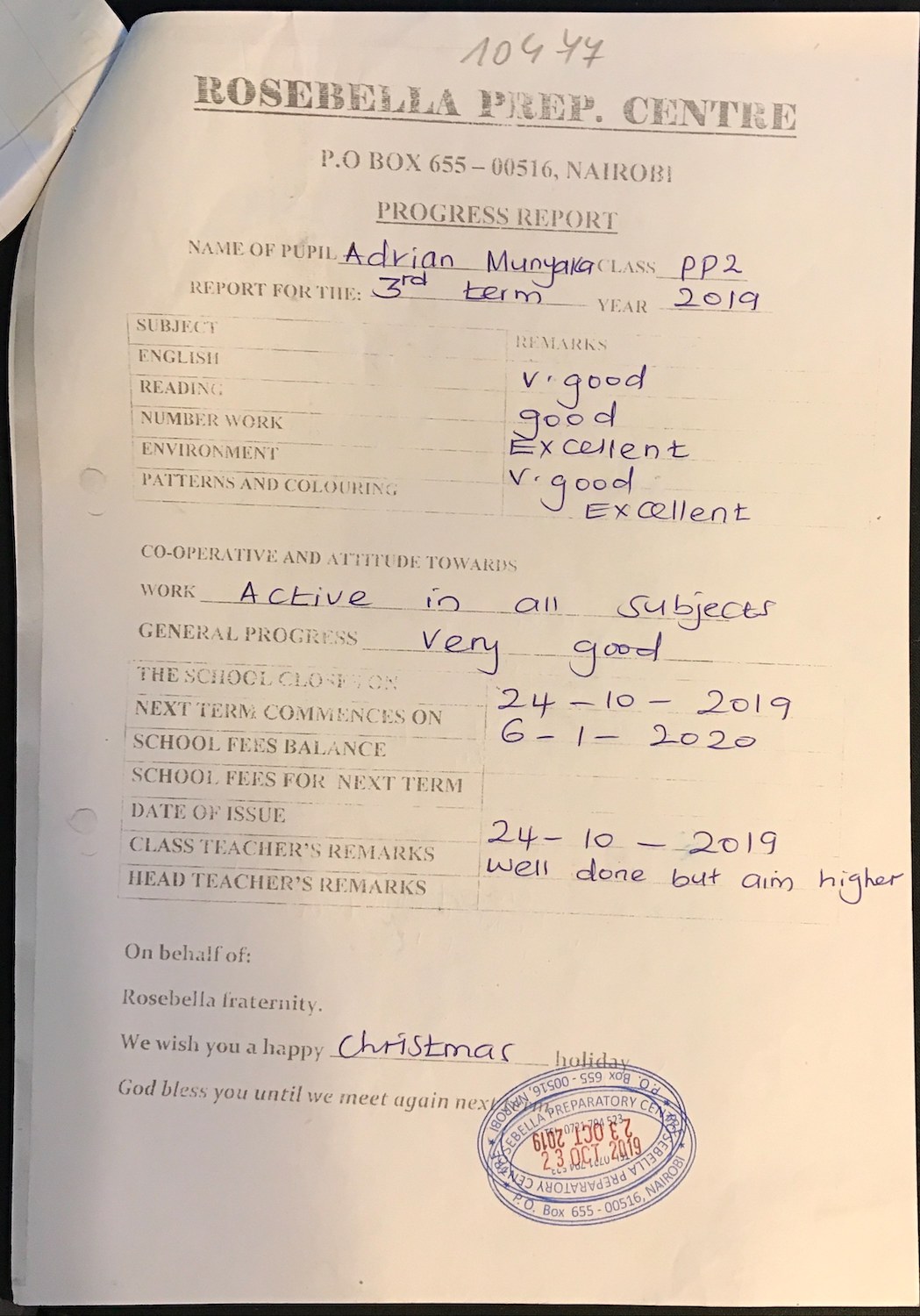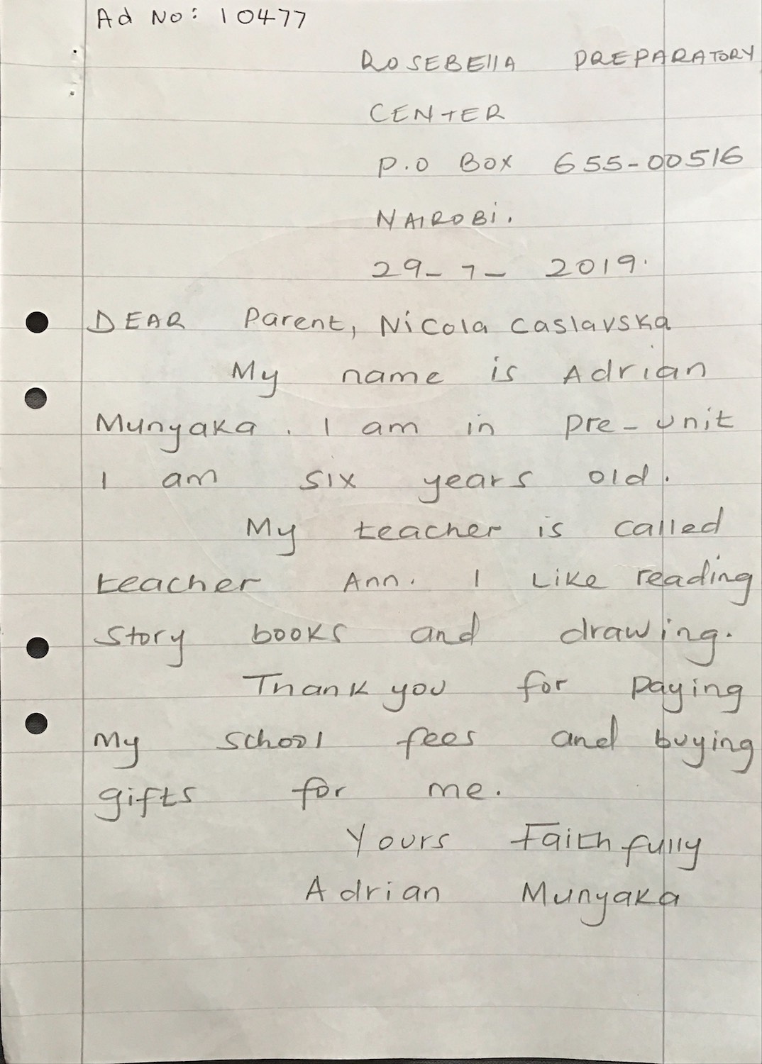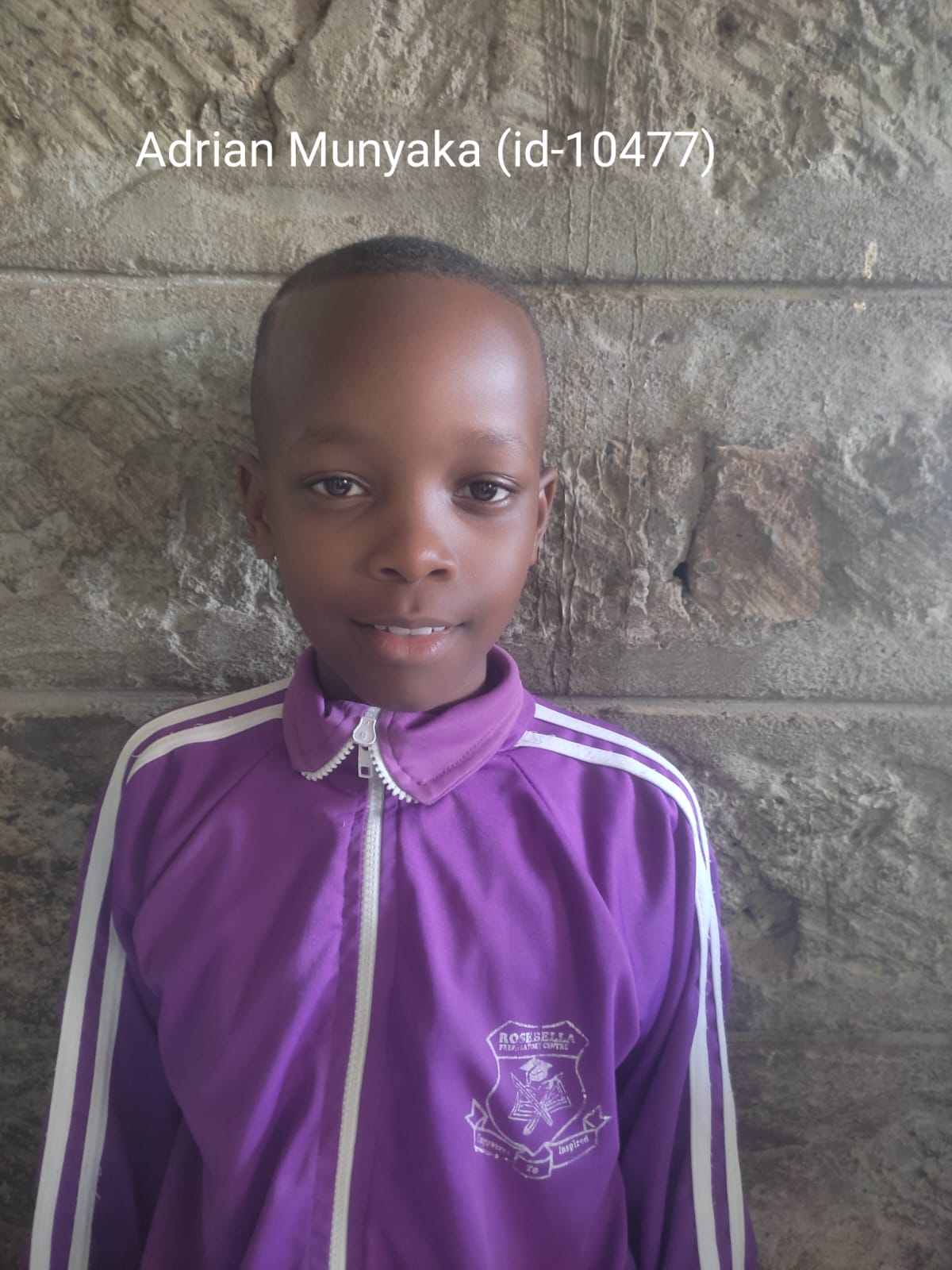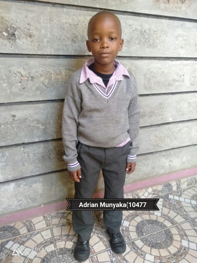 Adrian Munyaka byl adoptován v roce 2016 a dnes navštěvuje 1. třídu ve škole Rosebella Preparatory Academy.