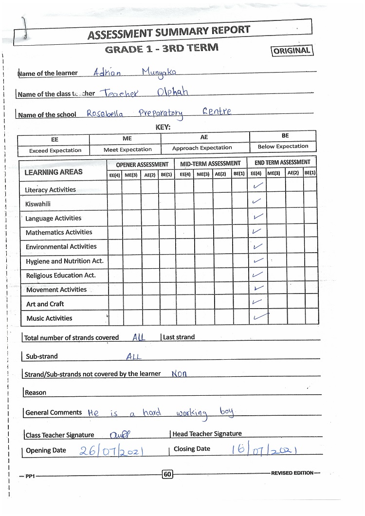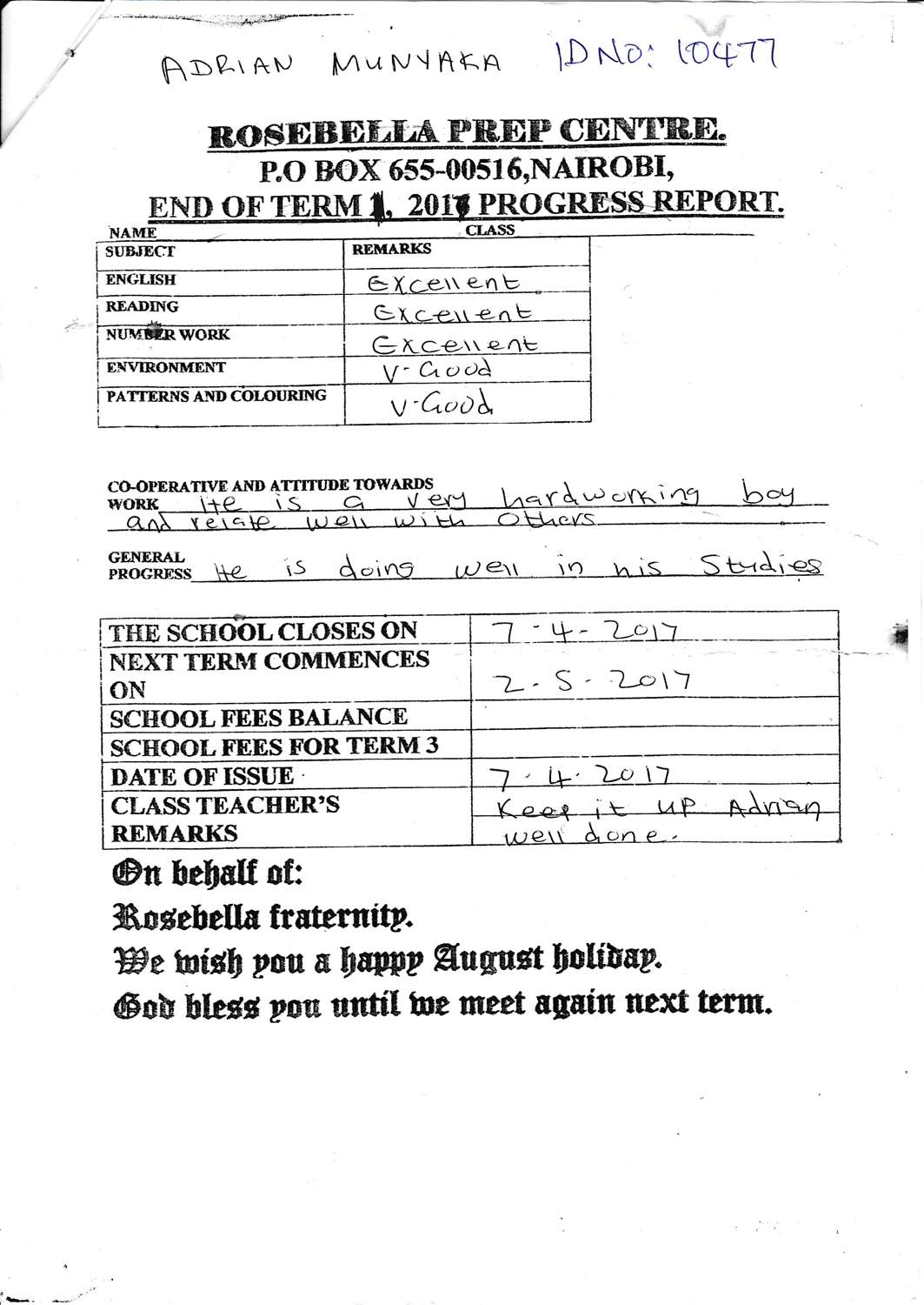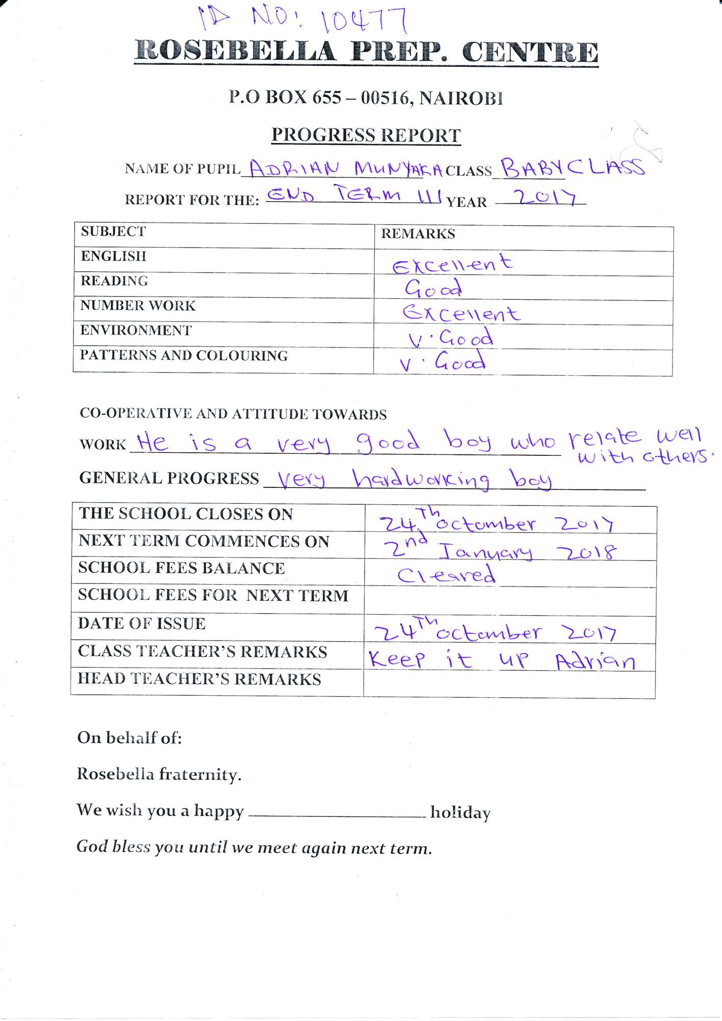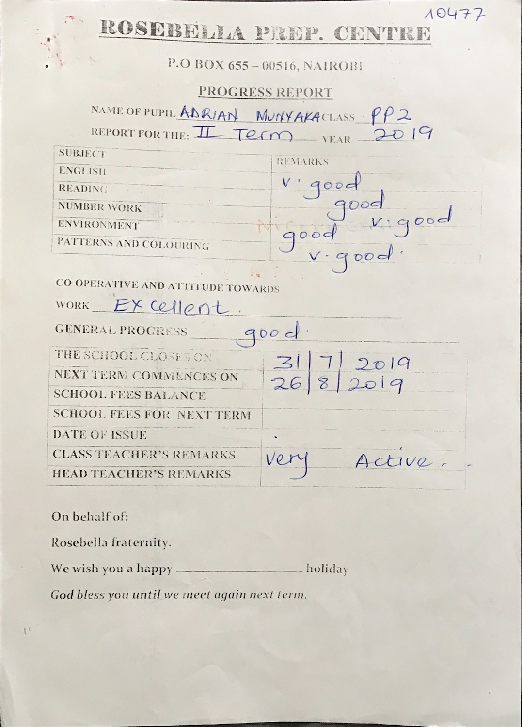Adrian Munyaka byl adoptován v roce 2016 a dnes navštěvuje 1. třídu ve škole Rosebella Preparatory Academy.