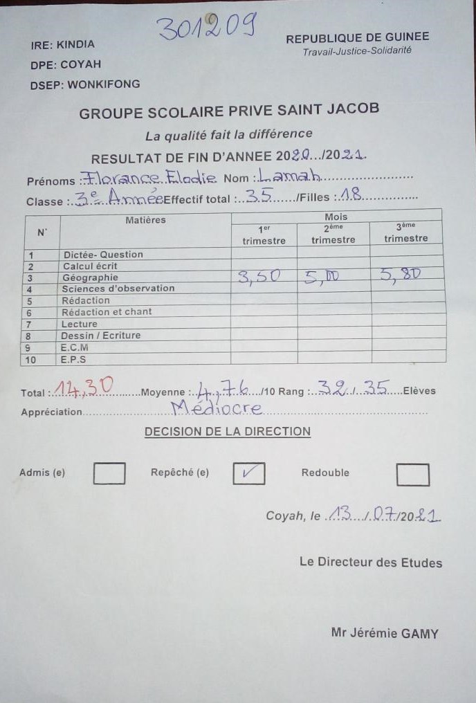 Aby mohlo adoptované dítko začít chodit do školy, musí být uhrazeny peníze za školné alespoň měsíc předem. Tím máme dostatek času zajistit převod peněz do Guineje a vyřídit všechny formality. Konkrétně to tedy znamená, že vždy do konce srpna, listopadu a února musí být na našem účtu 2500 Kč na uhrazení školného na nově začínající trimestr. Adoptivní rodič může platit třikrát ročně nebo jednorázově na celý rok a záleží to čistě na jeho rozhodnutí a možnostech.