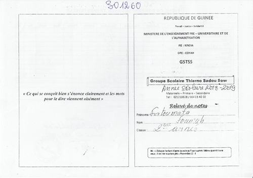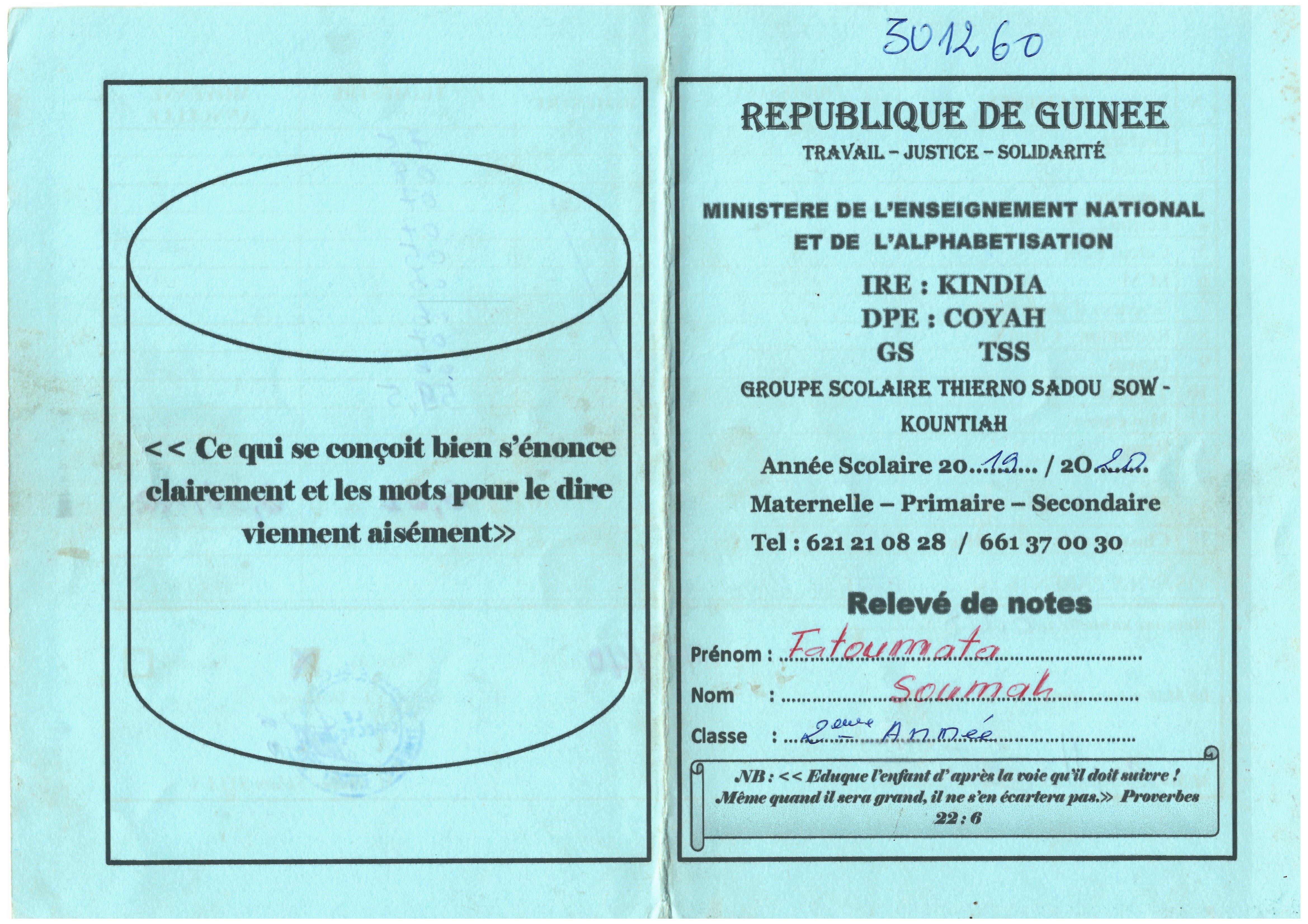 Fatoumata Soumah byla adoptována v roce 2015 a dnes navštěvuje 3. třídu ve škole Thierno S.Sow.