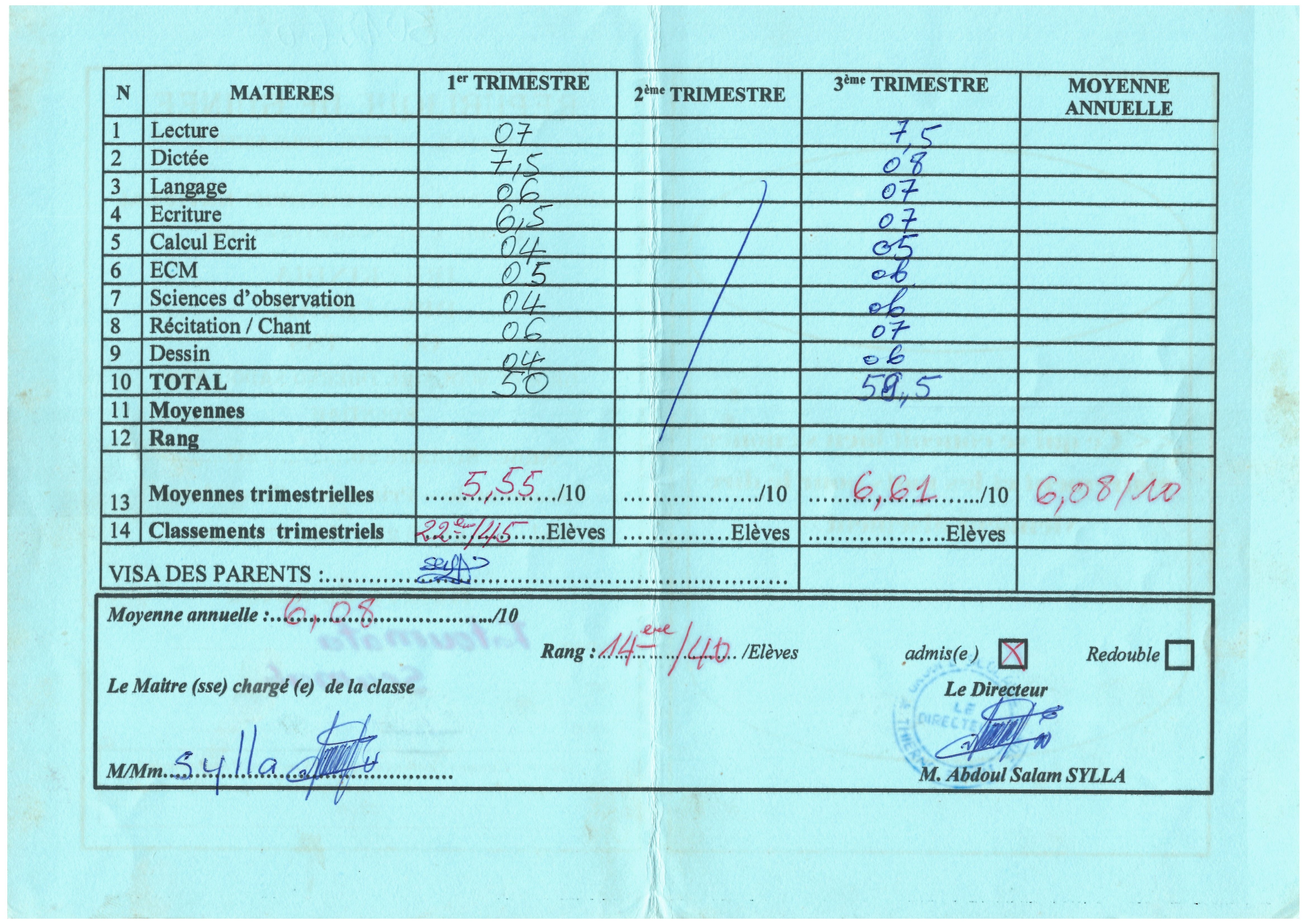 Aby mohlo adoptované dítko začít chodit do školy, musí být uhrazeny peníze za školné alespoň měsíc předem. Tím máme dostatek času zajistit převod peněz do Guineje a vyřídit všechny formality. Konkrétně to tedy znamená, že vždy do konce srpna, listopadu a února musí být na našem účtu 2500 Kč na uhrazení školného na nově začínající trimestr. Adoptivní rodič může platit třikrát ročně nebo jednorázově na celý rok a záleží to čistě na jeho rozhodnutí a možnostech.