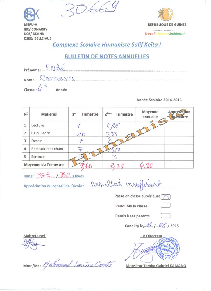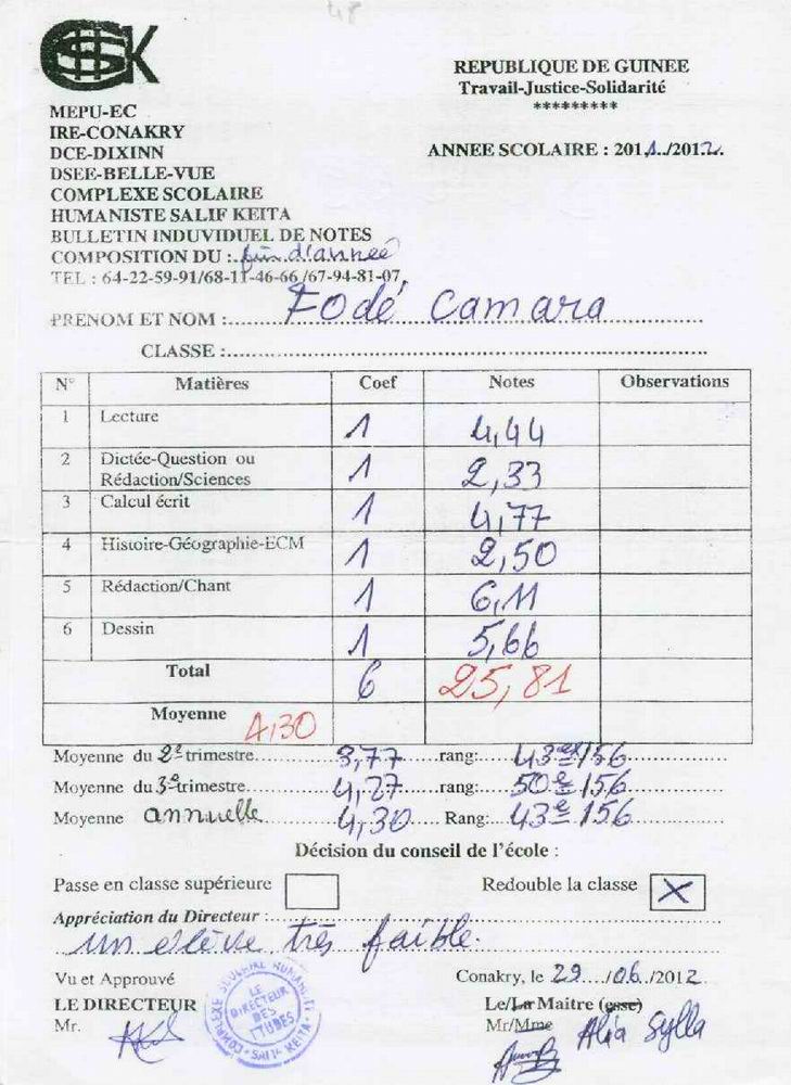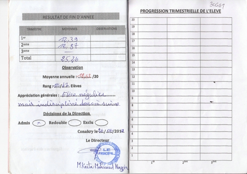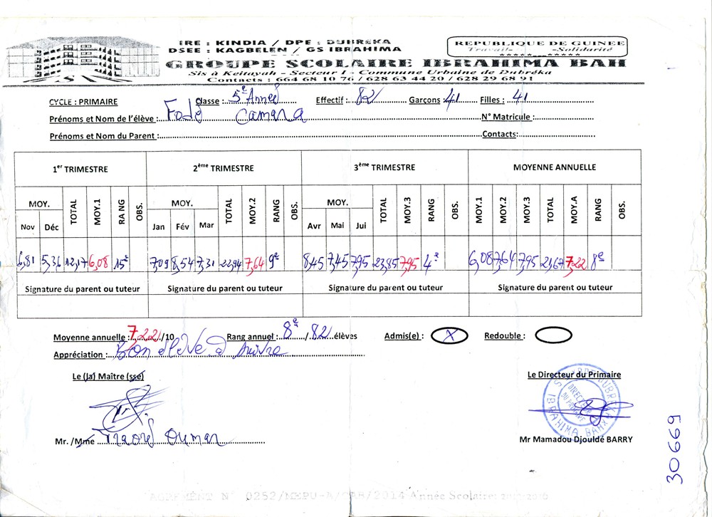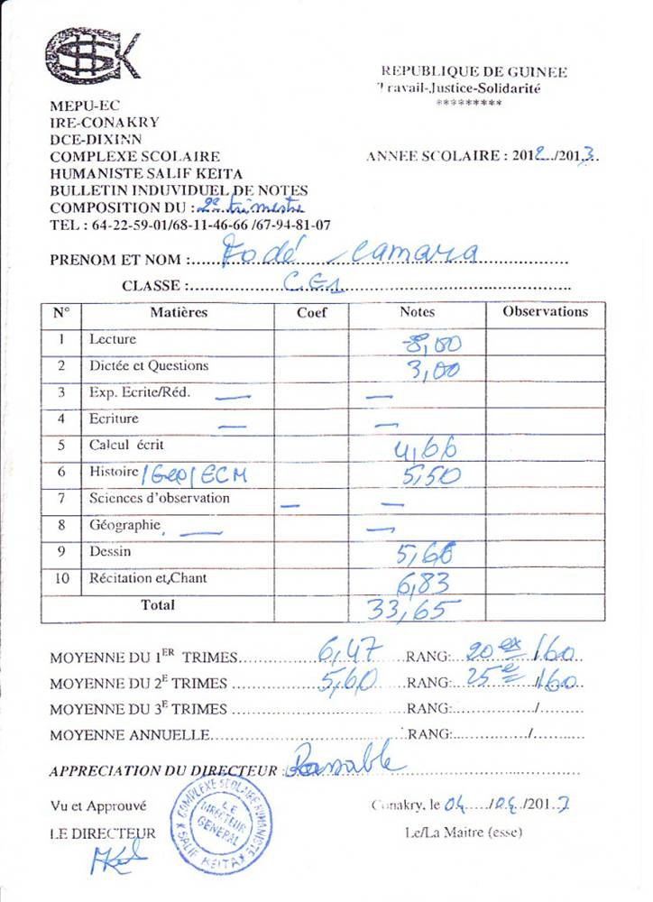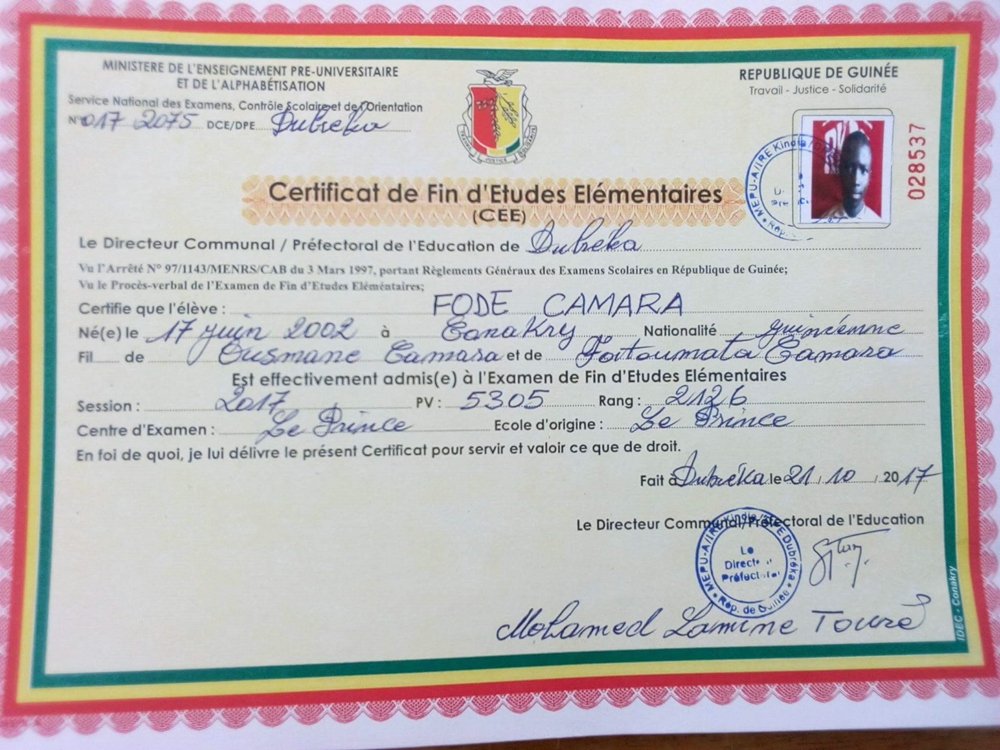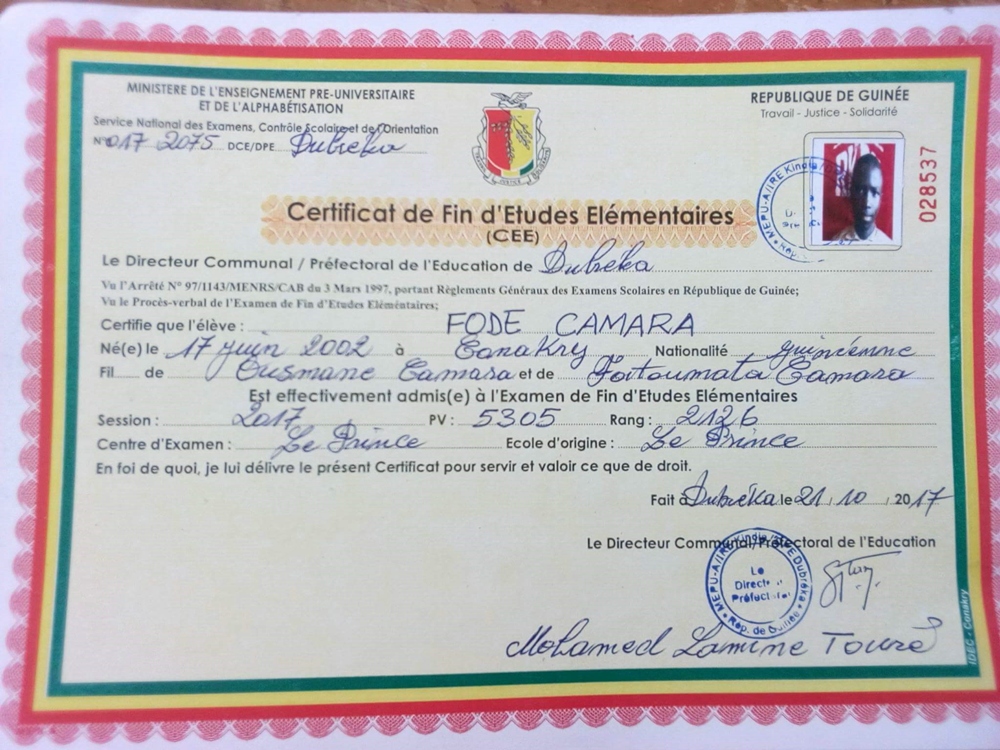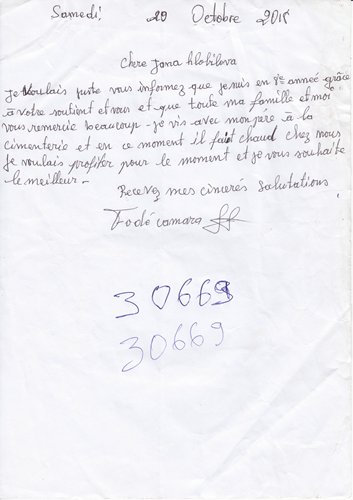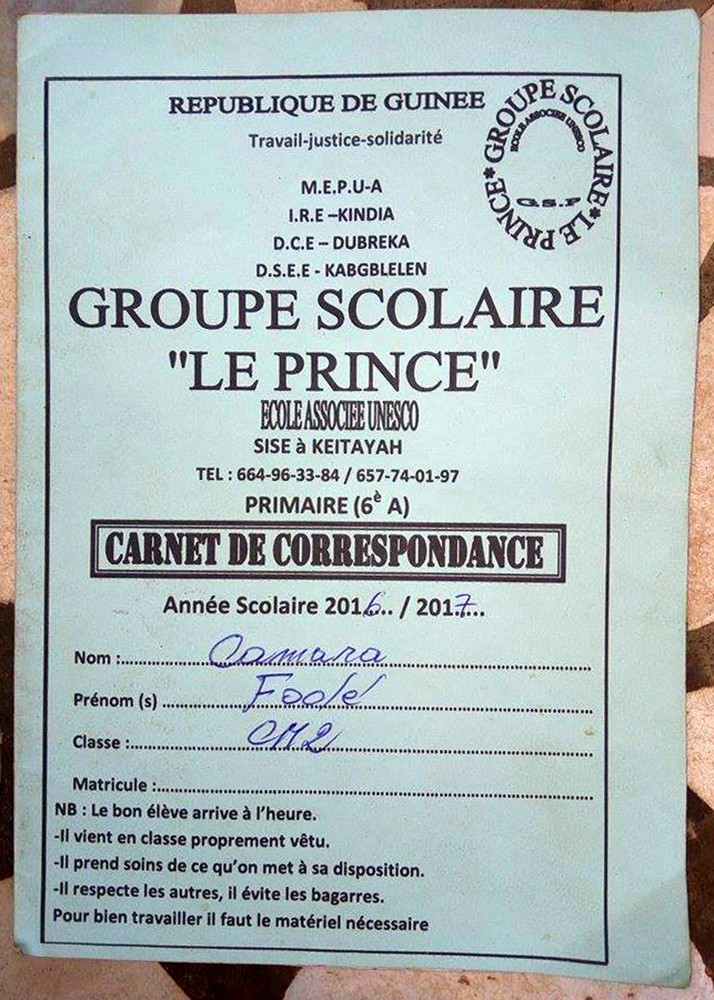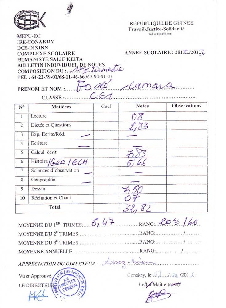 Fodé Camara byl adoptován v roce 2005 a dnes navštěvuje 1. ročník střední školy ve škole G.S.Salif Keita.