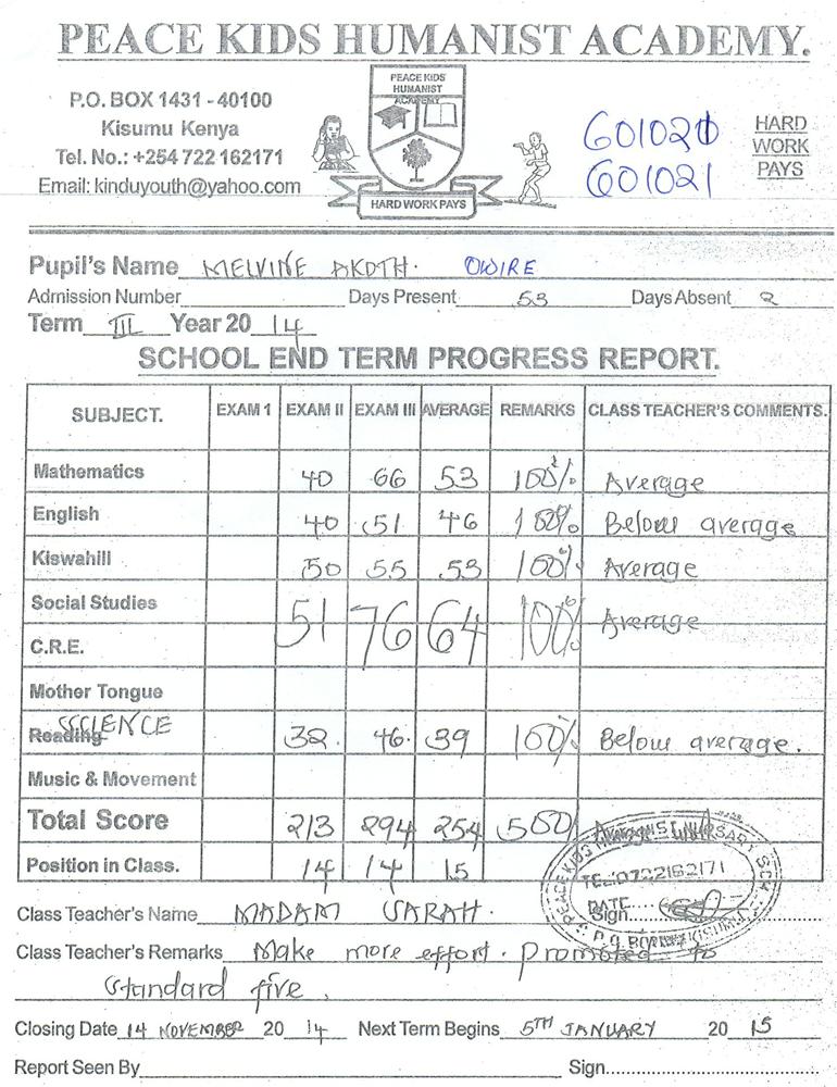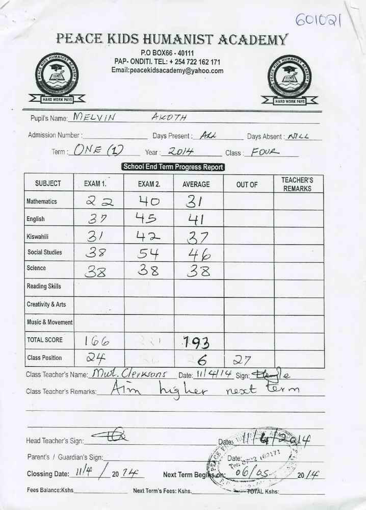 Melvine Akoth Owire byla adoptována v roce 2007 a dnes navštěvuje 1. ročník střední školy ve škole Sangoro Primary School.