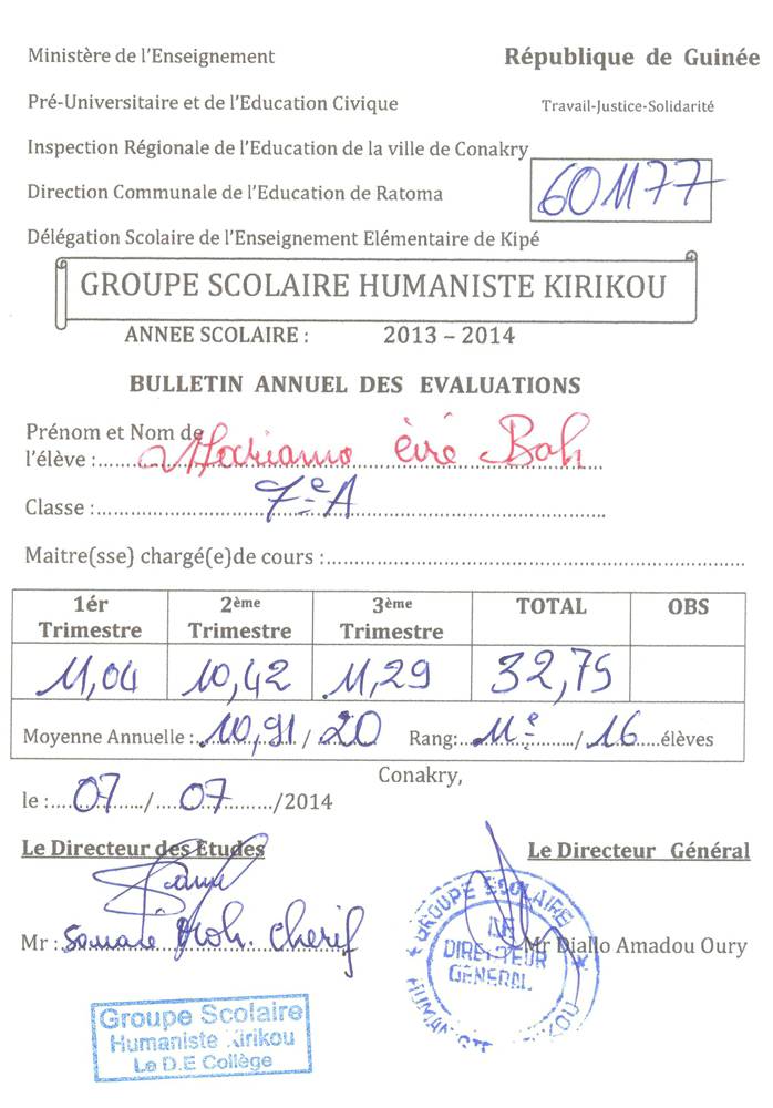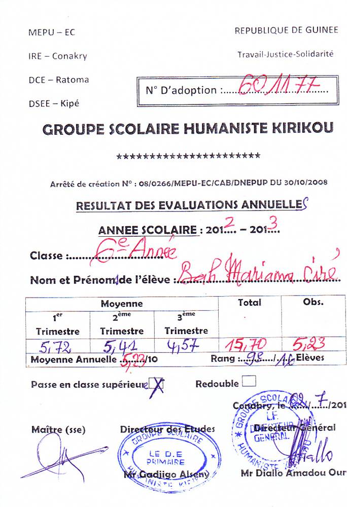 Aby mohlo adoptované dítko začít chodit do školy, musí být uhrazeny peníze za školné alespoň měsíc předem. Tím máme dostatek času zajistit převod peněz do Guineje a vyřídit všechny formality. Konkrétně to tedy znamená, že vždy do konce srpna, listopadu a února musí být na našem účtu 2500 Kč na uhrazení školného na nově začínající trimestr. Adoptivní rodič může platit třikrát ročně nebo jednorázově na celý rok a záleží to čistě na jeho rozhodnutí a možnostech.