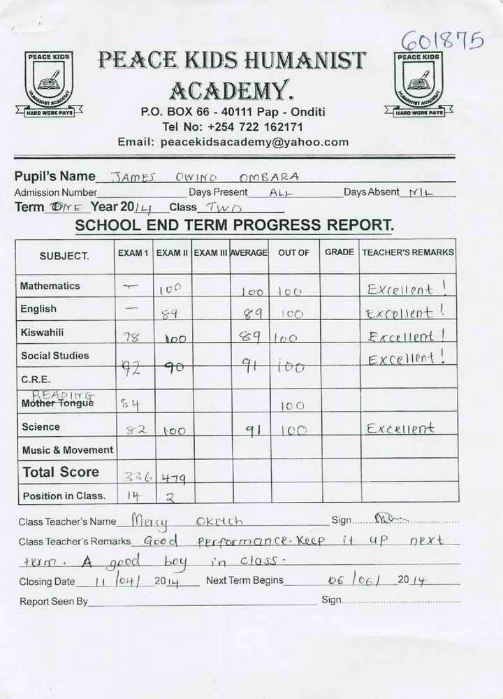 James Owino Ombara byl adoptován v roce 2009 a dnes navštěvuje 7. třídu ve škole Peace Kids Humanist School.