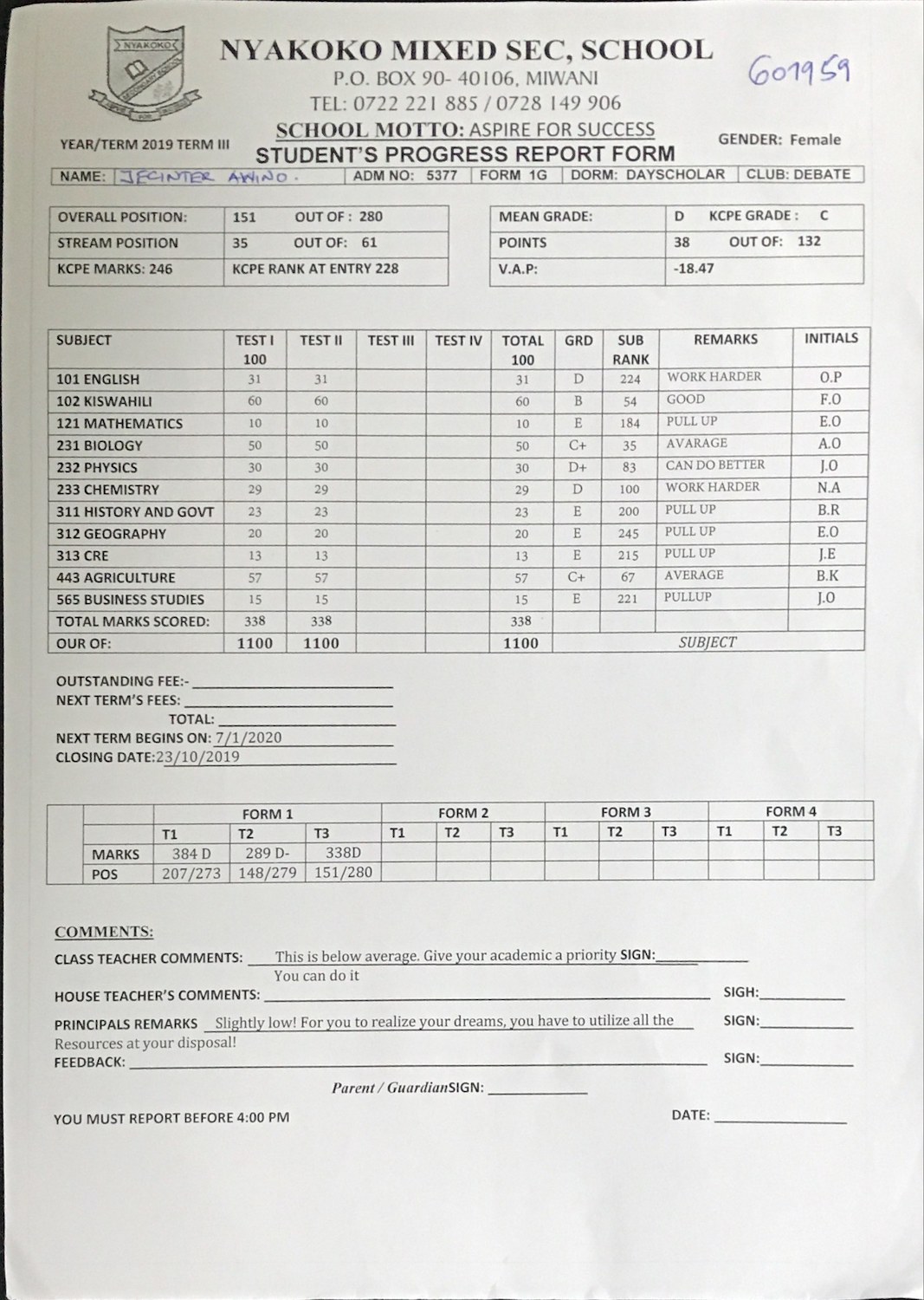 Jecinter Awino byla adoptována v roce 2008 a dnes navštěvuje 2. ročník střední školy ve škole Joy Kids Humanist School.