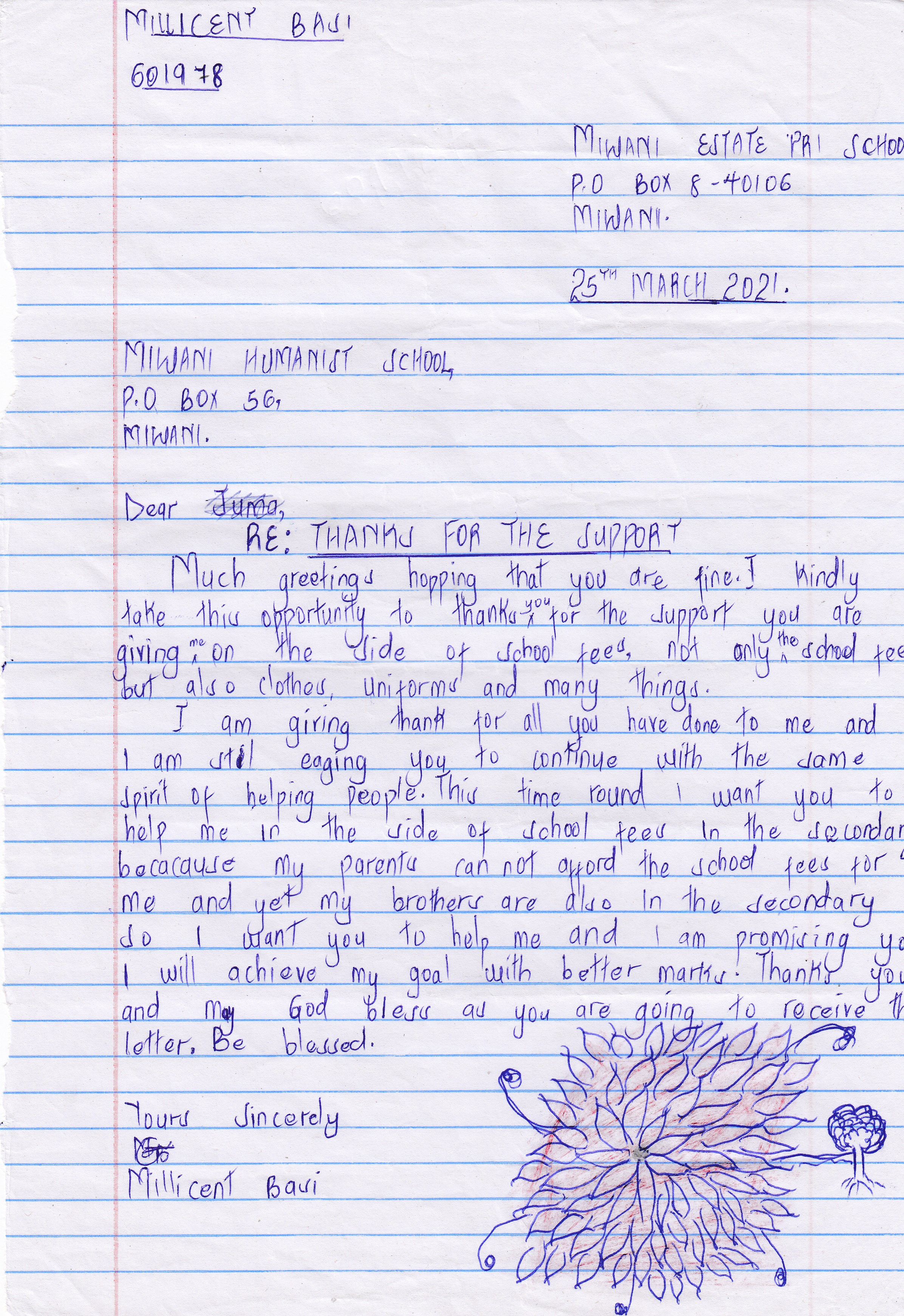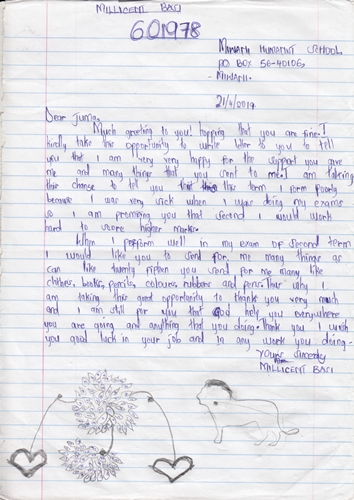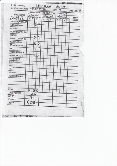 Popis situace: Dívenka pochází z velice chudé rodiny. Její rodiče pracují v zemědělství. Nemají však dost velký příjem na to, aby mohli dívence umožnit chodit do školy. Díky podpoře adoptivního rodiče může Millicent chodit pravidelně do školy.