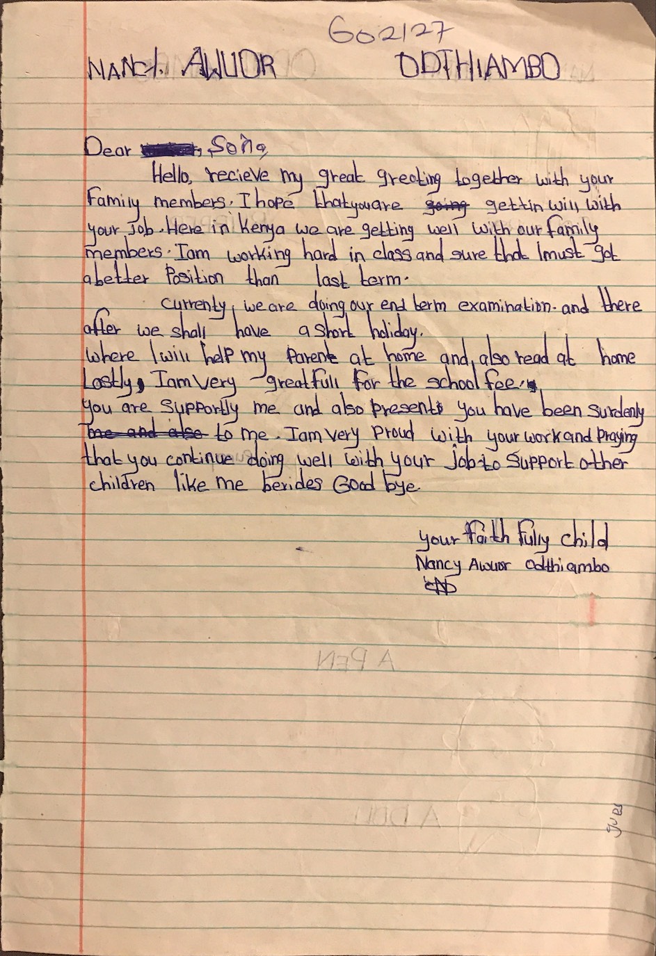 Nancy Awuor Odhiambo byla adoptována v roce 2015 a dnes navštěvuje 5. třídu ve škole Peace Kids Humanist School.