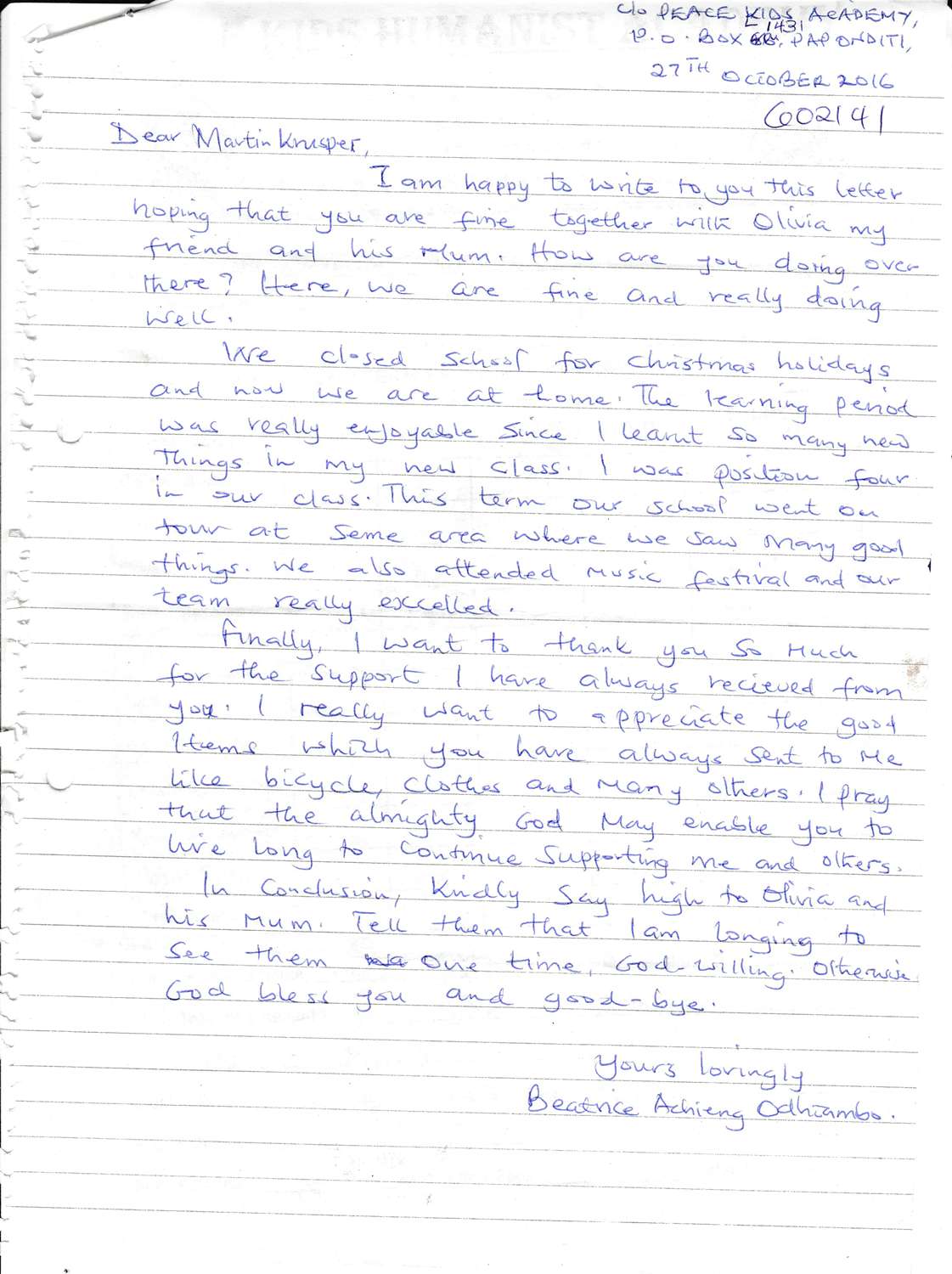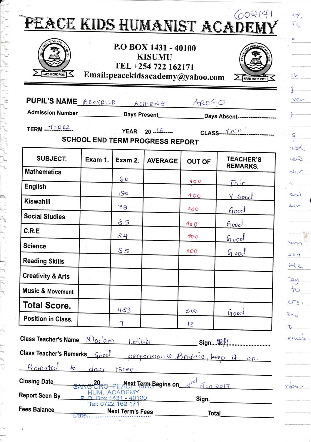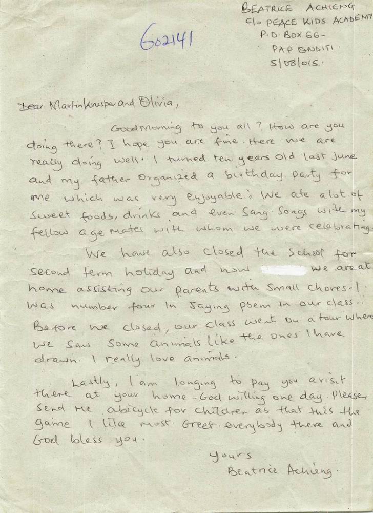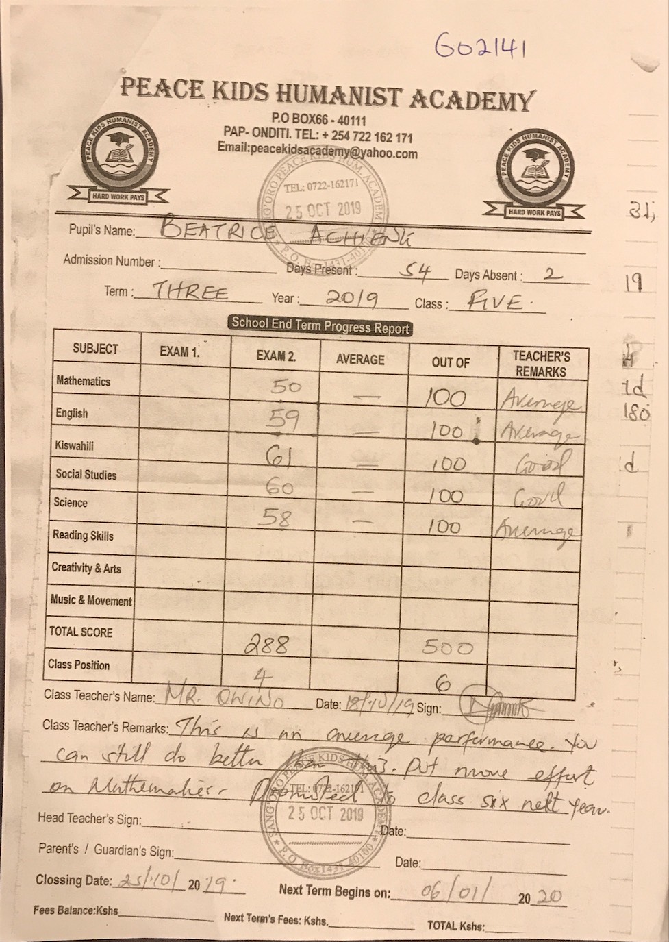 Beatrice Achieng Arogo byla adoptována v roce 2013 a dnes navštěvuje 6. třídu ve škole Peace Kids Humanist School.