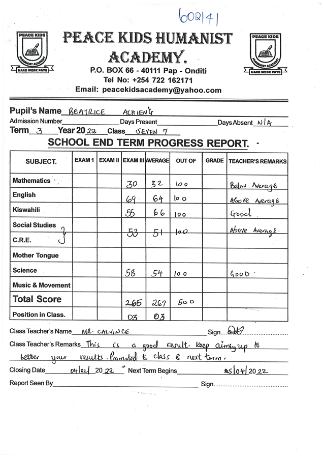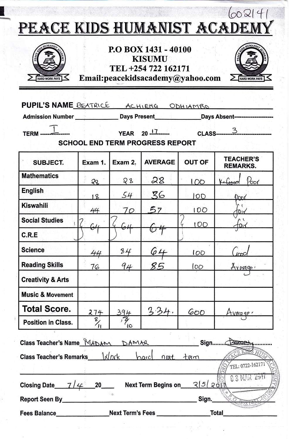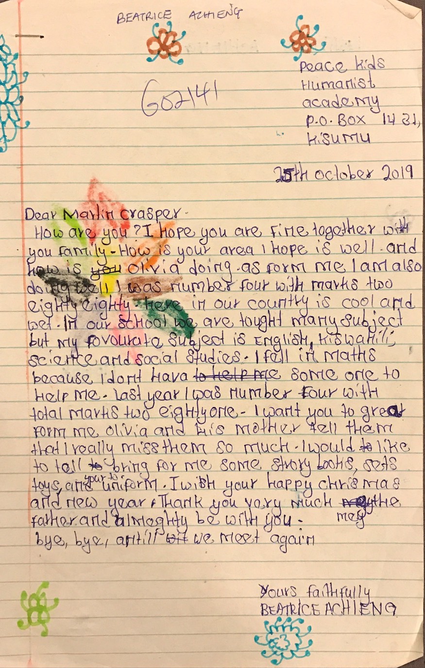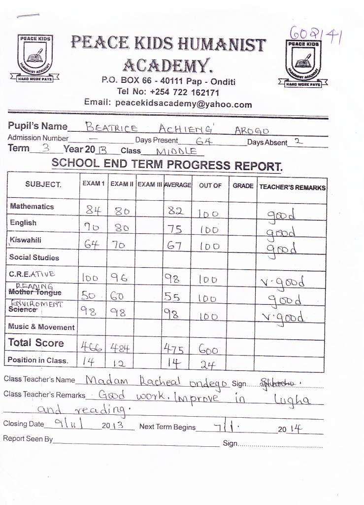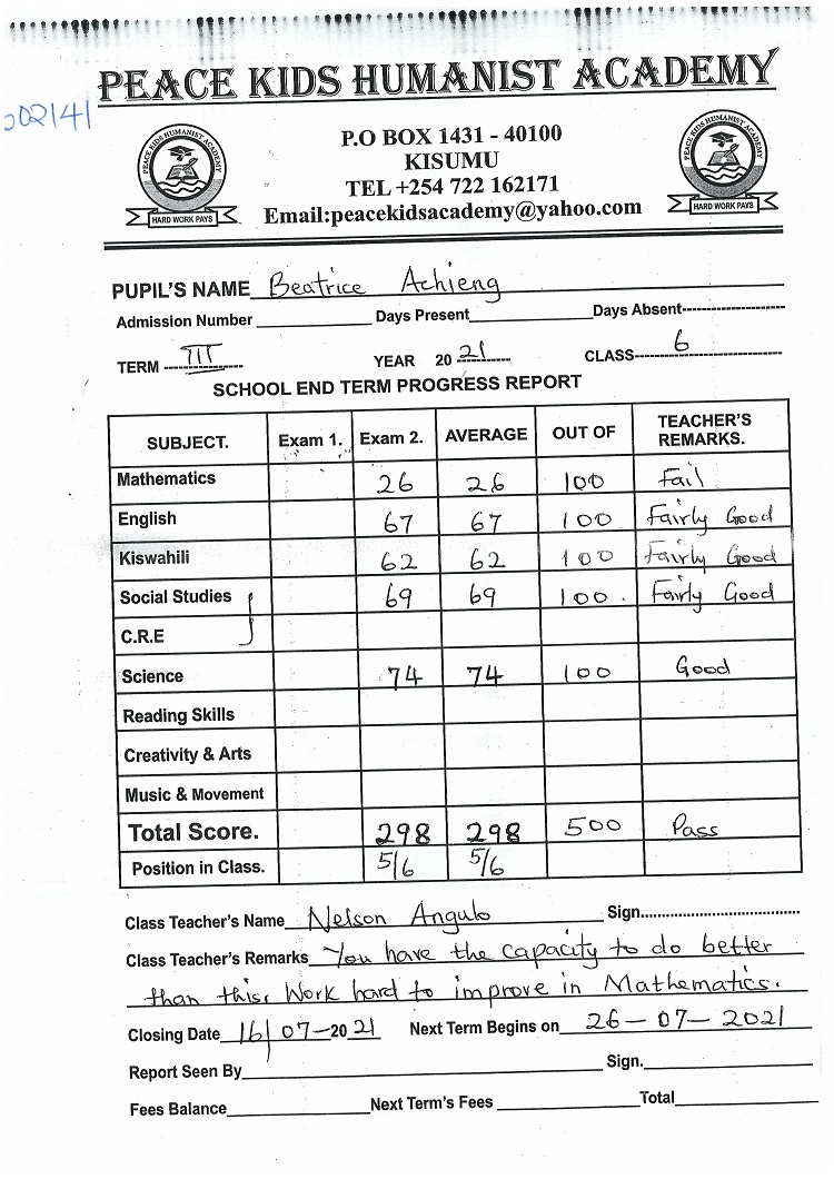 Beatrice Achieng Arogo byla adoptována v roce 2013 a dnes navštěvuje 6. třídu ve škole Peace Kids Humanist School.