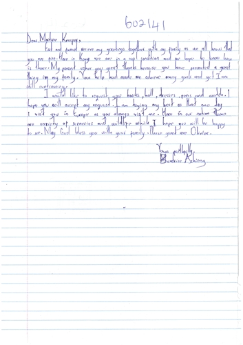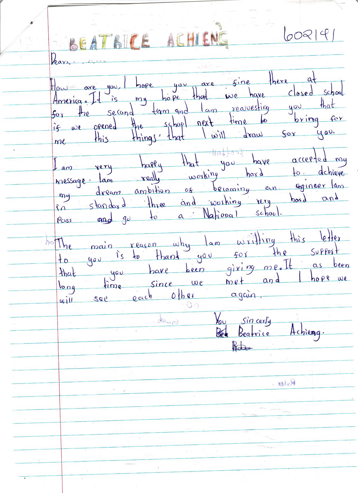 Popis situace: Beatrice pochází z velice chudé farmřské rodiny. Její rodina má 6 členů. Drobné farmaření jim nevydělává dostatek peněz na to, aby rodiče Beatrice mohli dívce platit školu. Díky podpoře adoptivního rodiče ale Beatrice do školy chodí.