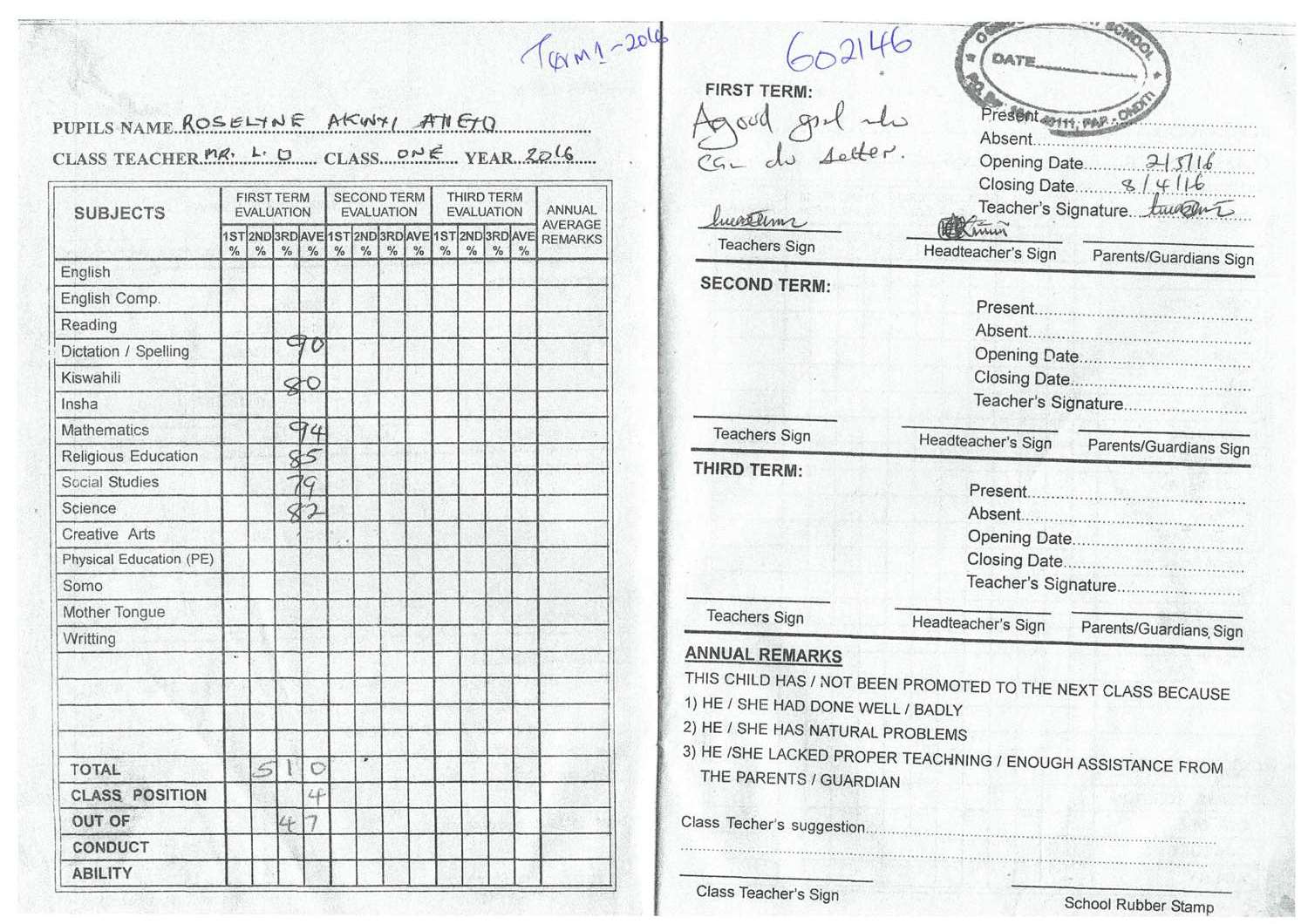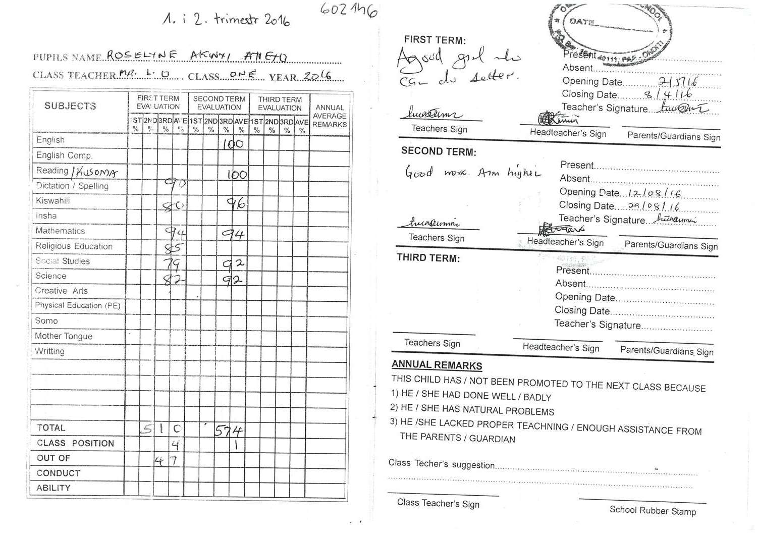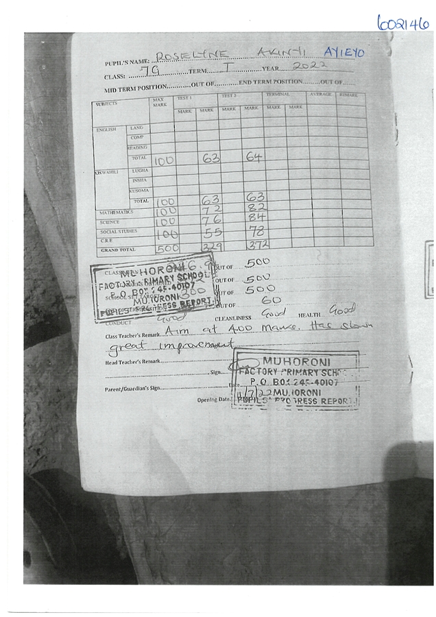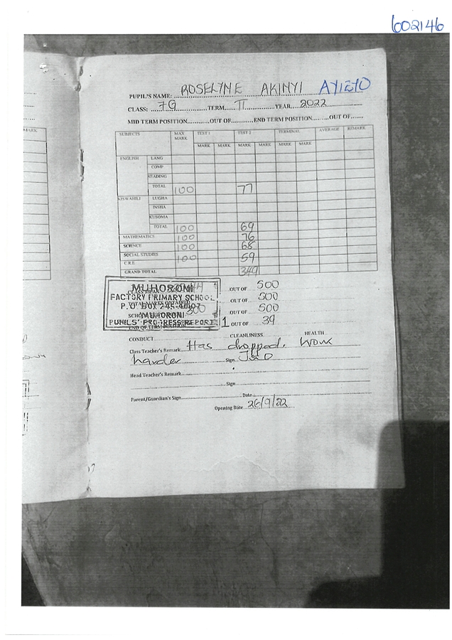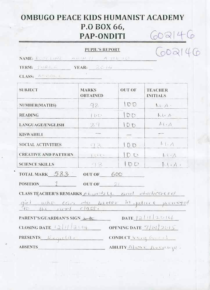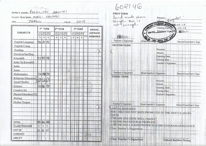 Roseline Akinyi Ayieyo byla adoptována v roce 2014 a dnes navštěvuje 4. třídu ve škole Ombugo Primary School.