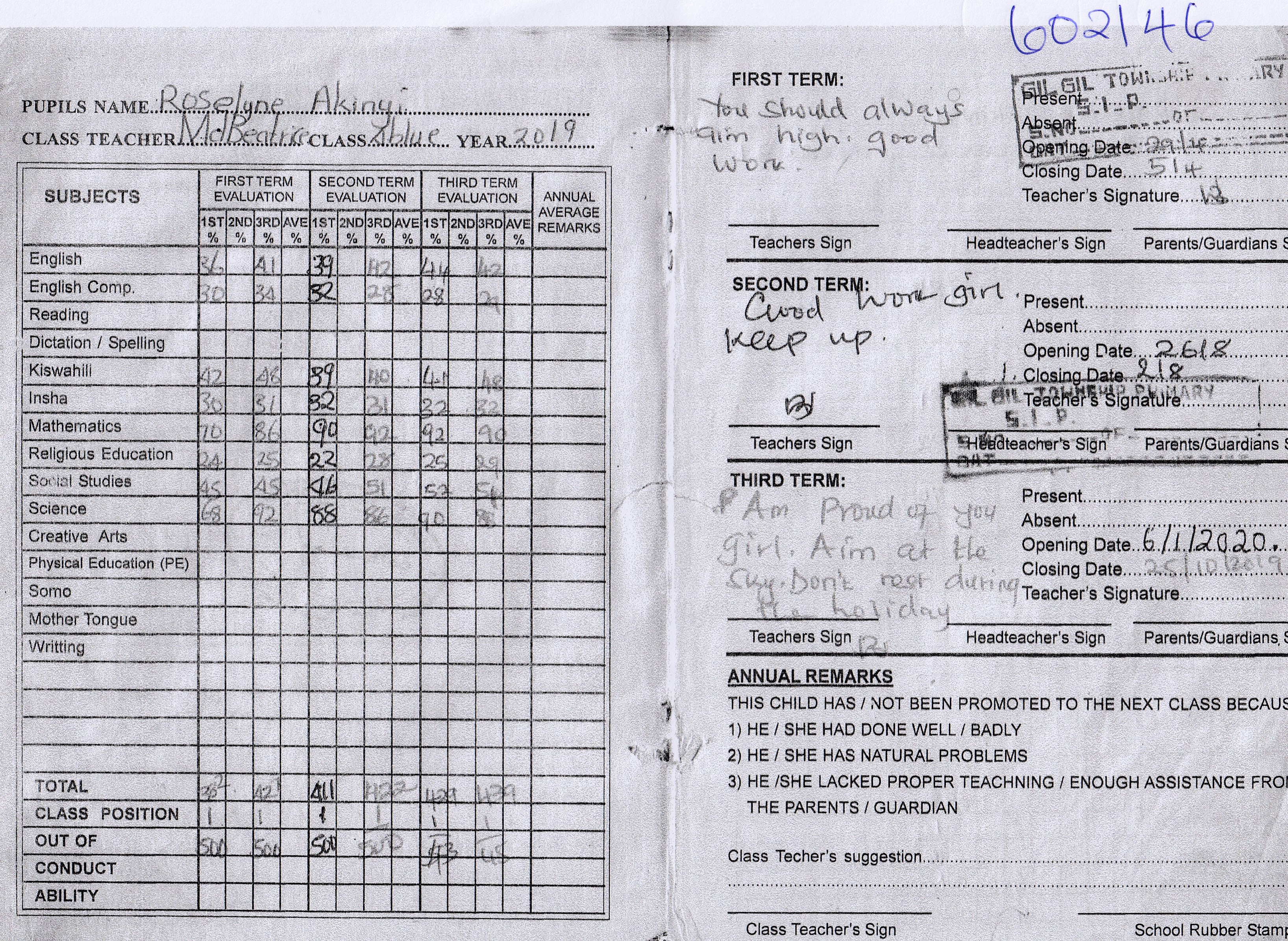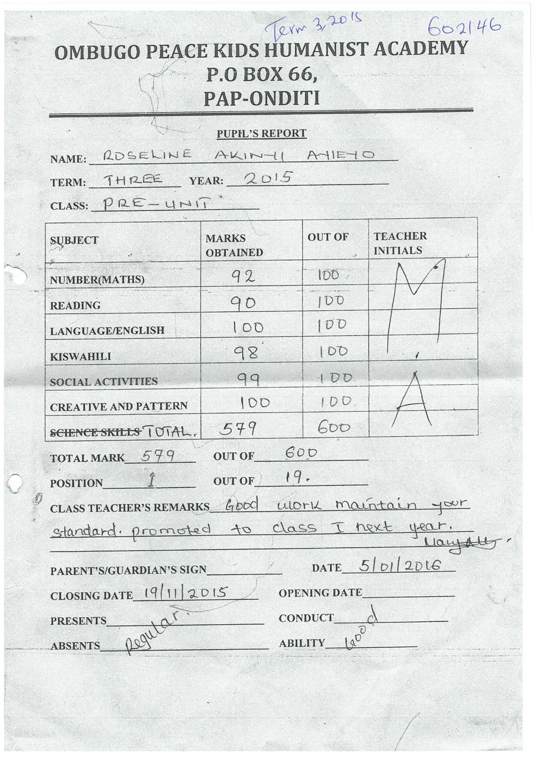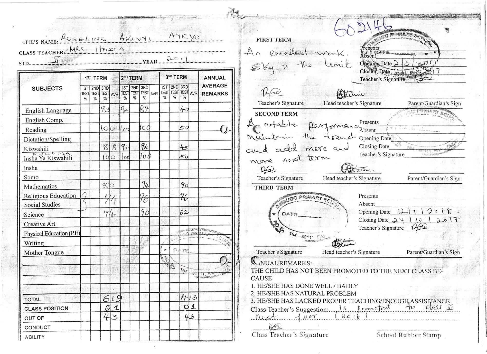 Roseline Akinyi Ayieyo byla adoptována v roce 2014 a dnes navštěvuje 4. třídu ve škole Ombugo Primary School.