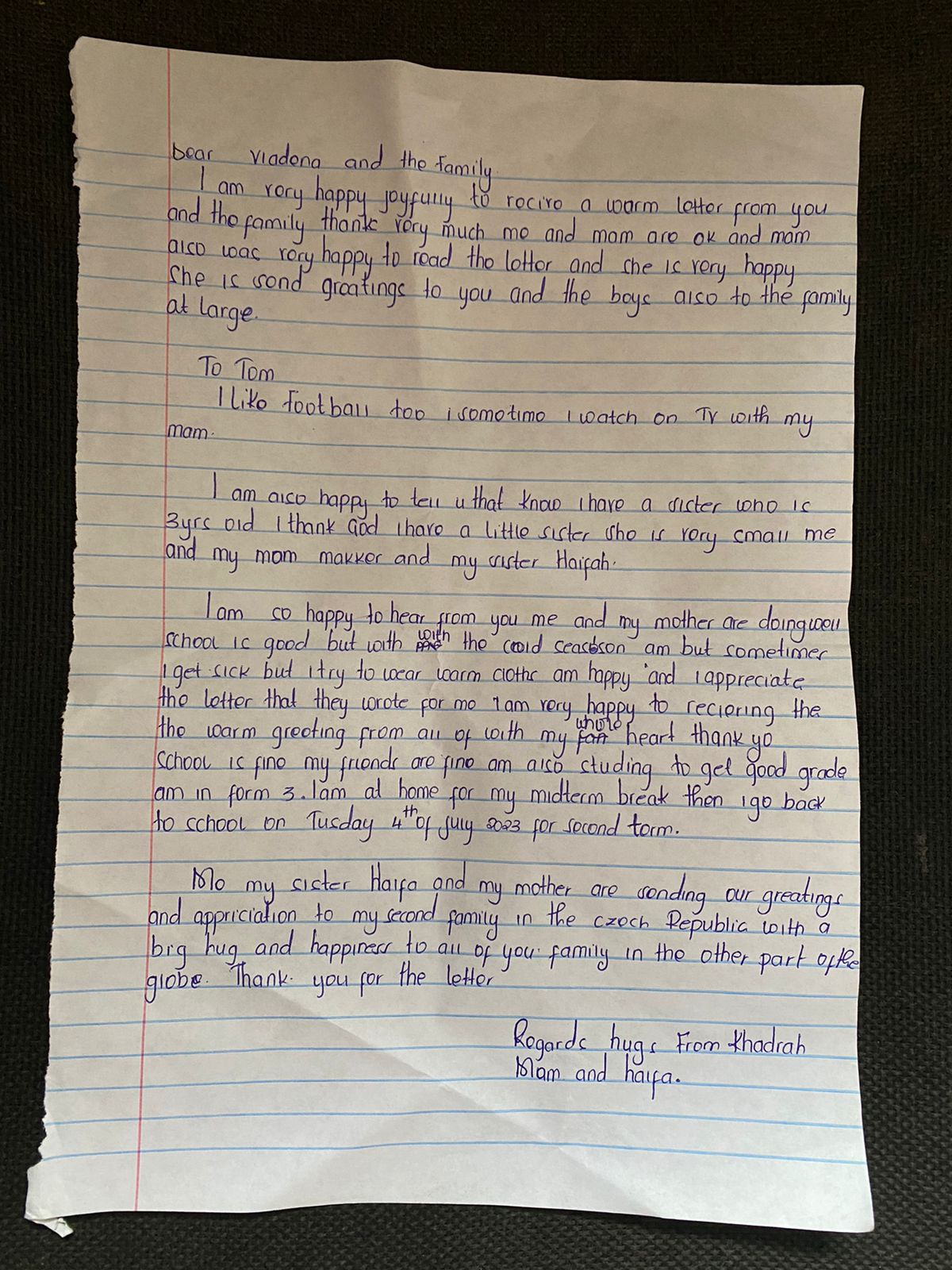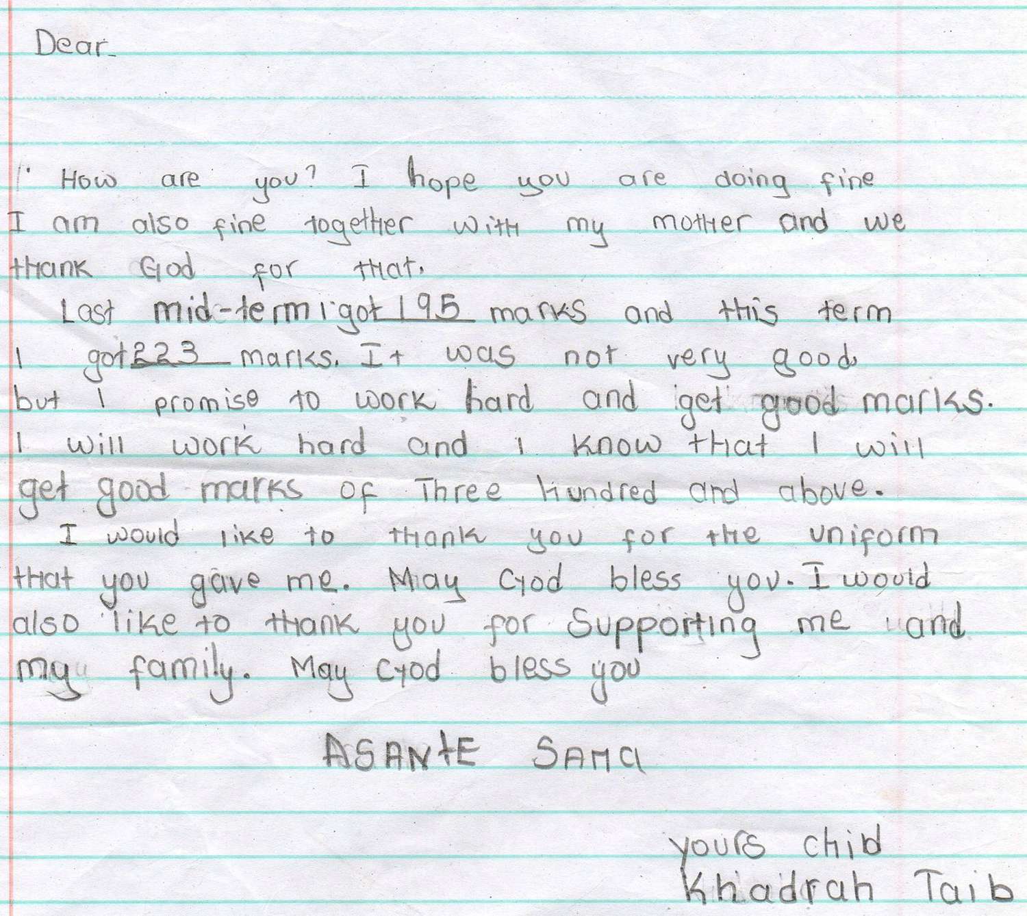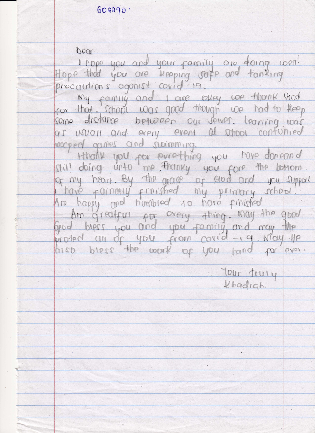 Popis situace: Khadara žije pouze se svou matkou. Matka má příjem z prodeje zboží. Tyto příjmy ovšem nepokryjí veškeré výdaje, které rodina má. Khadara by se v budoucnu chtěla stát doktorkou a pomáhat nemocným. Díky podpoře adoptivních rodičů může získat dobré vzdělání a mít šanci na to si svůj sen uskutečnit.